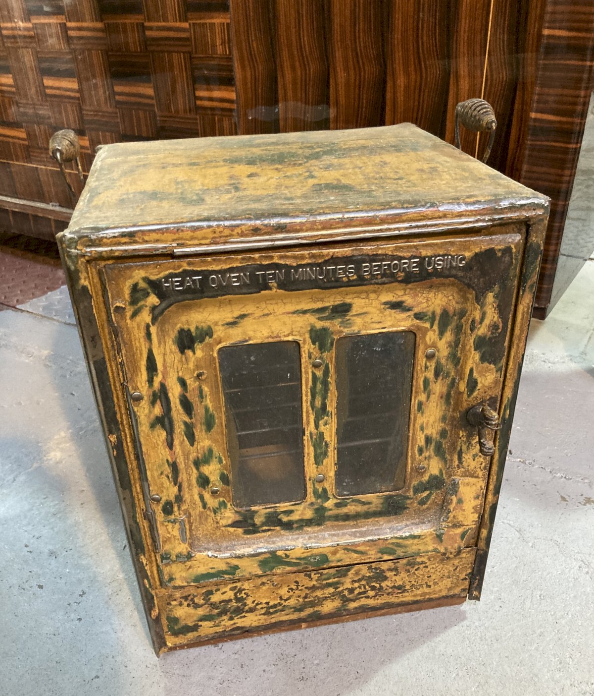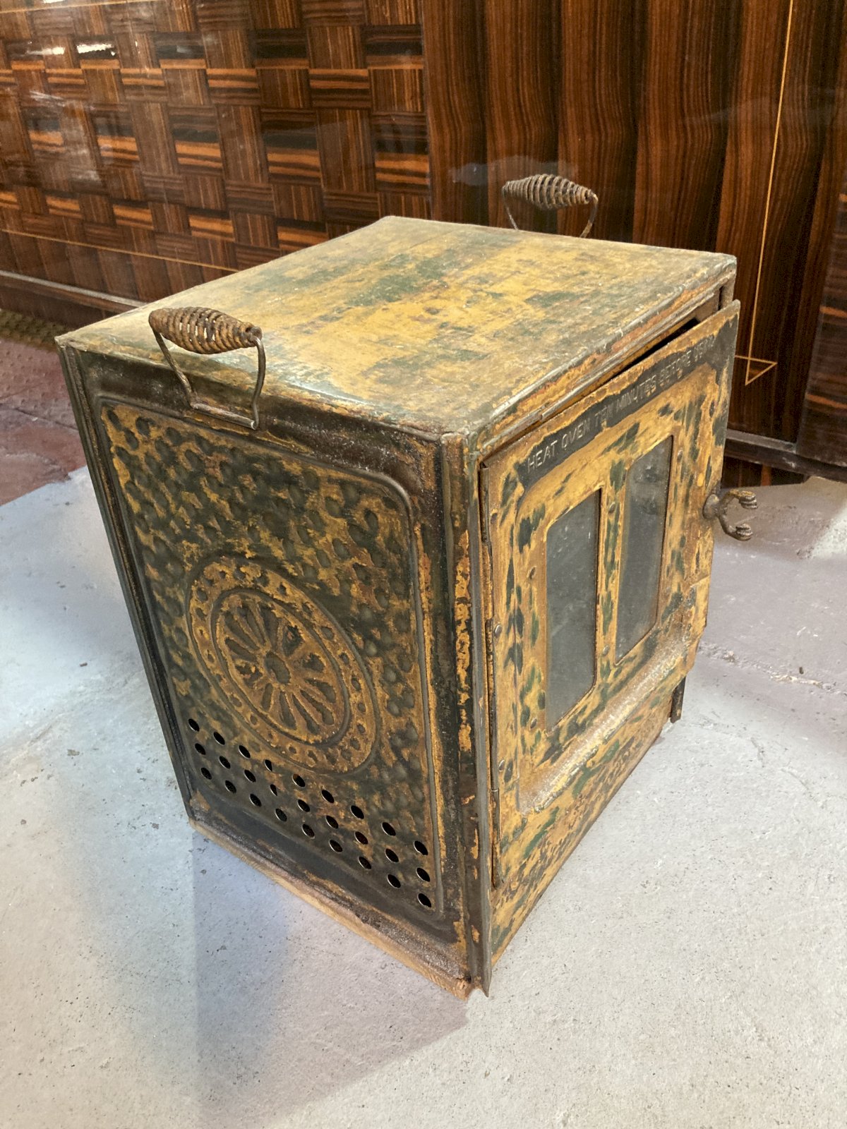 Table de chevet, sur base d'un objet mystérieux: au dessus de la porte, on lit "oven". Extérieur décapé et vernis, intérieur peint en noir, les parties en bois sont neuves. Profondeur 32 x Hauteur 46 x largeur 36. Mesures intérieur P2! x L28 x h37