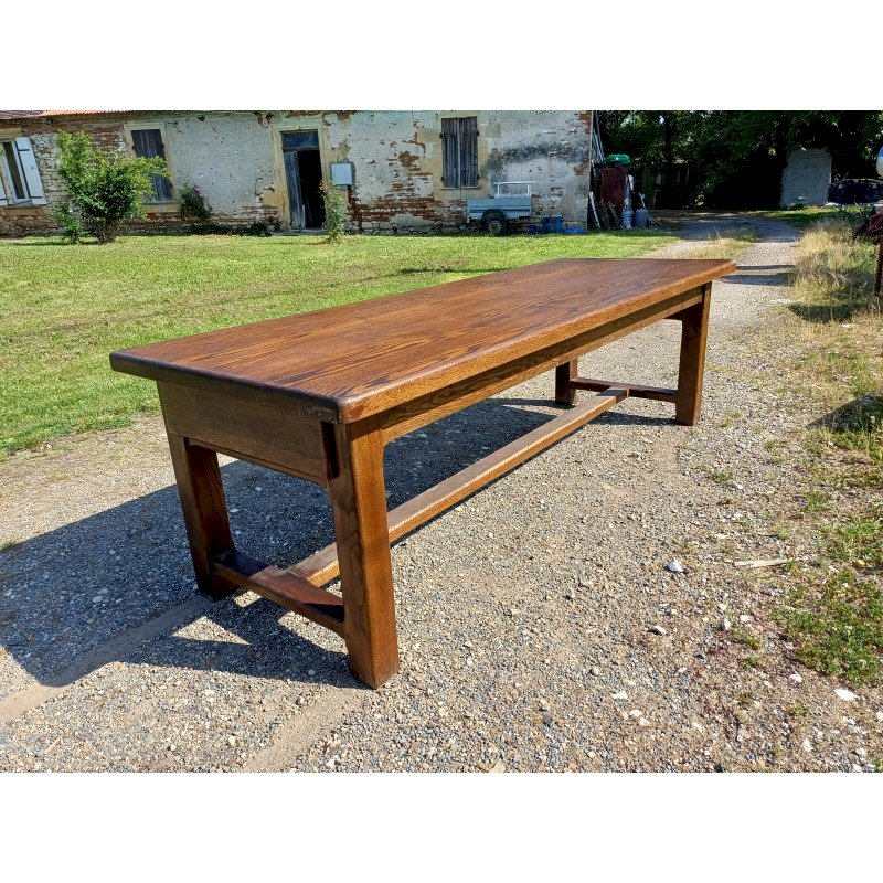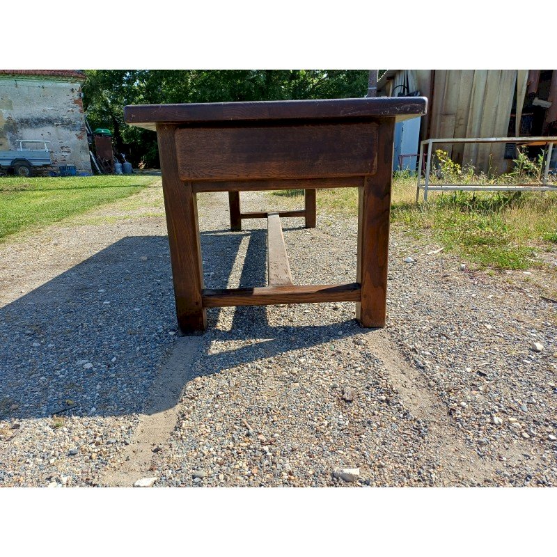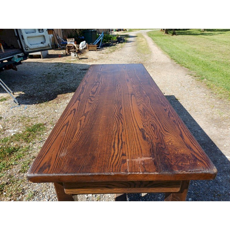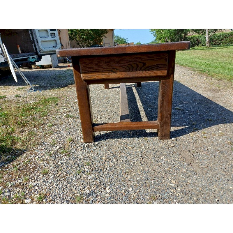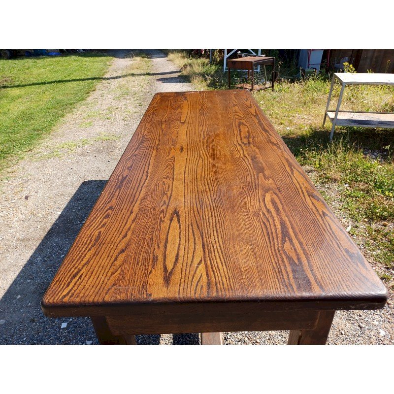 Table de Ferme Campagnarde en Chéne Massif , 2 Tiroirs , Entretoise , épaisseur plateau : 5 cm , pieds : 9 cm , Haut : 78 cm , Haut sous bandeaux : 62 cm , long et larg : 250 cm sur 91 cm , poids : 100 à 150 Kg , trés bon ètat ,