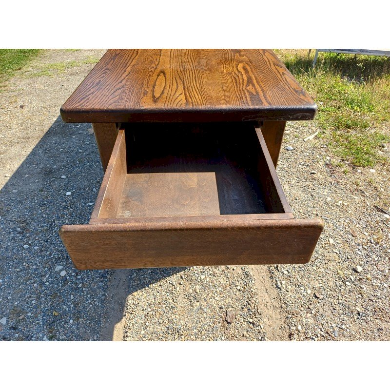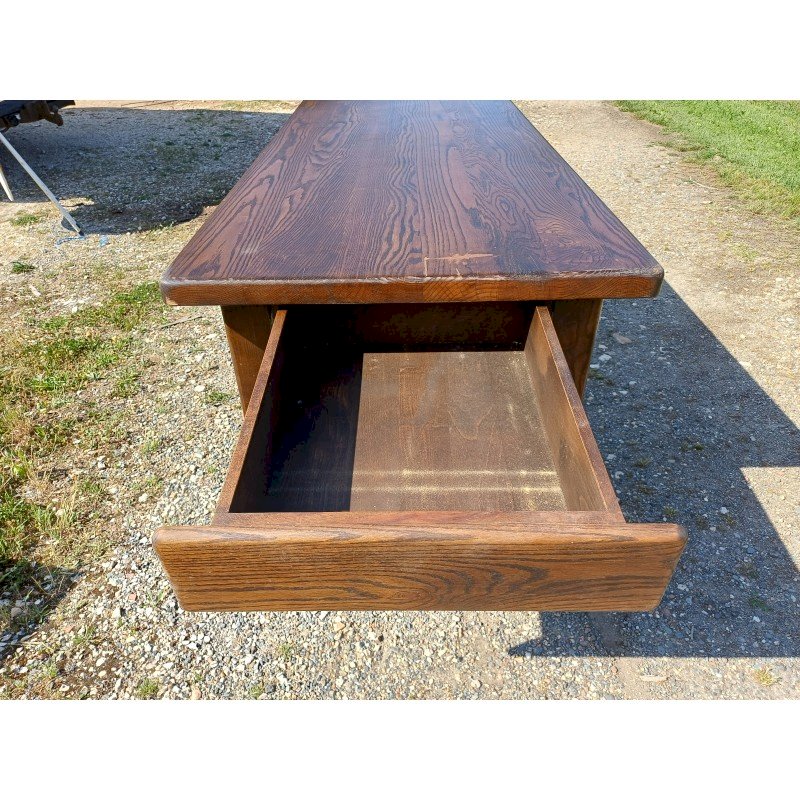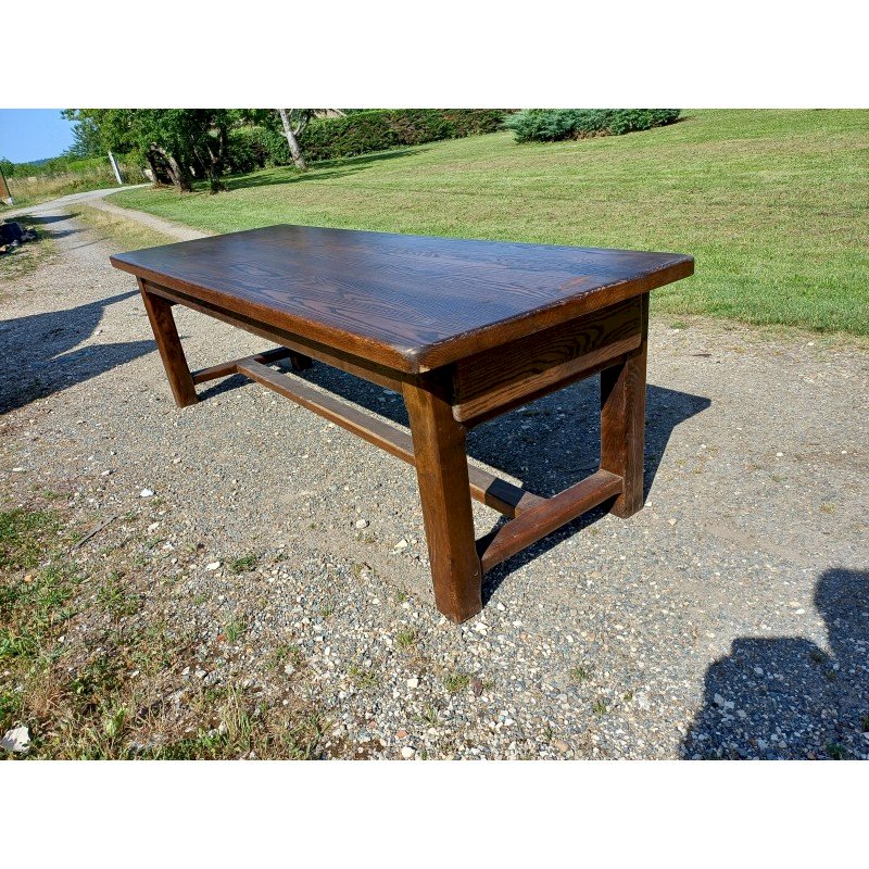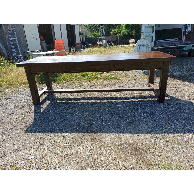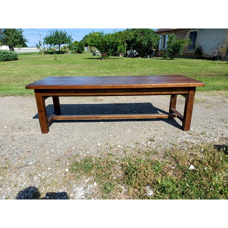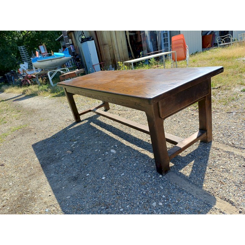 Table de Ferme Campagnarde en Chéne Massif , 2 Tiroirs , Entretoise , épaisseur plateau : 5 cm , pieds : 9 cm , Haut : 78 cm , Haut sous bandeaux : 62 cm , long et larg : 250 cm sur 91 cm , poids : 100 à 150 Kg , trés bon ètat ,