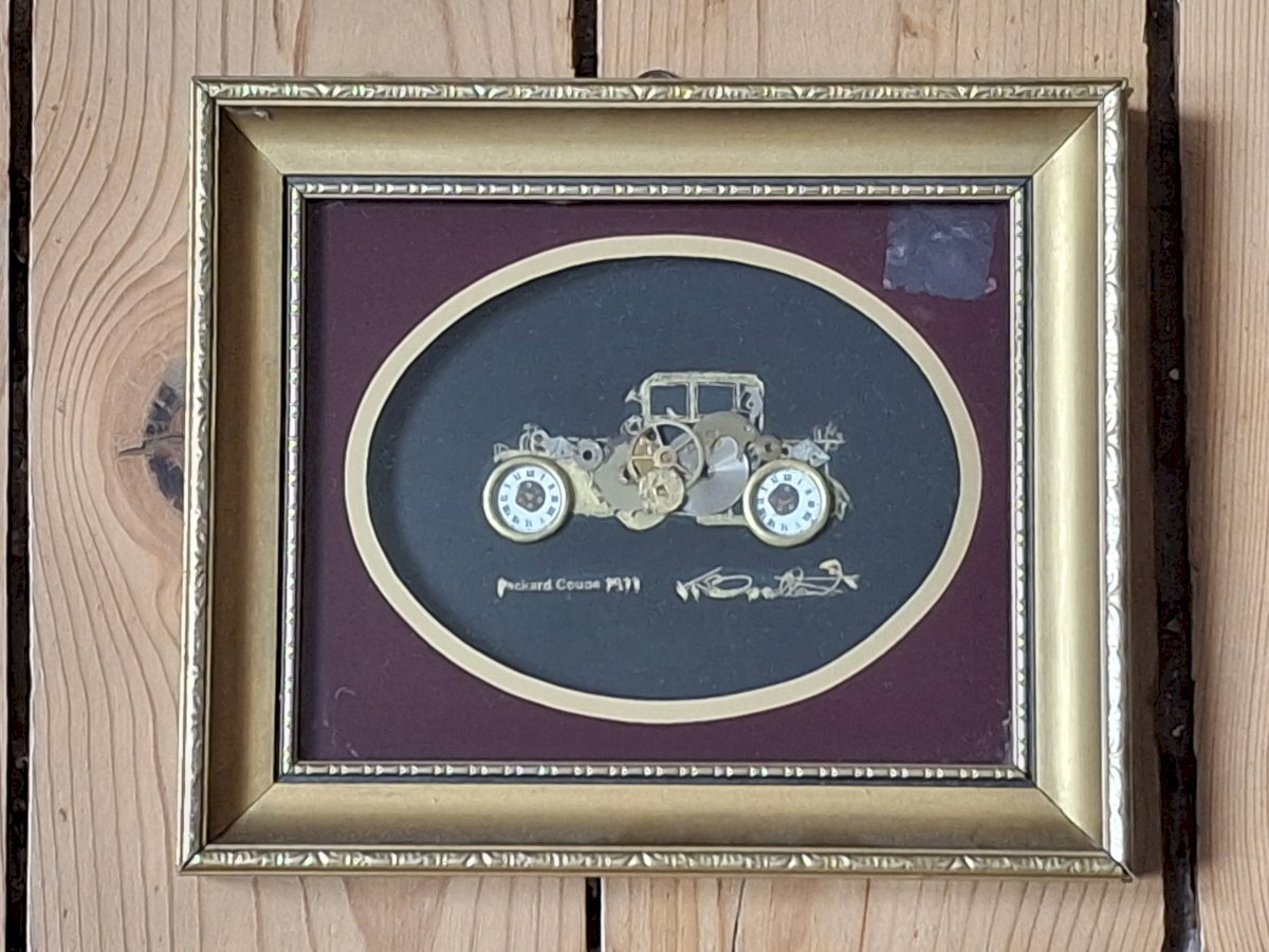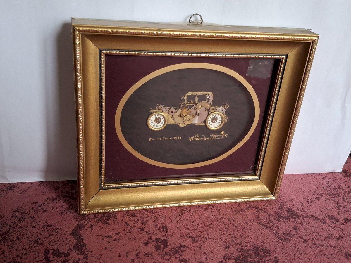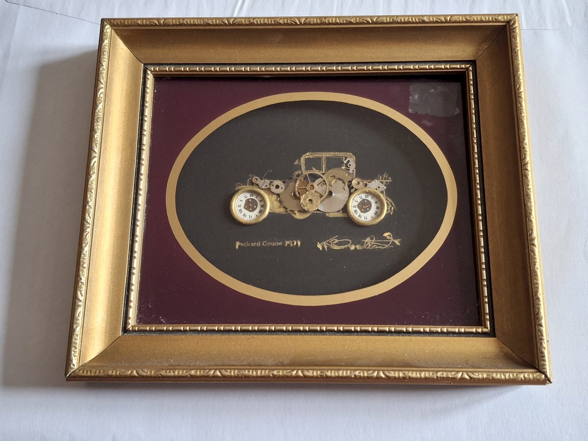 Authentique tableau encadré réalisé par Ken Broadbent avec des pièces d'horlogerie représentant une Packard coupé 1921.