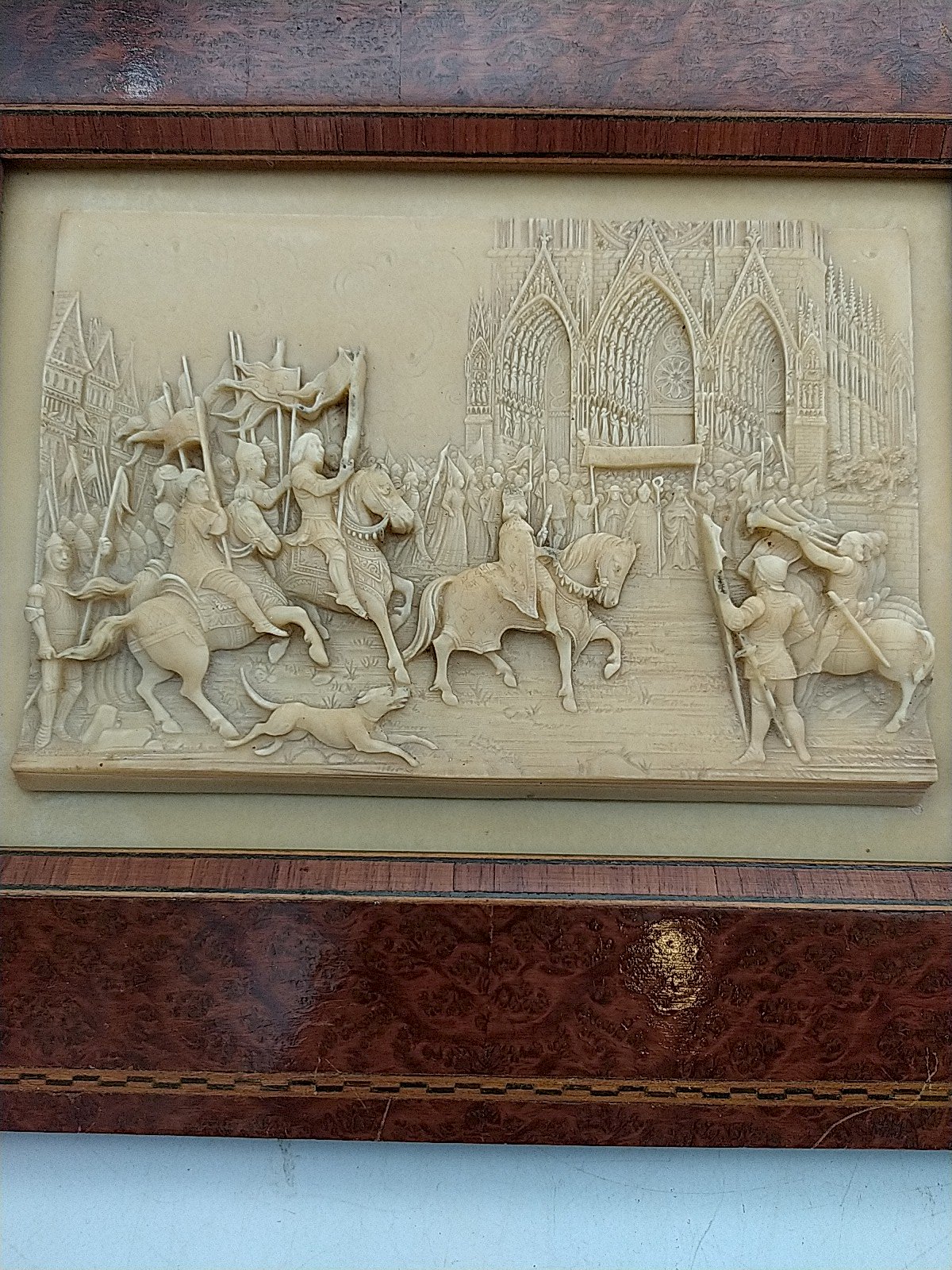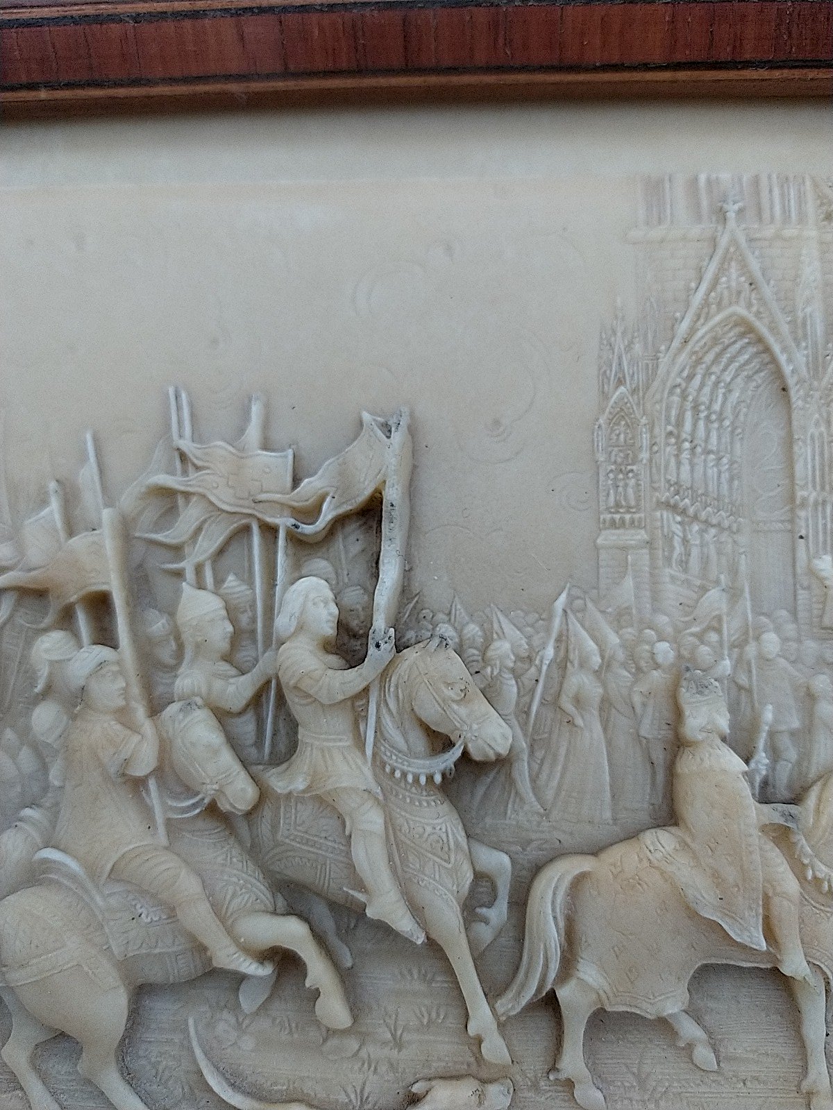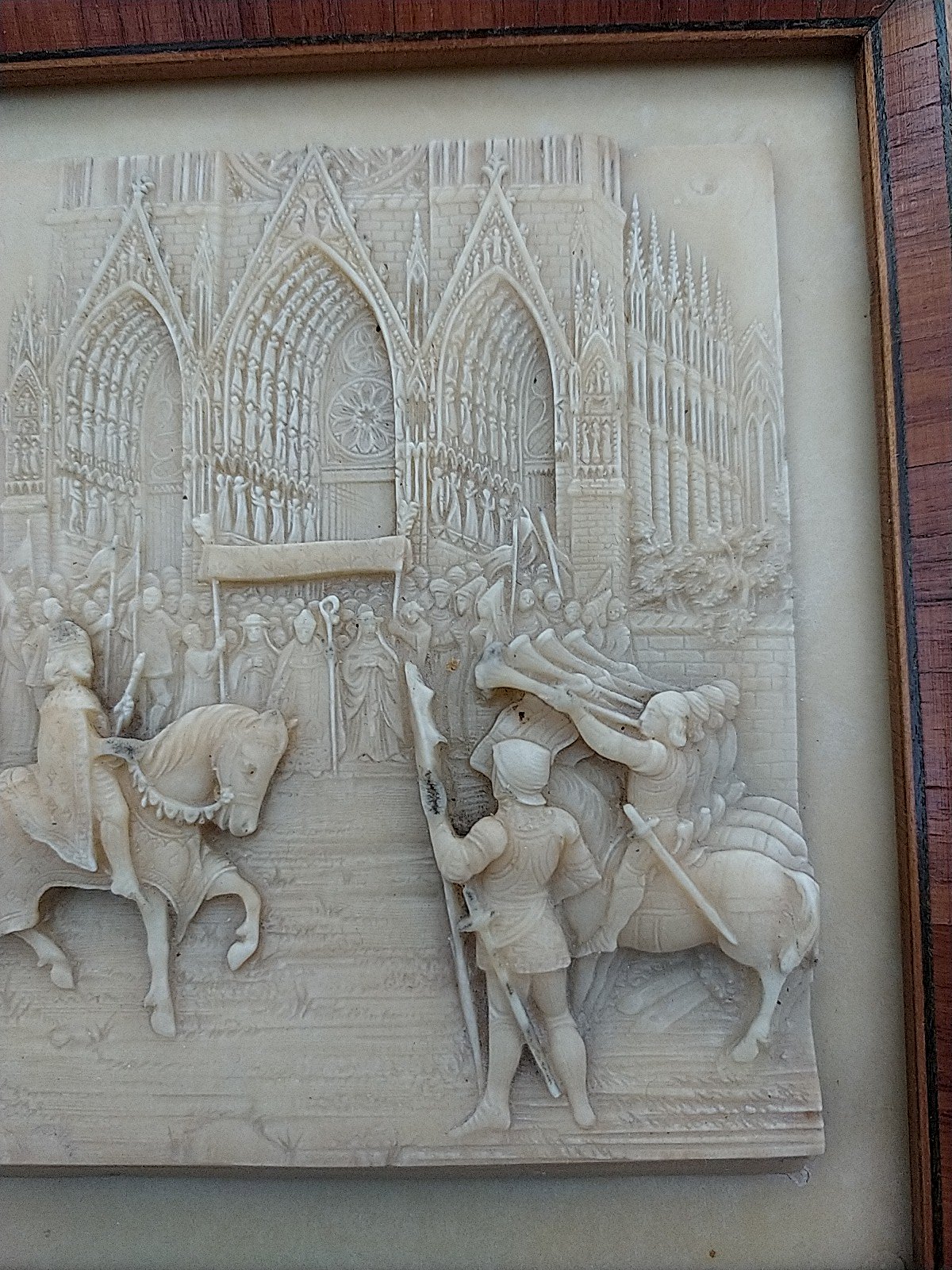 Tableau bas relief en calcaire pétrifié .Jeanne d ' Arc et Charles VII arrivant sur le parvis de la cathédrale de Reims.