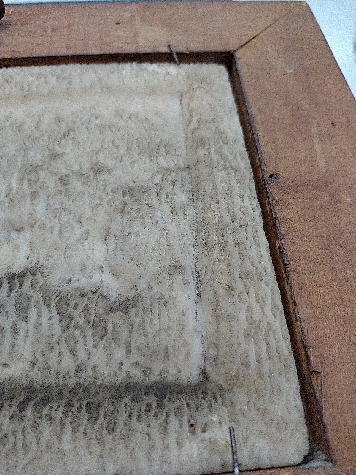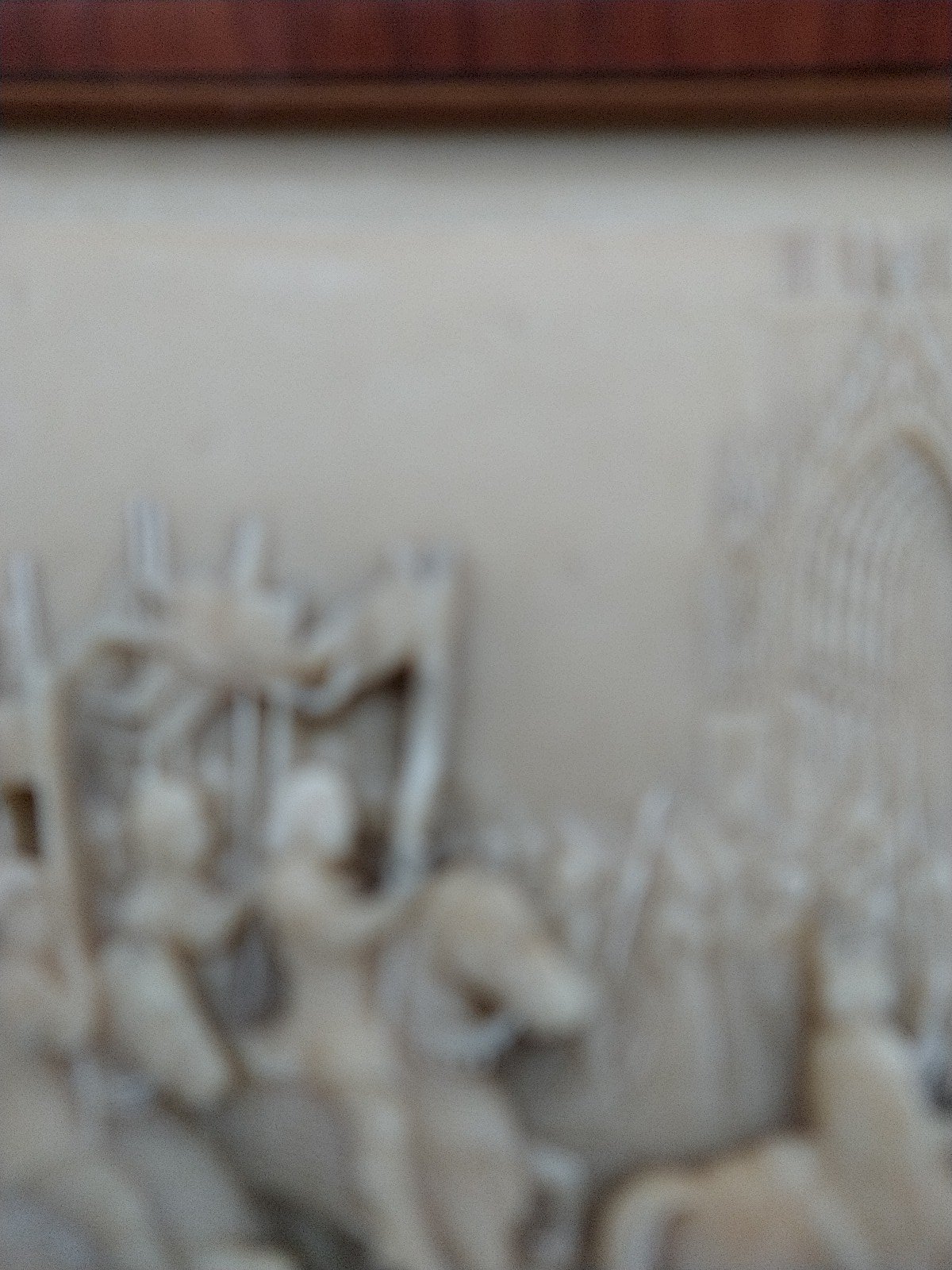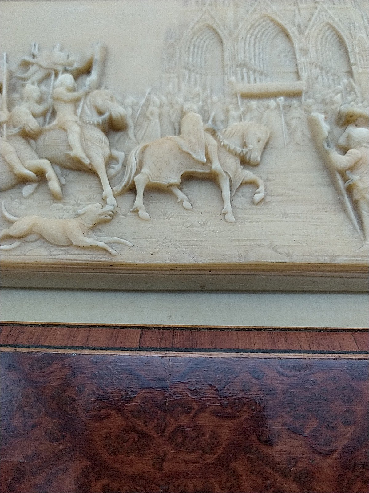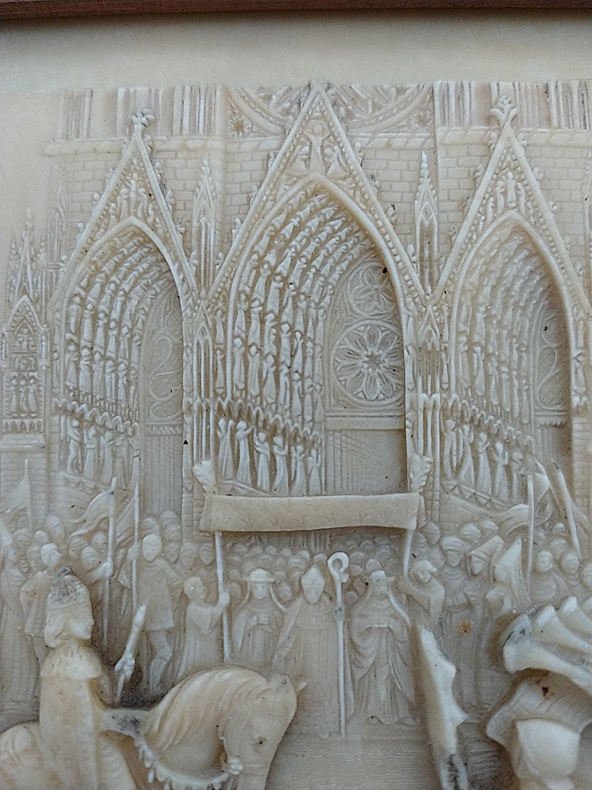 Tableau bas relief en calcaire pétrifié .Jeanne d ' Arc et Charles VII arrivant sur le parvis de la cathédrale de Reims.