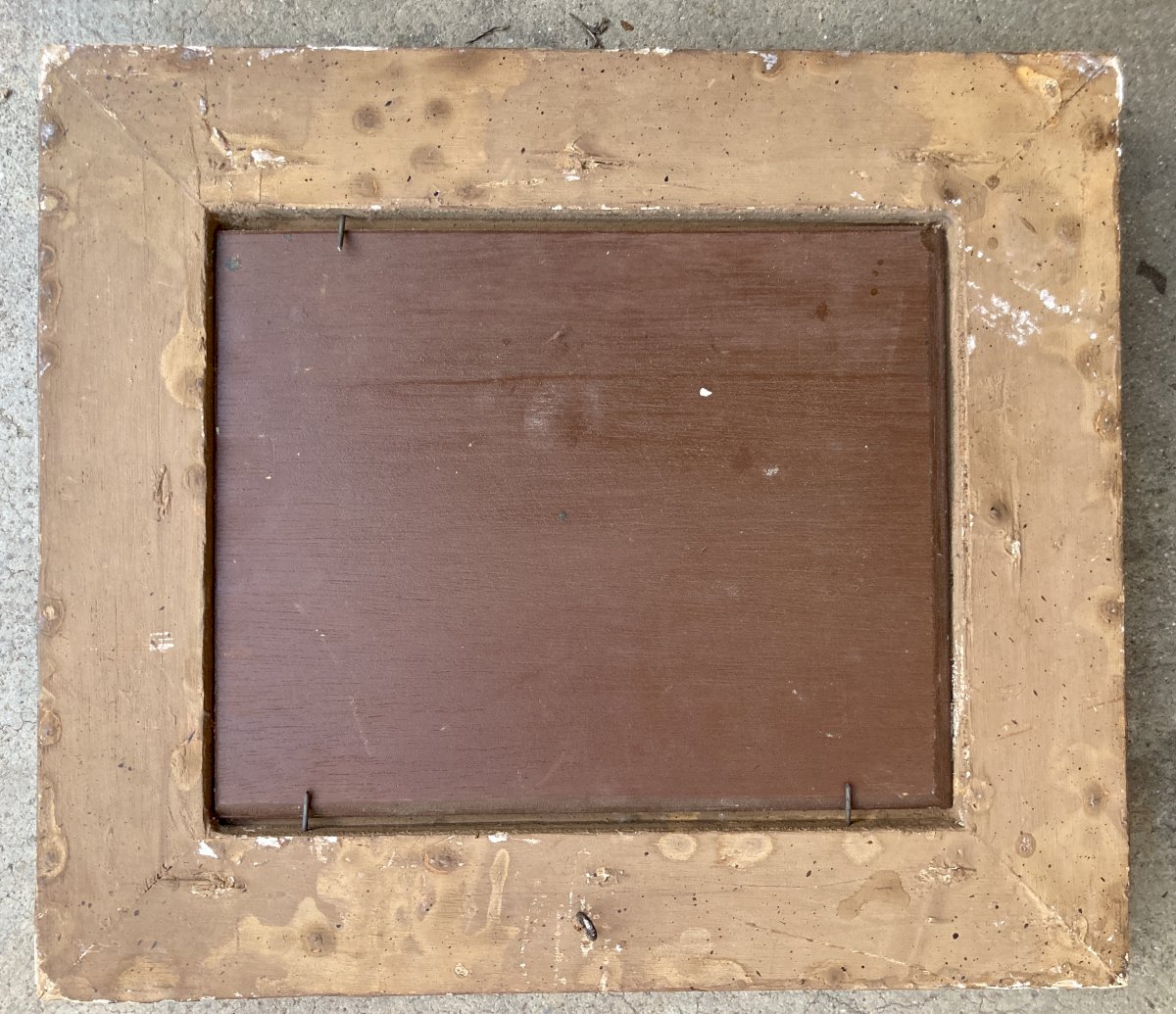 Tableau, huile sur panneau ancien, Nature morte aux fleurs, cadre doré à décor de fleurs en relief. Le cadre mesure 37 x 33, le panneau 24,8 x 20. Discrètes imperfections sur le cadre.