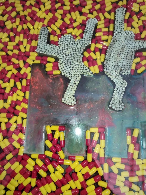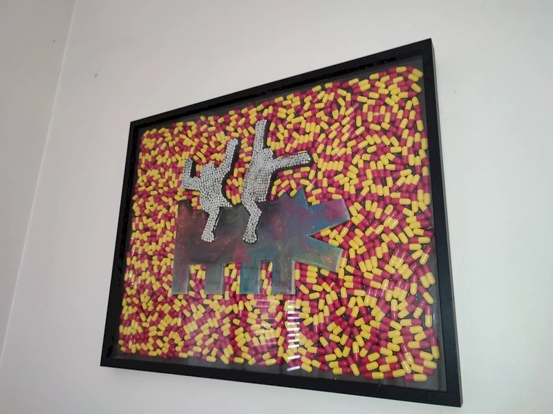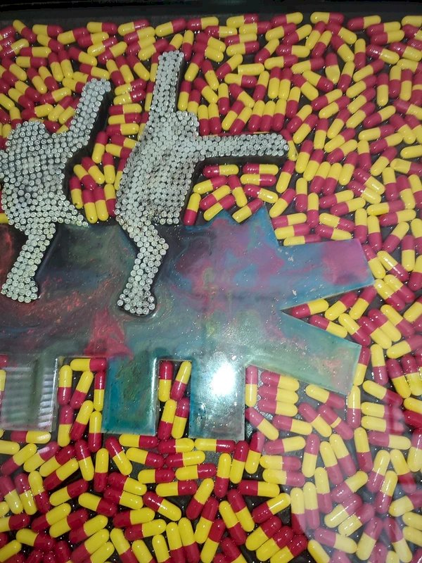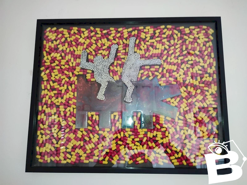 tableau original nommé "folie sous controle" signé à l'arrière du cadre par l'artiste PBS en bon etat le tableau mesure 50X40cm plusieurs techniques ont ete utilisées pour ce tableau, impression 3d, peinture acrylique, resine, collage etc..