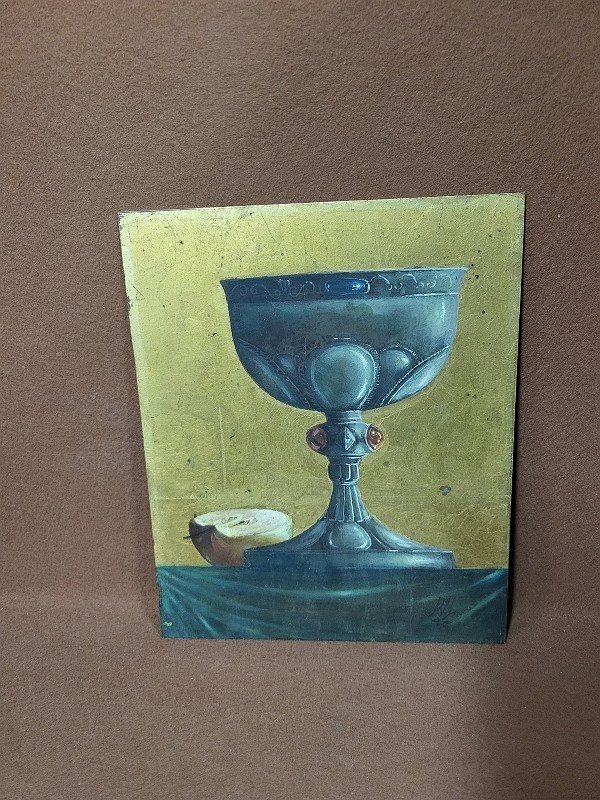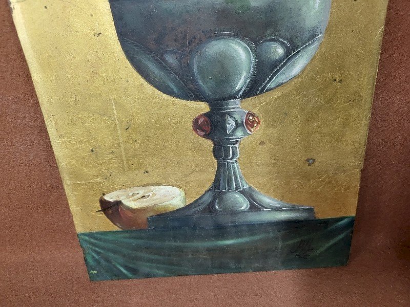 TABLEAU PEINTURE D'UN CALICE SUR CUIVRE SIGNE "MM"