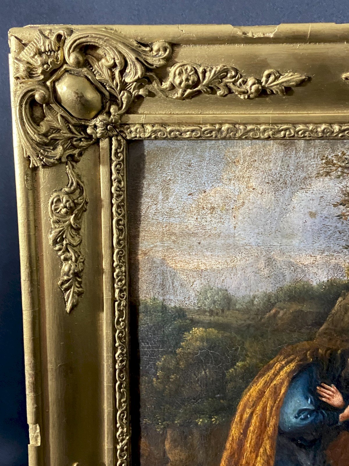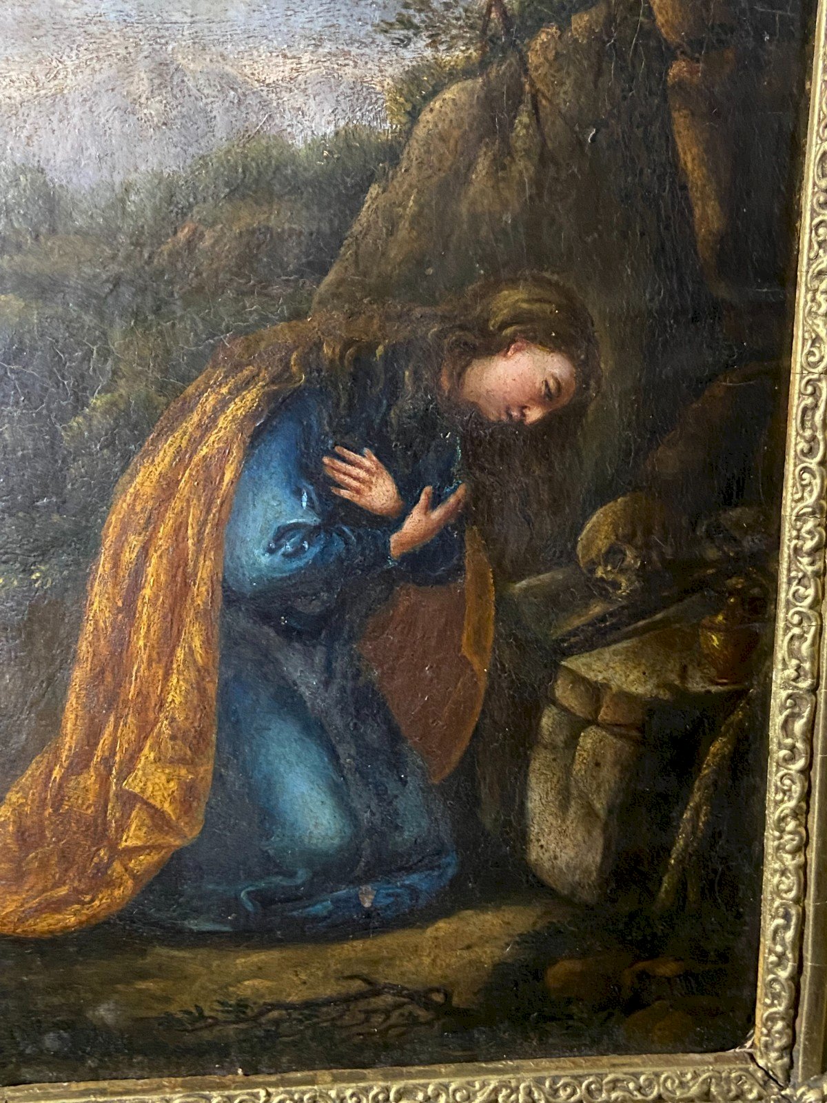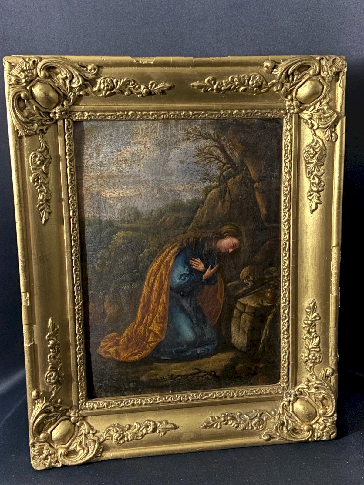 Tableau, huile sur toile marouflée sur carton représentant Sainte Marie-Madeleine en prière dans la grotte, les mains croisées sur la poitrine, agenouillée devant un autel de pierre orné d'un crâne. La Sainte vêtue d'une robe bleue est illuminée par la lumière céleste de façon à contraster avec la profondeur du paysage rocheux. Sujet réalisé par un maître français ou italien dans l'esprit du baroque religieux. Epoque fin XVIIIe début XIXe : 1780 - 1820 Huile sur toile marouflée sur carton (préparation manifestement ancienne) présentant des craquelures d’âge, salissures de surface et petites usures à la couche picturale visibles sous vernis ancien.  Cadre en bois et stuc redoré à décor rocaille, fleurs et coquilles, avec nombreux manques Dimensions max avec cadre : 48,8 x 39,3 cm / dimensions de la vue uniquement 35 x 25,4 cm Poids : 2372 grammes Envoi TRES soigné dans le monde entier Type:Huile Pays d'origine:France Courant artistique:École française Genre:Classicisme Caractéristiques:Encadré Thème:Religion, Mythologie