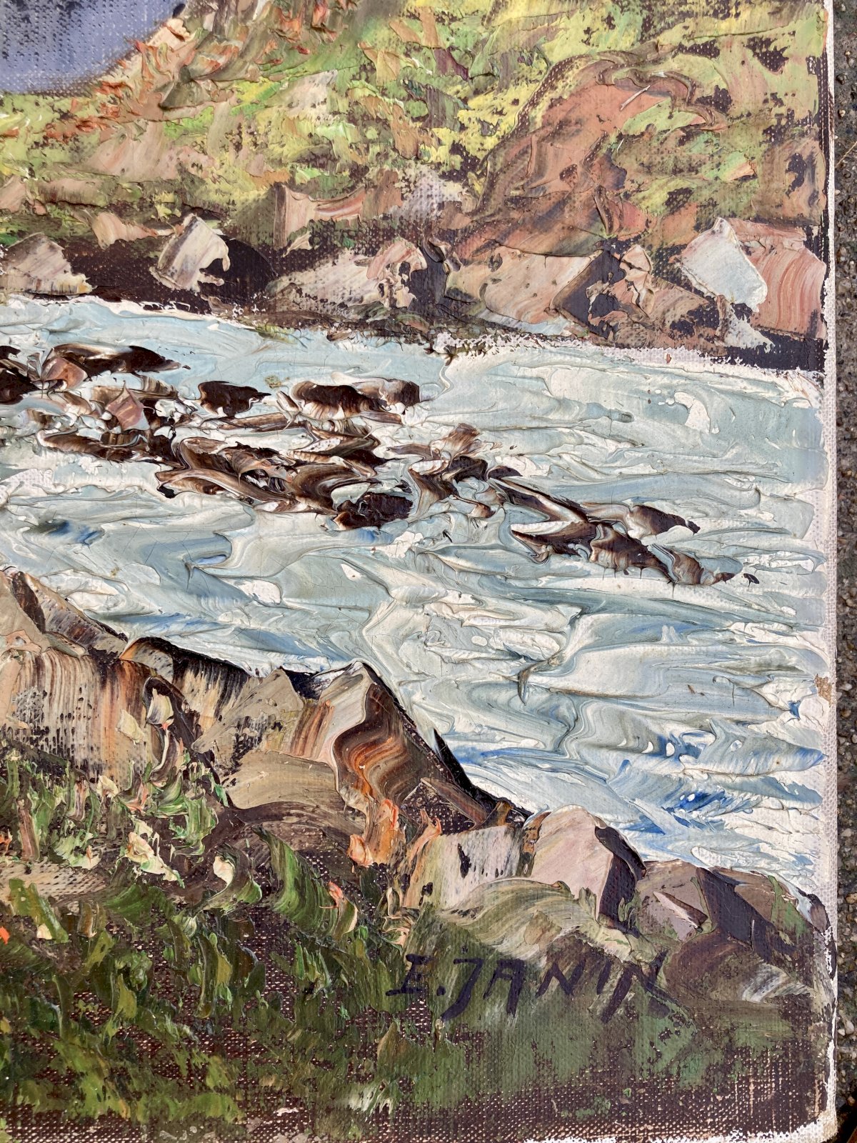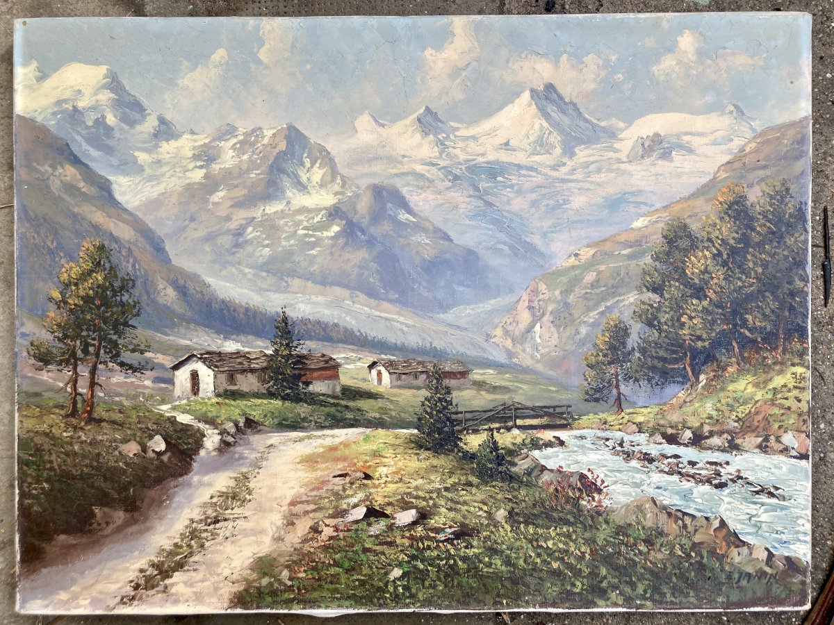 Tableau, huile sur toile (80 x 60) - scène de montagne : les alpes, vraissemblablement côté suisse ou autrichien, signée en bas à droite E Janin. Très bon état de conservation