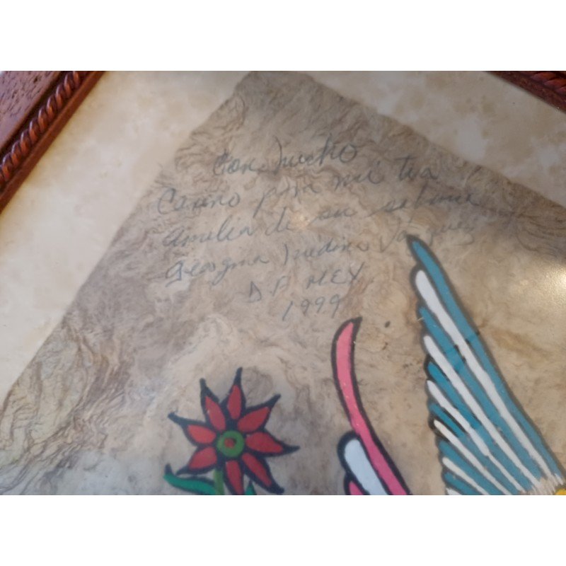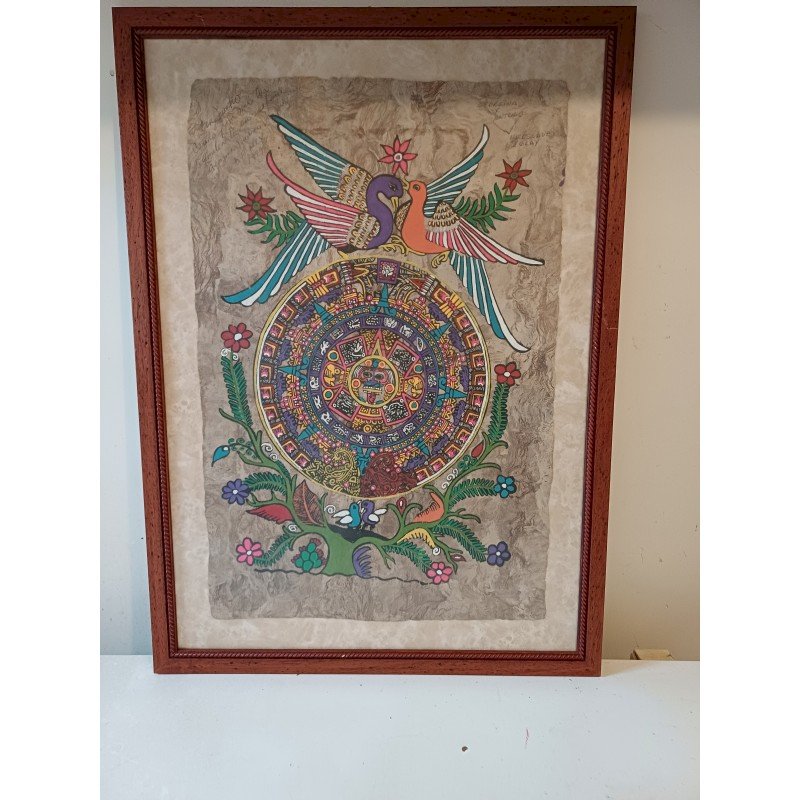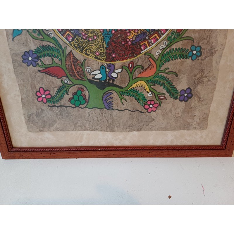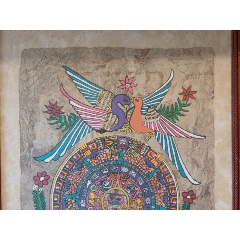 Tableau sur Peau Lama ou Vigogne Maya ou Aztéque de Georgina Hudino Vasquez , encadrement bois , sous verre , dimensions : 73 cm sur 52,5 cm , peau seule : 60 cm sur 40 cm , poids : 3,3 Kg , trés bon ètat