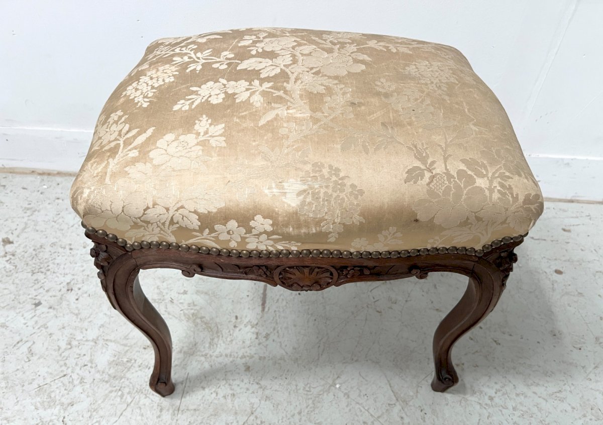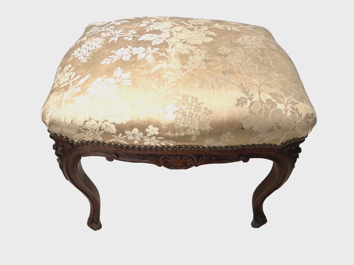 Tabouret de style Louis XV en noyer massif Quatre pieds cambrés et ceinture sculptée de fleurettes  Assise en tissus soyeux a décor floral  Bon état  Dimension  H 48 x L 50 x 42 cm  Epoque XX siècle    Type:Tabouret Origine:France Période:Design du XXème Sous-type:Classique Hauteur:48 Matière:Noyer Longueur:50 Largeur:42