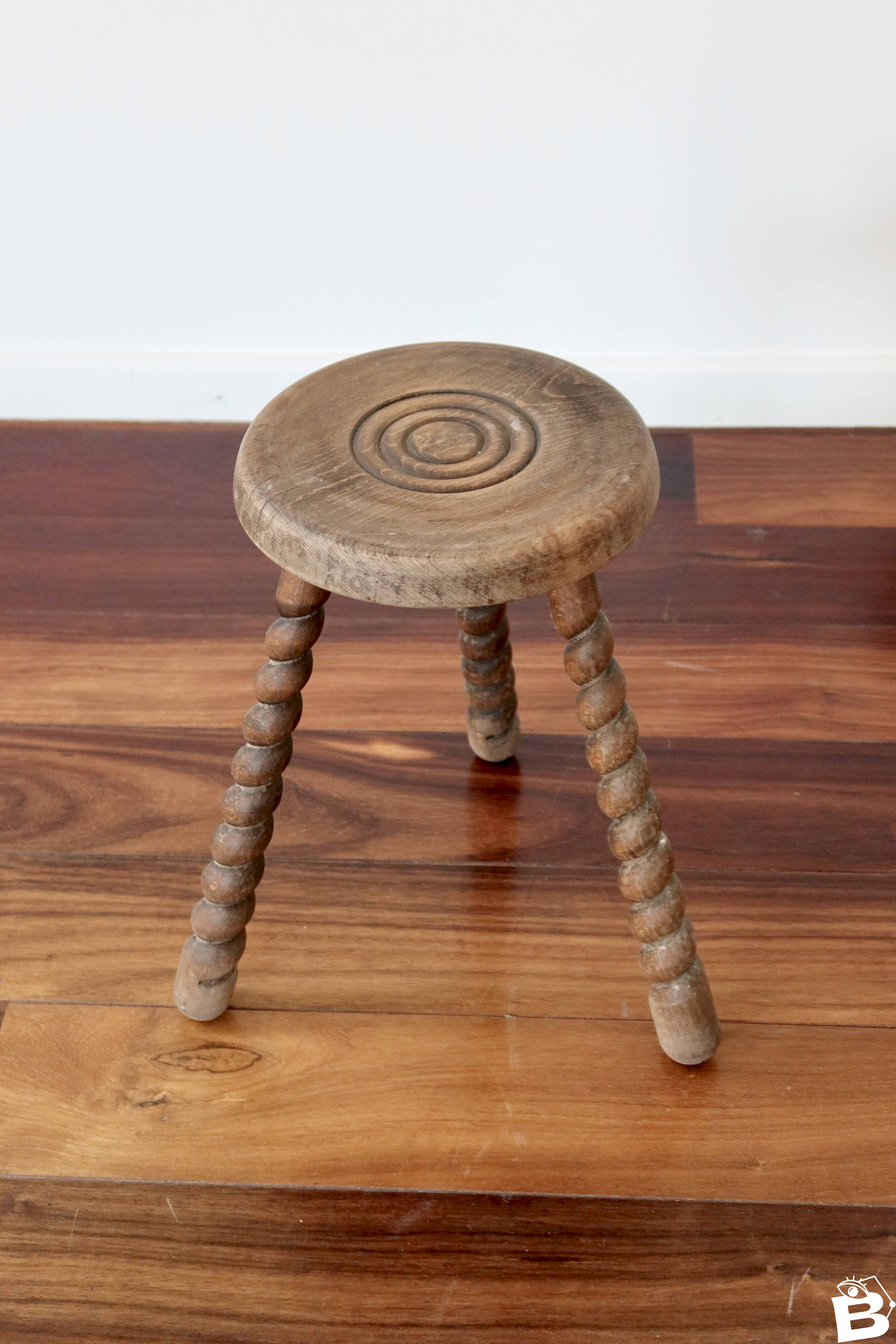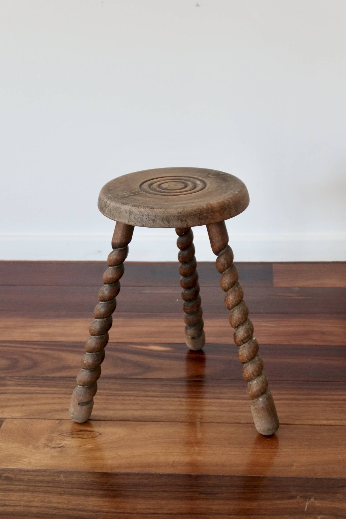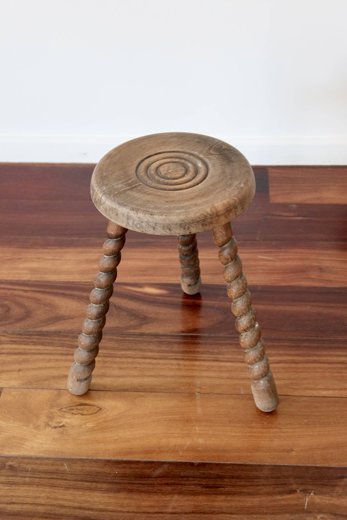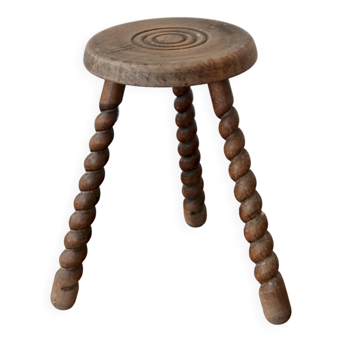 Tabouret tripode ancien en bois massif, au piètement tourné en spirale et à l’assise ronde marquée de cercles concentriques, typique du mobilier rustique ancien.La patine naturelle du bois et les irrégularités liées au temps lui donnent un charme authentique, idéal comme tabouret d’appoint, repose-plantes ou élément décoratif.Bel état général avec traces d’usage cohérentes avec l’âge, structure stable et pleine de caractère.Dimensions:Hauteur: 40cm.Assise: 25cm de diamètre.