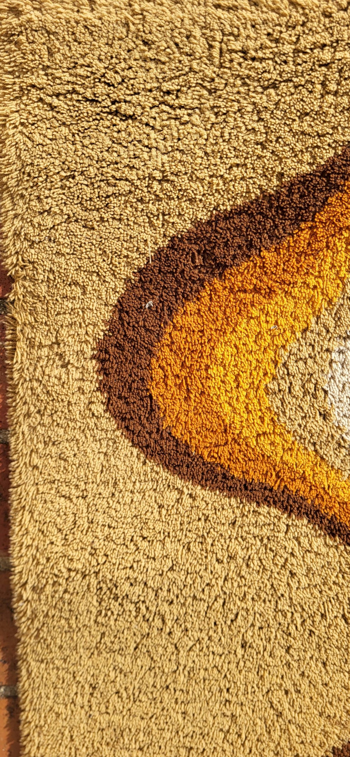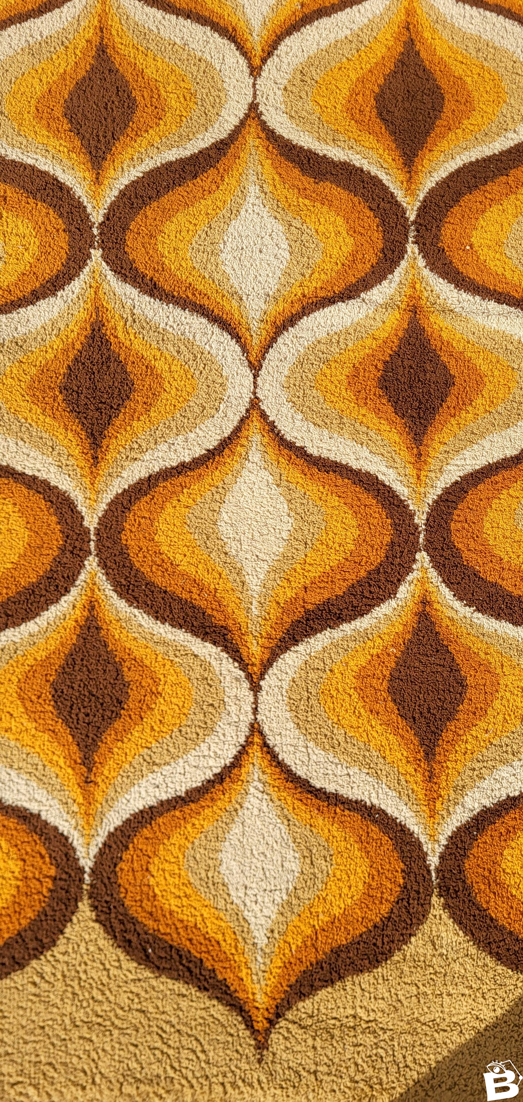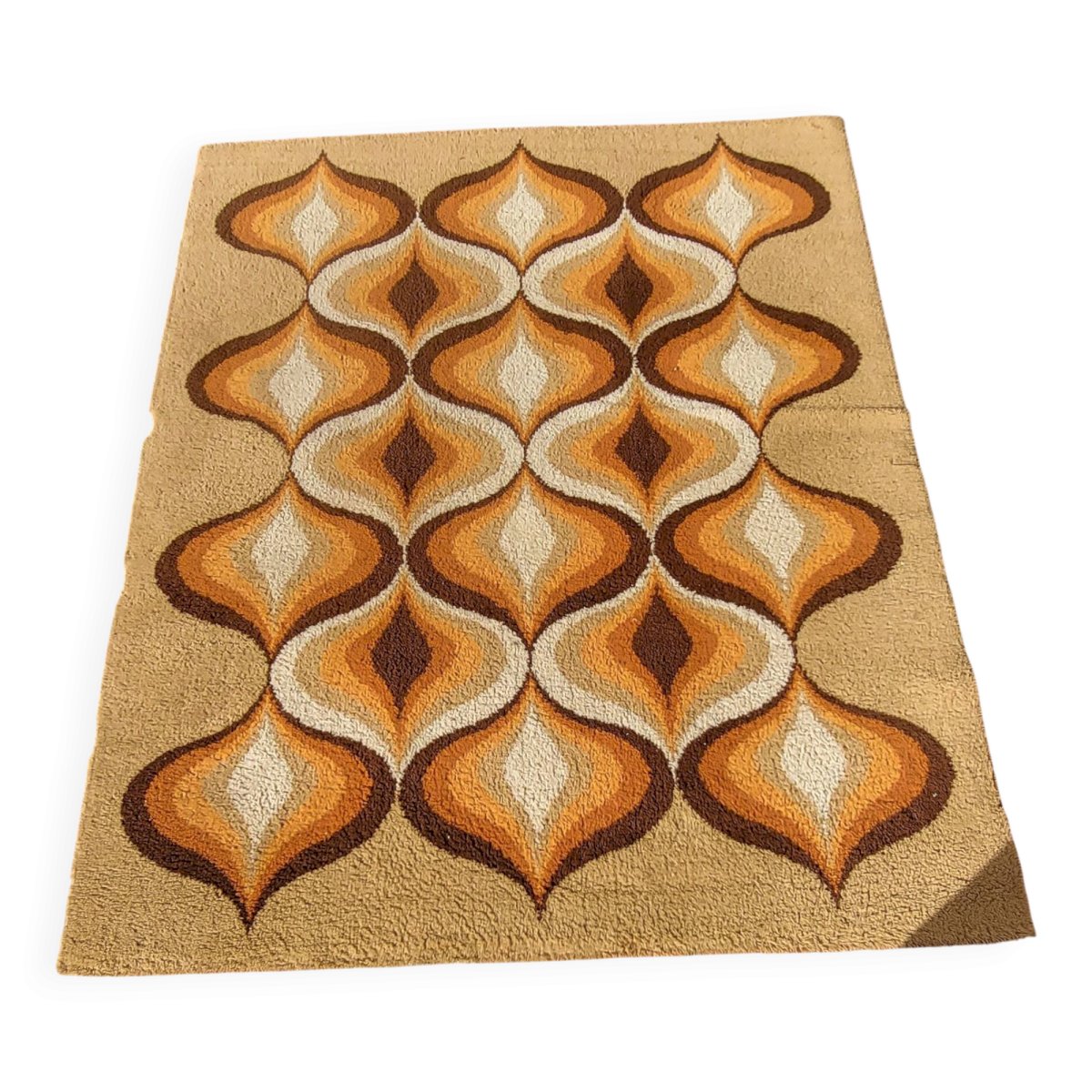 Tapis années 70 à motifs géométriques dans des couleurs typiques de l'époque.Dimensions 172*216 cm environ.On notera un petit manque sur le côté.Traces d'usage et d'ancienneté normales.