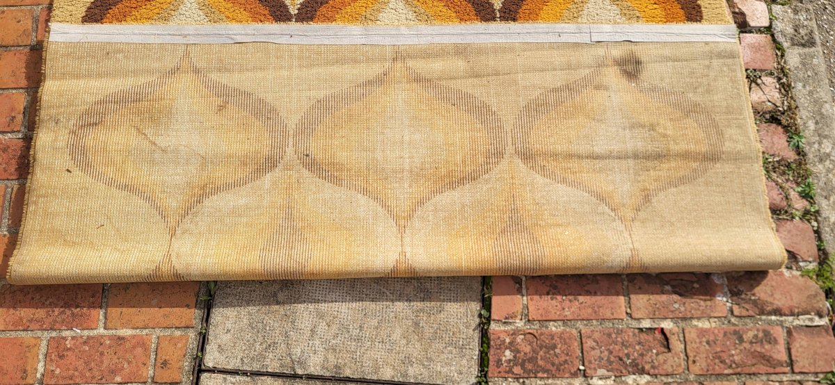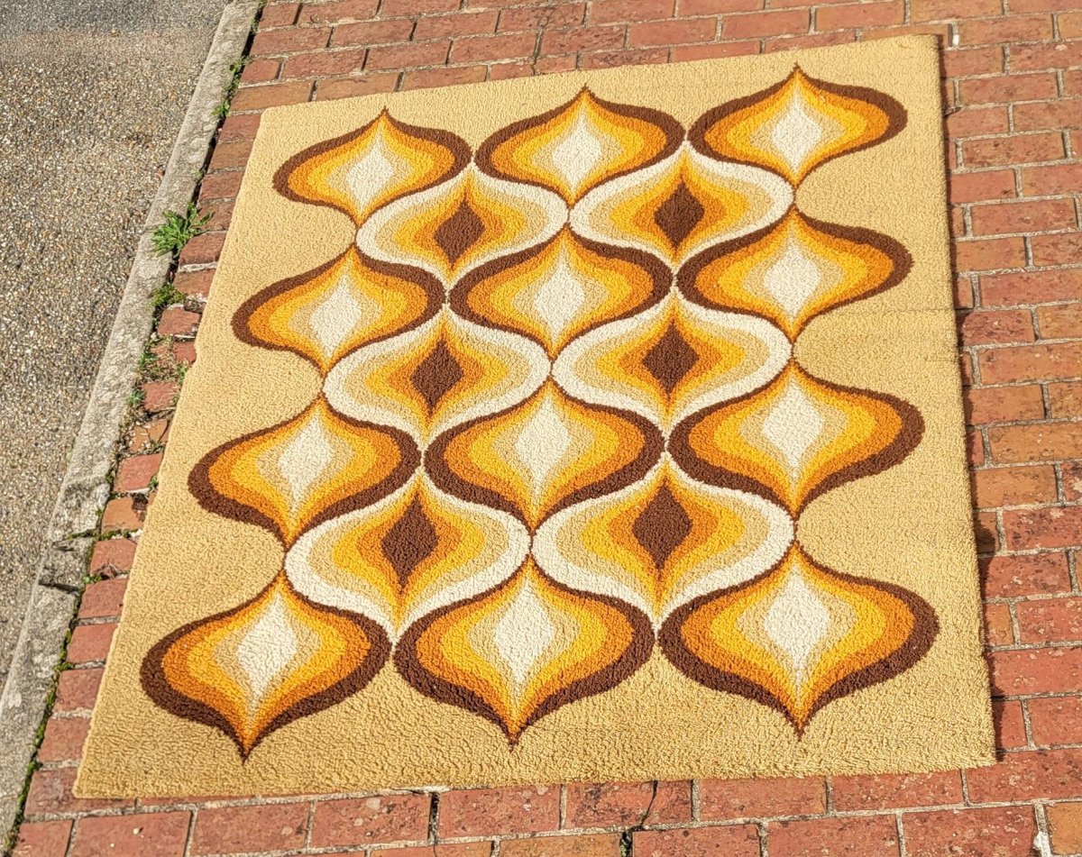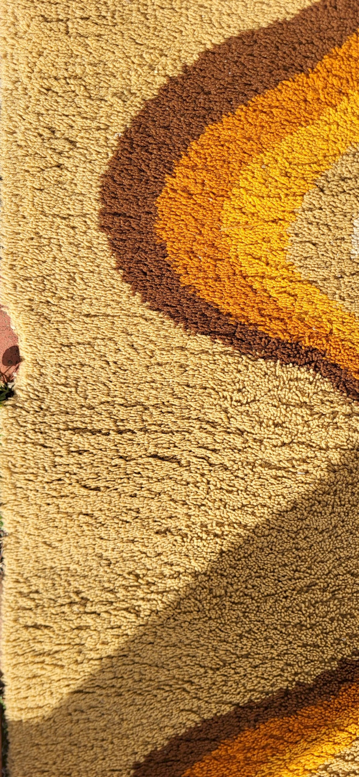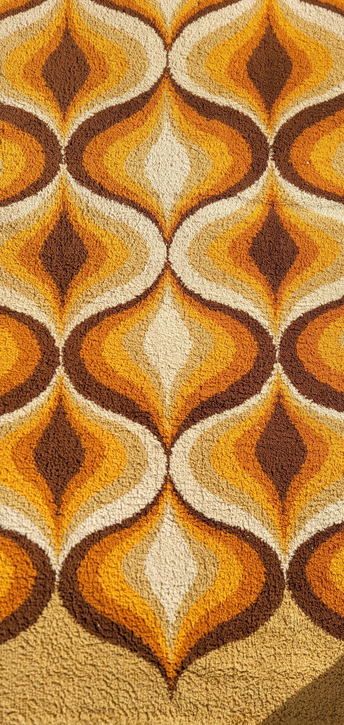 Tapis années 70 à motifs géométriques dans des couleurs typiques de l'époque.Dimensions 172*216 cm environ.On notera un petit manque sur le côté.Traces d'usage et d'ancienneté normales.