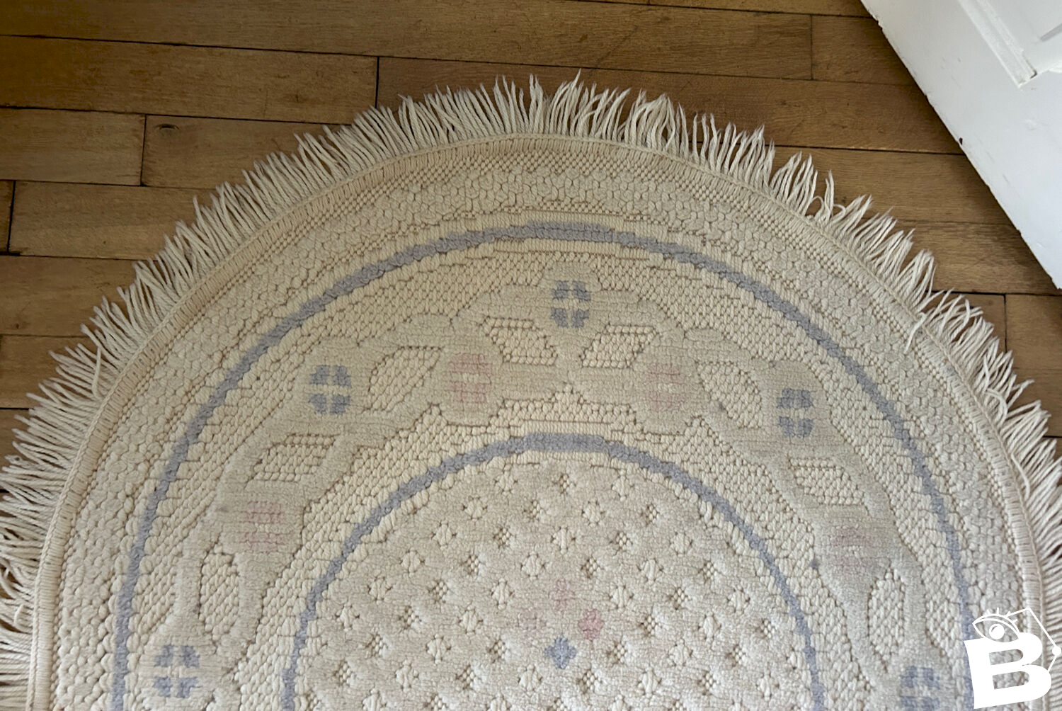 Tapis en laine de forme ovale avec des franges.Tons doux beige rose bleu.