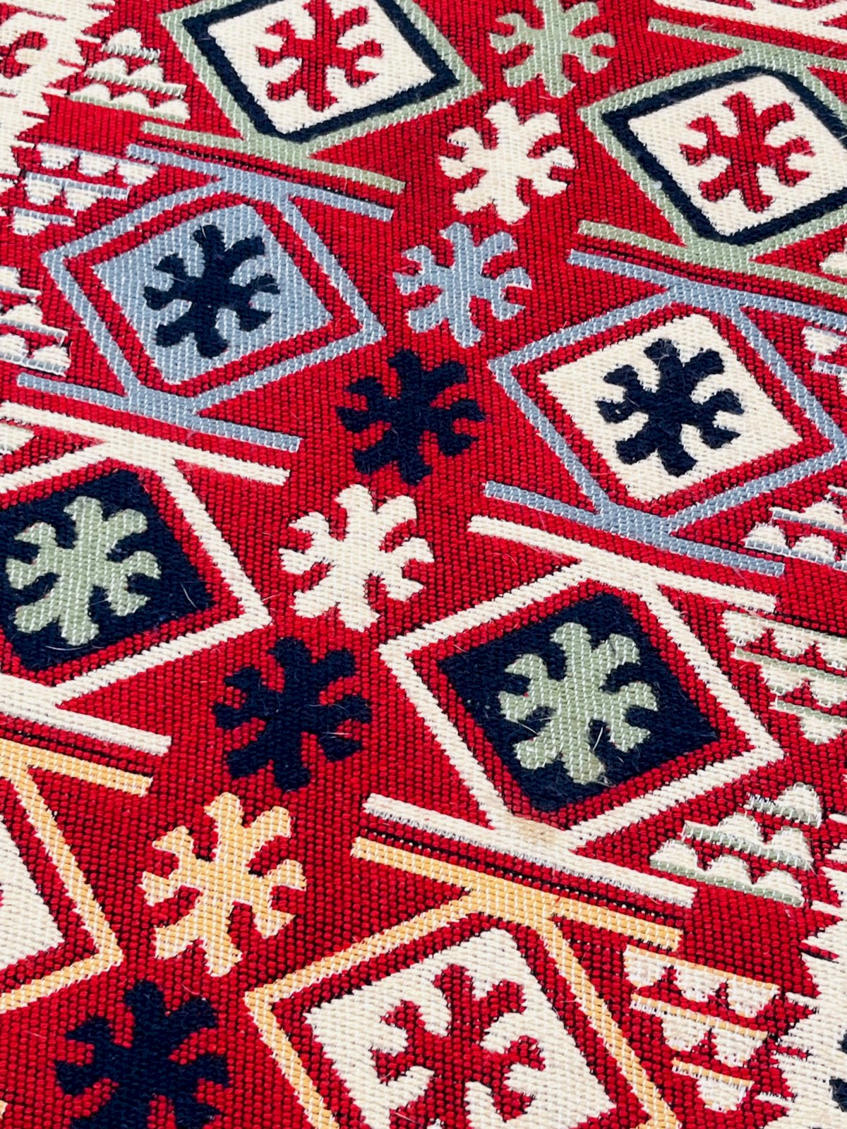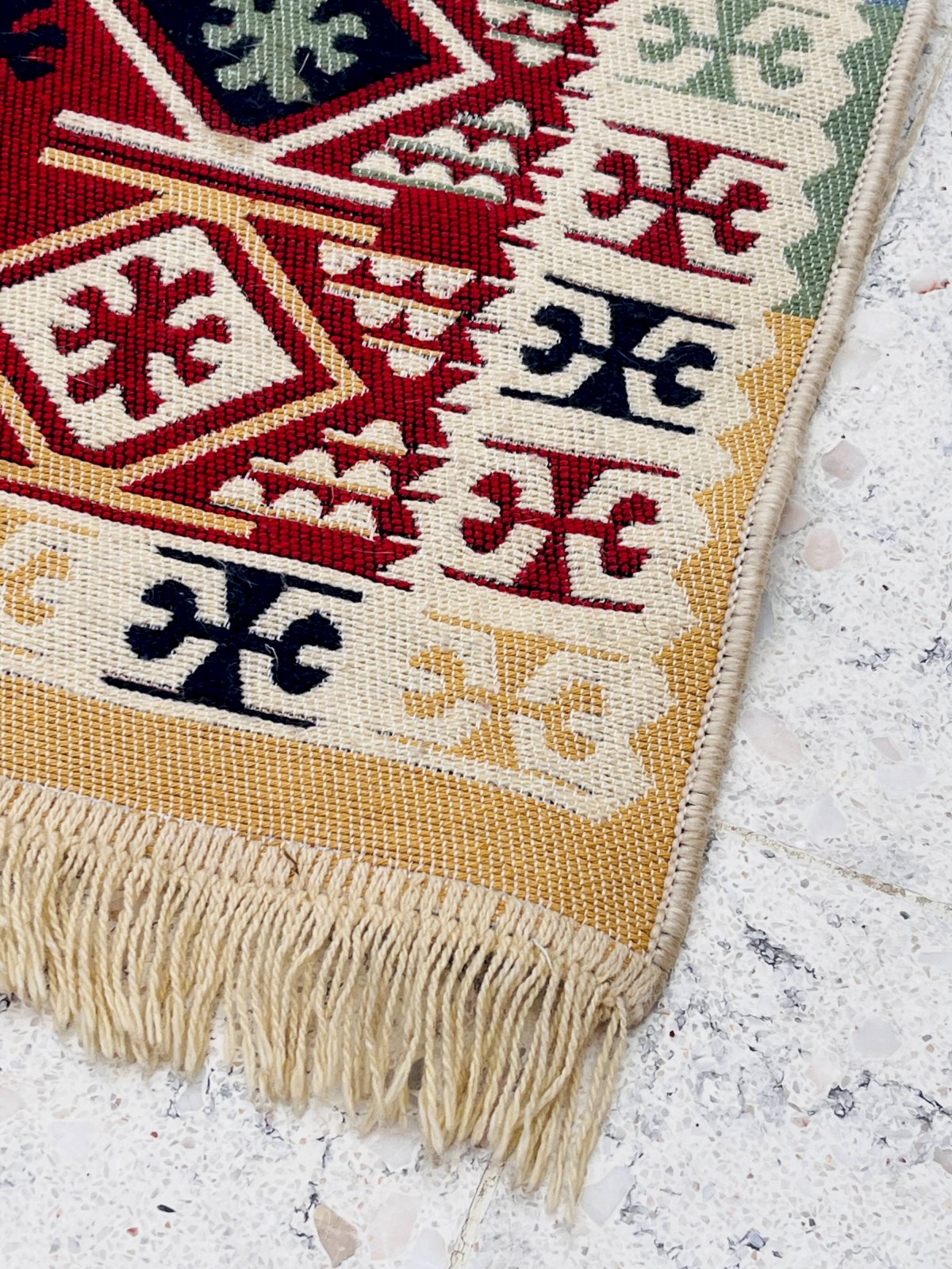 Avec ses motifs géométriques audacieux et ses couleurs vibrantes, ce tapis est une véritable œuvre d'art pour votre sol.Fabriqué en laine de haute qualité, il offre une douceur et une durabilité incomparables.Son design réversible vous permet de changer facilement l'ambiance de votre pièce.Les nuances de rouge, bleu, vert et jaune se marient harmonieusement pour créer un effet visuel captivant.Ajoutez ce tapis unique à votre collection et transformez votre espace de vie avec style et sophistication.Dimensions: 130 X 56 X 1 cm.