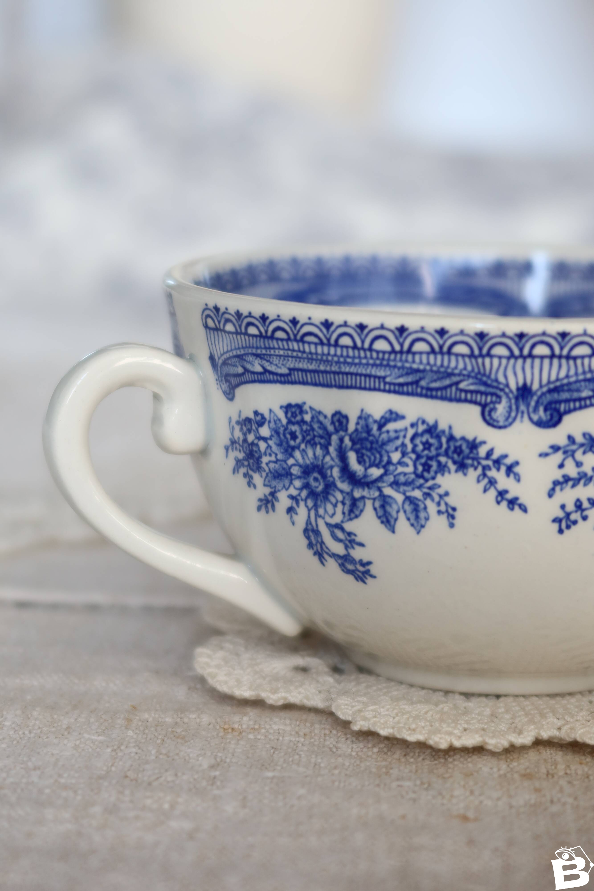 Élégante tasse à thé en faïence ancienne, décorée d’un motif floral bleu sur fond blanc.