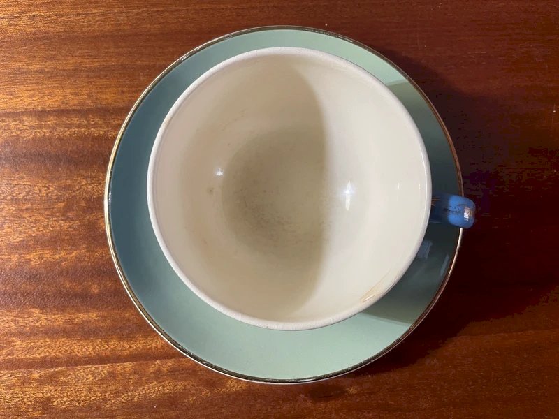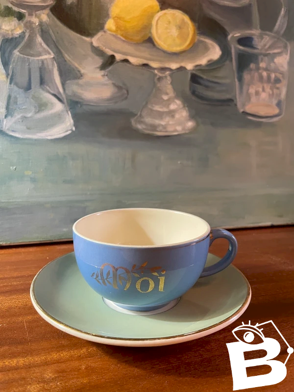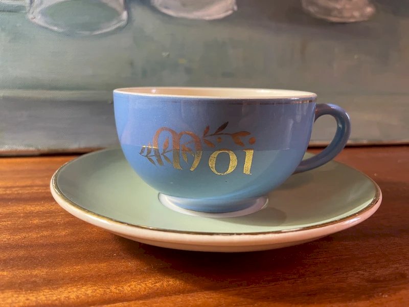 Tasse à thé ou café allongé Villeroy & Boch vintage « Moi » Tasse bleue et sous-tasse vert mint A noter un petit éclat à l’intérieur de la tasse Tasse hauteur 6cm, diamètre 10,5cm Sous-tasse diamètre 16,5cm
