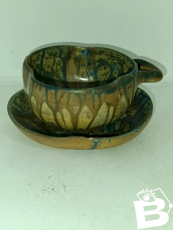 tasse et coupelle gres signé Gilbert metenier en bon etat tasse diametre 10cm hauteur 5cm et coupelle diametre 13cm à note un eclat sur la coupelle (voir photos) beau modele avec une belle forme...