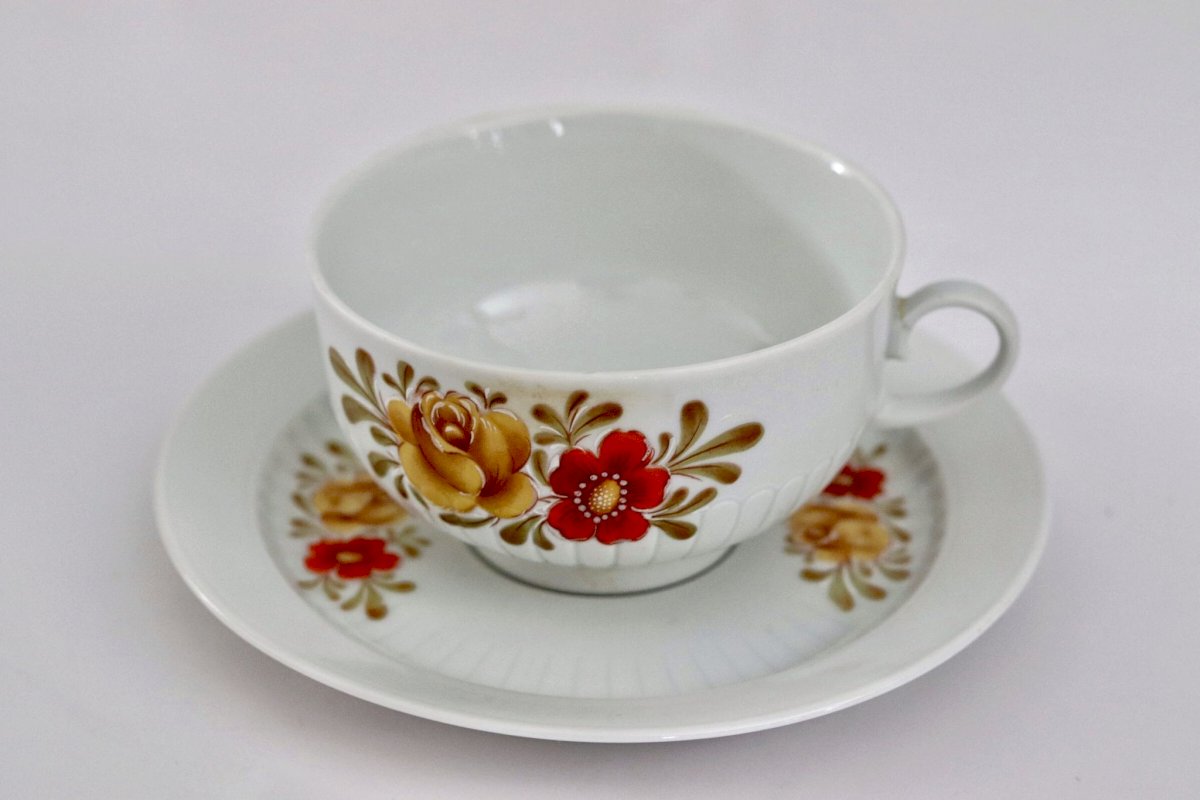 Très bel ensemble vintage en porcelaine blanche, délicatement décoré de motifs floraux dans des tons rouge et ocre/moutarde, chaleureux et élégants.
