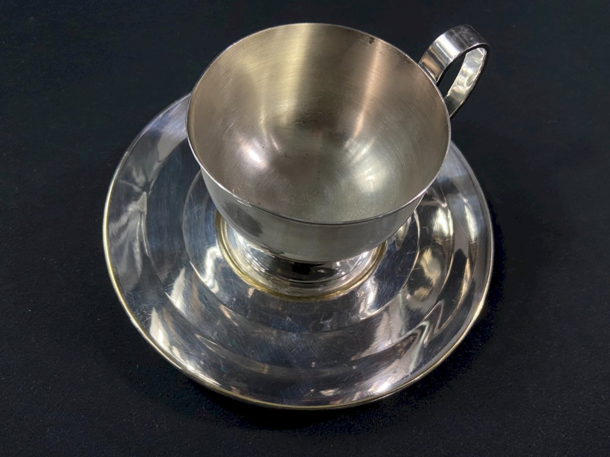 Tasse et sous-tasse en métal argenté Dimensions max : - Tasse : 9,2 x diamètre 8,8 x Hauteur 7,9 cm - Sous-tasse : Diamètre 17,7 x 1,6 cm Poids total : 324 grammes Ensemble probablement réassorti  Je signale des traces de désargentures en contour intérieur de la sous-tasse, de fines rayures usuelles ainsi que diverses détails d'usages visibles sur les photos Envoi TRES soigné dans le monde entier Pays d'origine:France Authenticité:Original Type:Arts de la table, Cuisine Origine:France Sous-type:Tasse Matière:Métal argenté