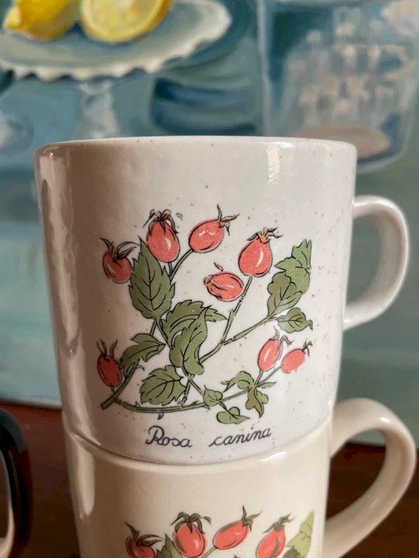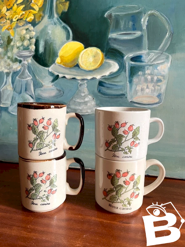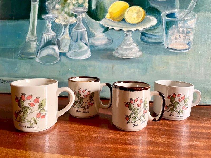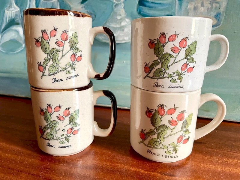 4 tasses en grès vintage fabriquées en Corée « Rosa canina » Très bon état Hauteur 9 & 8,5cm