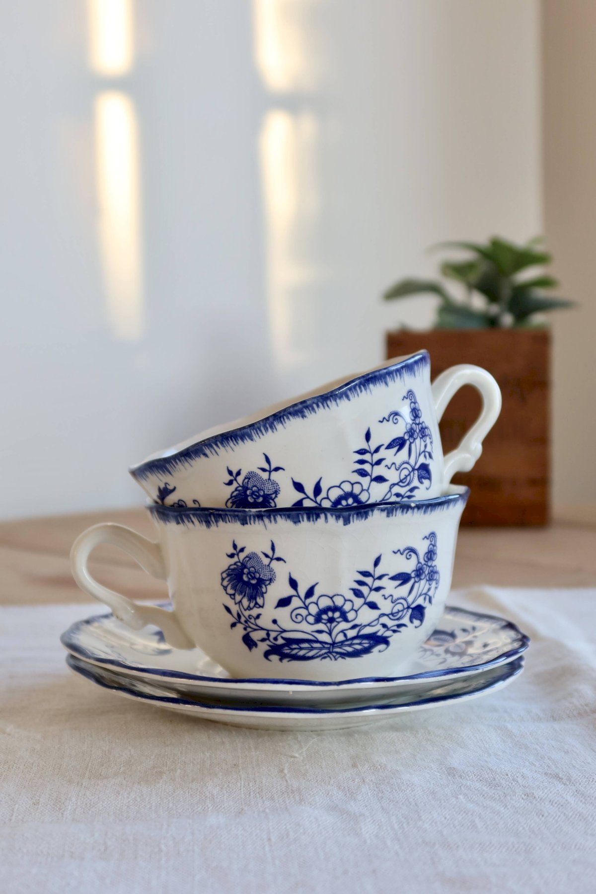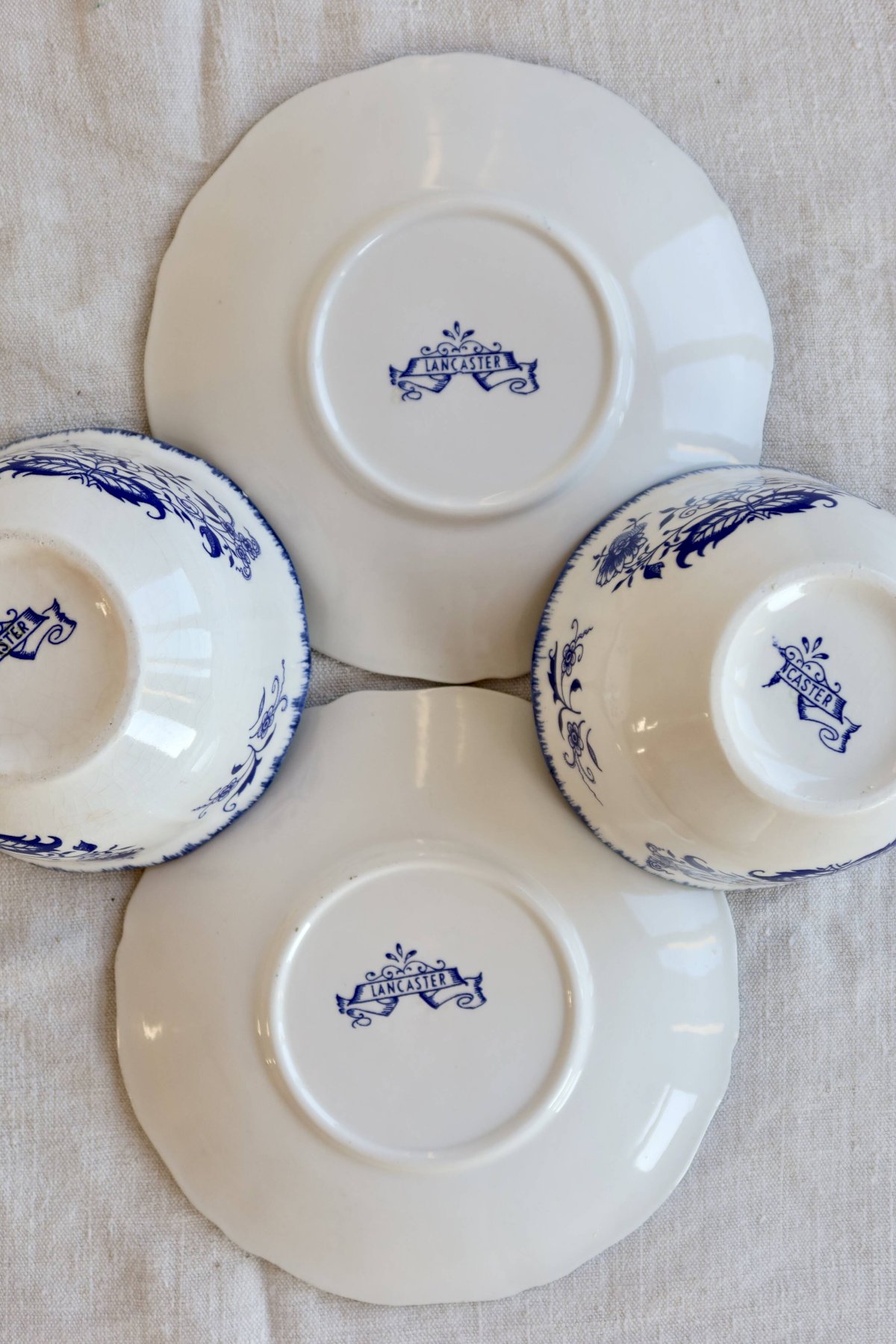 Tasses et sous-tasses anciennes Lancaster en faïence blanche à décor bleu Céramique
