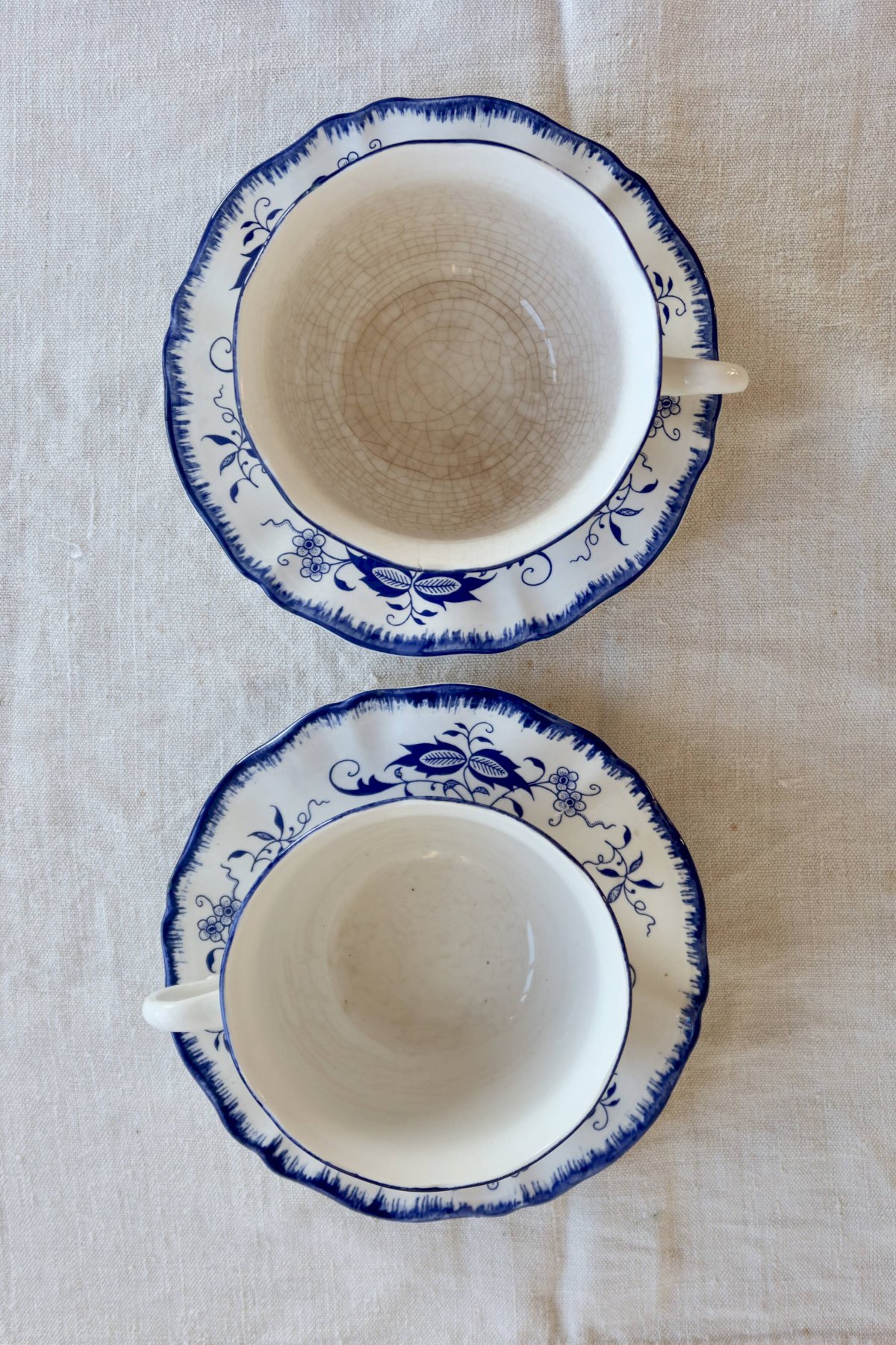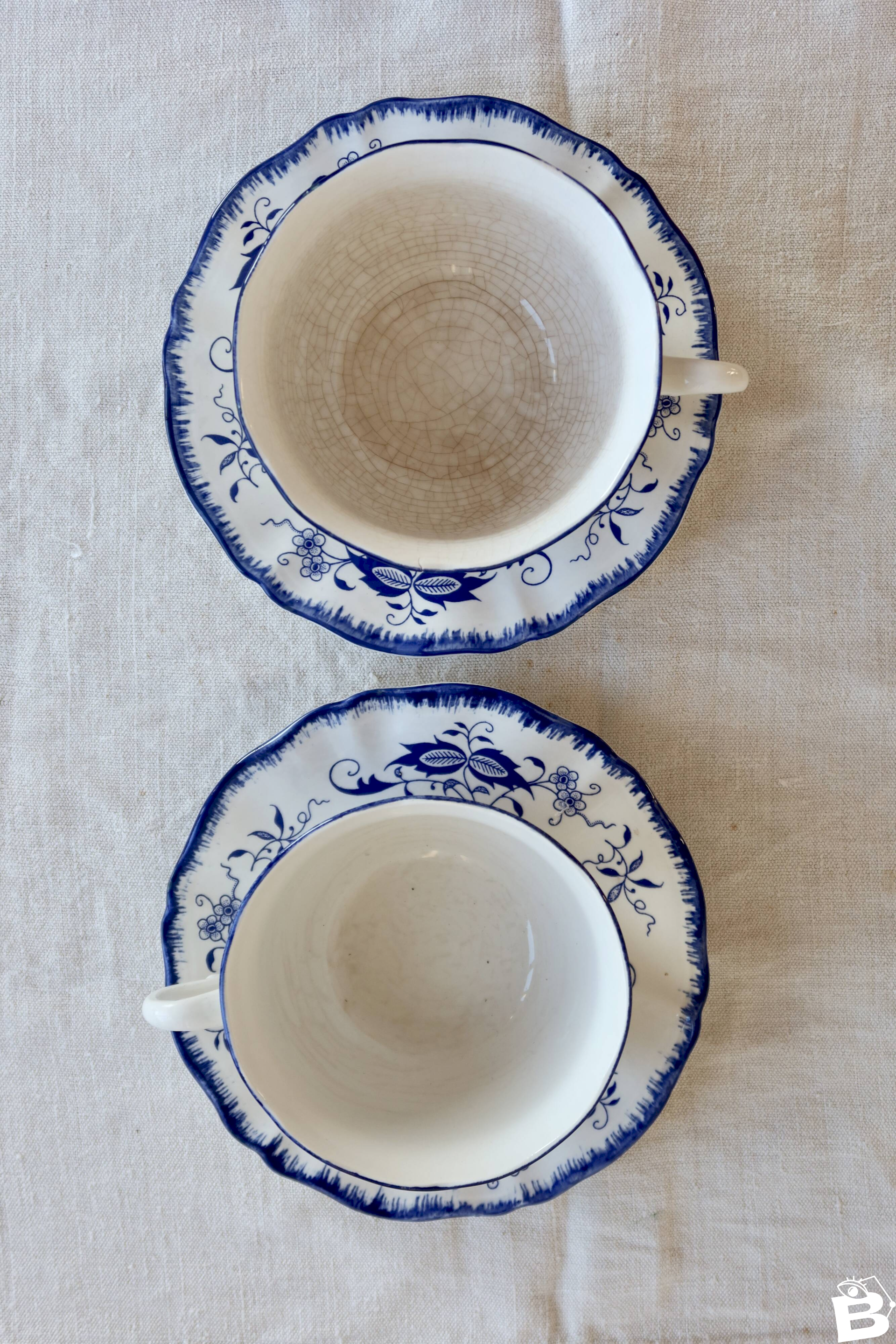 Anciennes tasses et sous tasses, décor fleurs bleues, chinoise