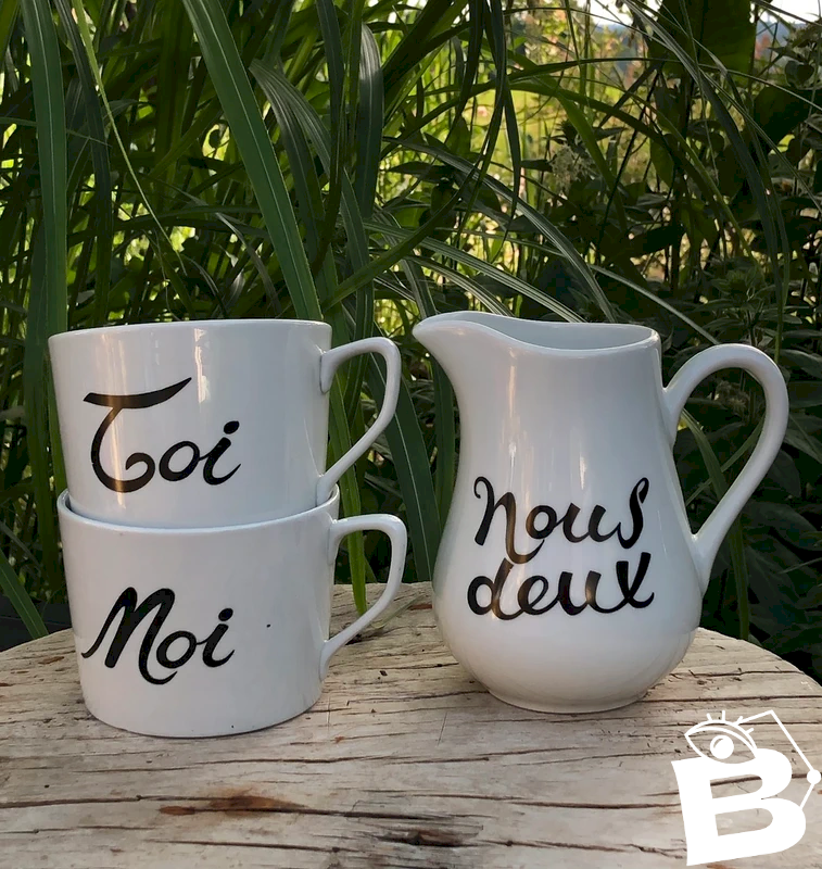 Tasses Toi et Moi et crémier Nous Deux en porcelaine blanche