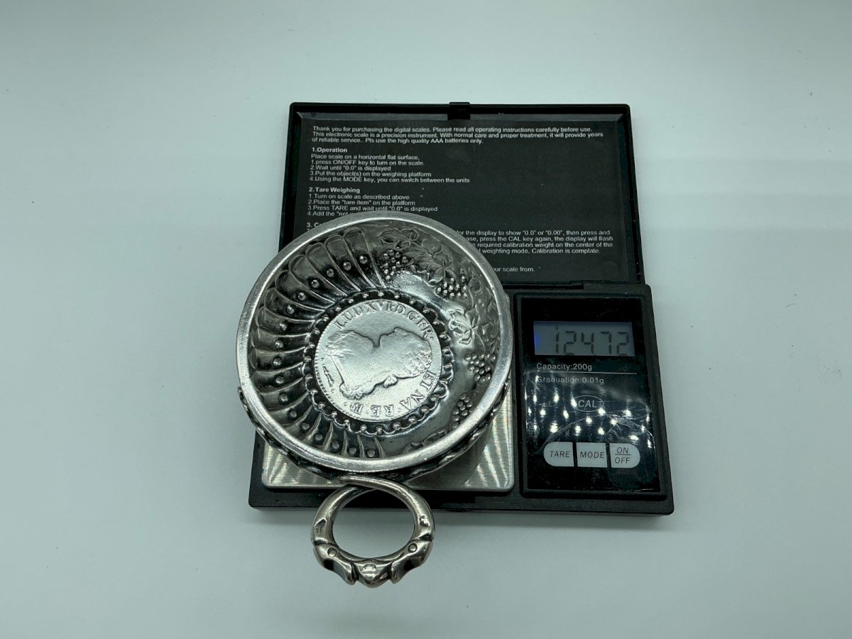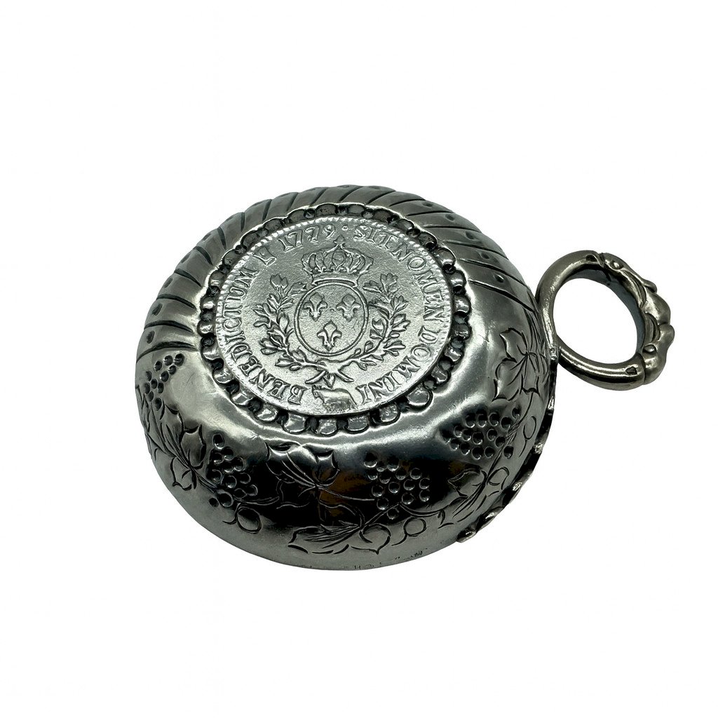Tastevin royal en argent massif — écu “aux branches d’olivier” Louis XVI (1779) — anse double serpent — gravure nominative Un bijou d’orfèvrerie et d’Histoire : ce tastevin en argent massif est orné de pampres de vigne en relief, ceint d’un listel godronné, et serti d’un véritable écu de France “aux branches d’olivier”, Louis XVI, daté 1779. Sa poignée double serpent incarne vigilance et savoir, tandis qu’une gravure au nom de son propriétaire — “F. MAZALE. DE. FRAICE” — en fait une pièce unique et nominative, véritable document historique. Description Matière : argent massif (poinçonné) Médaillon : écu de France “aux branches d’olivier” (Louis XVI, argent, daté 1779) Décor : pampres de vigne et grappes en relief ; listel godronné ; anse double serpent ciselée Gravure : inscription d’époque “F. MAZALE. DE. FRAICE”, donnant une dimension historique et personnelle rare Poinçons : poinçons de garantie et d’orfèvre visibles Période : fin XVIIIᵉ – début XIXᵉ (tastevin), monnaie royale datée 1779 État : superbe état, reliefs nets, écu parfaitement lisible, gravure profonde et authentique Dimensions Diamètre : 8 cm — 3.15 in Hauteur : 3 cm — 1.18 in Longueur avec anse : 10,5 cm — 4.13 in Poids : 124 g Intérêt historique L’écu “aux branches d’olivier” est une monnaie emblématique de Louis XVI, frappée en argent pur en 1779. La gravure nominative atteste de son usage personnel, probablement par un amateur éclairé, notable ou membre d’un corps lié à la vigne et au vin. La poignée à serpents entrelacés est un motif recherché et rare dans l’orfèvrerie française, symbole de connaissance et de vigilance. Provenance et authenticité Issu d’une collection privée, livré avec facture et certificat d’authenticité du Repaire des Antiquités. Une pièce de musée, d’une rareté exceptionnelle aucun autre exemplaire comparable n’a été retrouvé en vente publique ou privée. Livraison Emballage soigné et sécurisé Envoi international avec suivi Points forts Montage d’un écu royal authentique de 1779 Poignée double serpent, rare et recherchée Gravure nominative historique : “F. MAZALE. DE. FRAICE” Poids important (124 g) et superbe état Authenticité:Original Type:Objet de vitrine, Décoratif Origine:France Sous-type:Taste-vin Pays d'origine:France Hauteur:3 cm Style:Louis XVI Matière:Argent massif Longueur:8 cm Largeur:8 cm