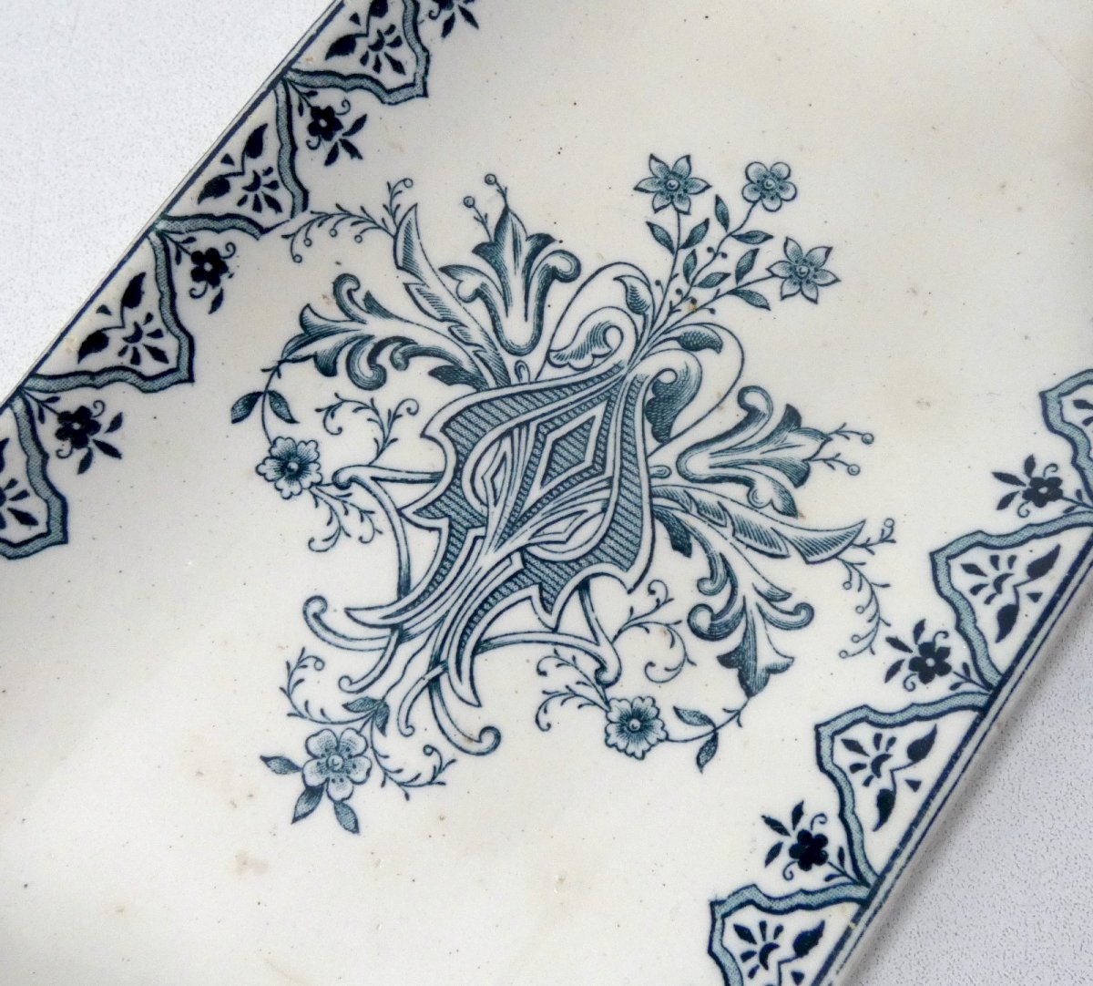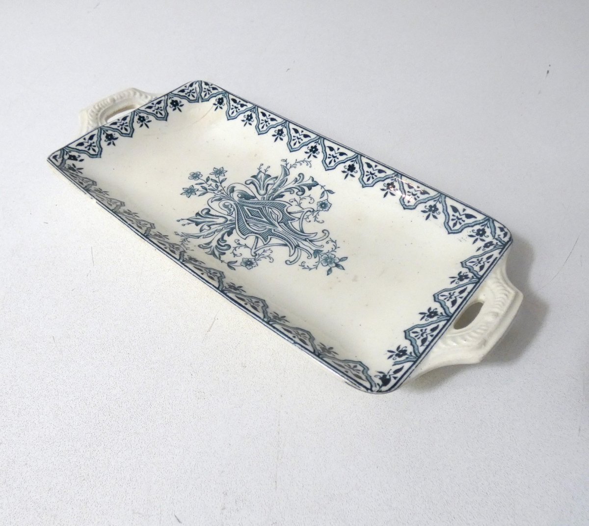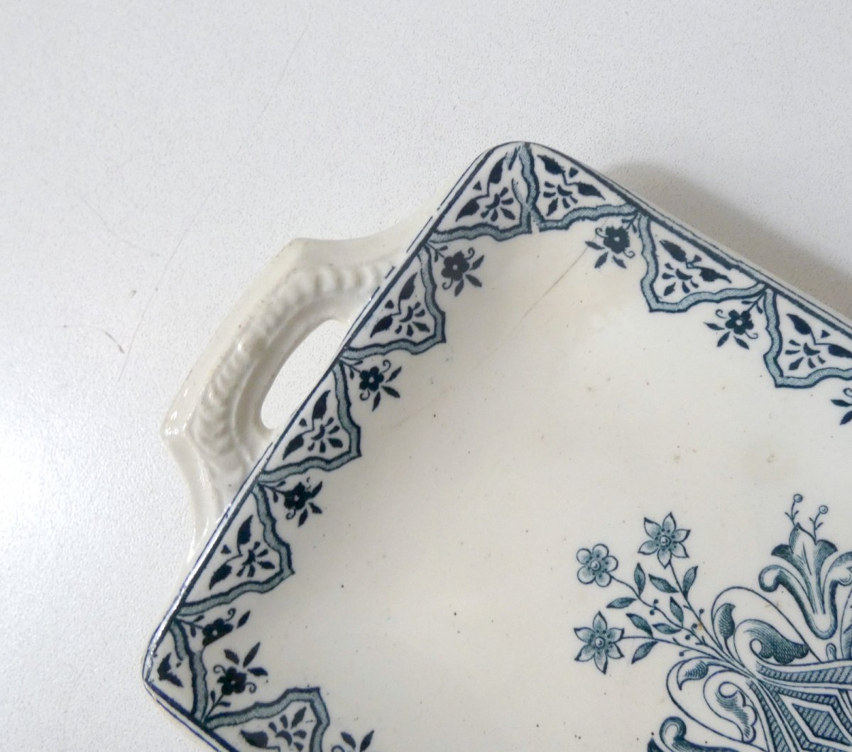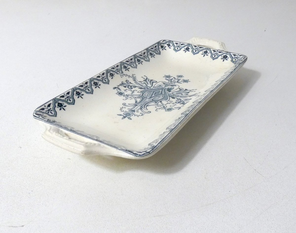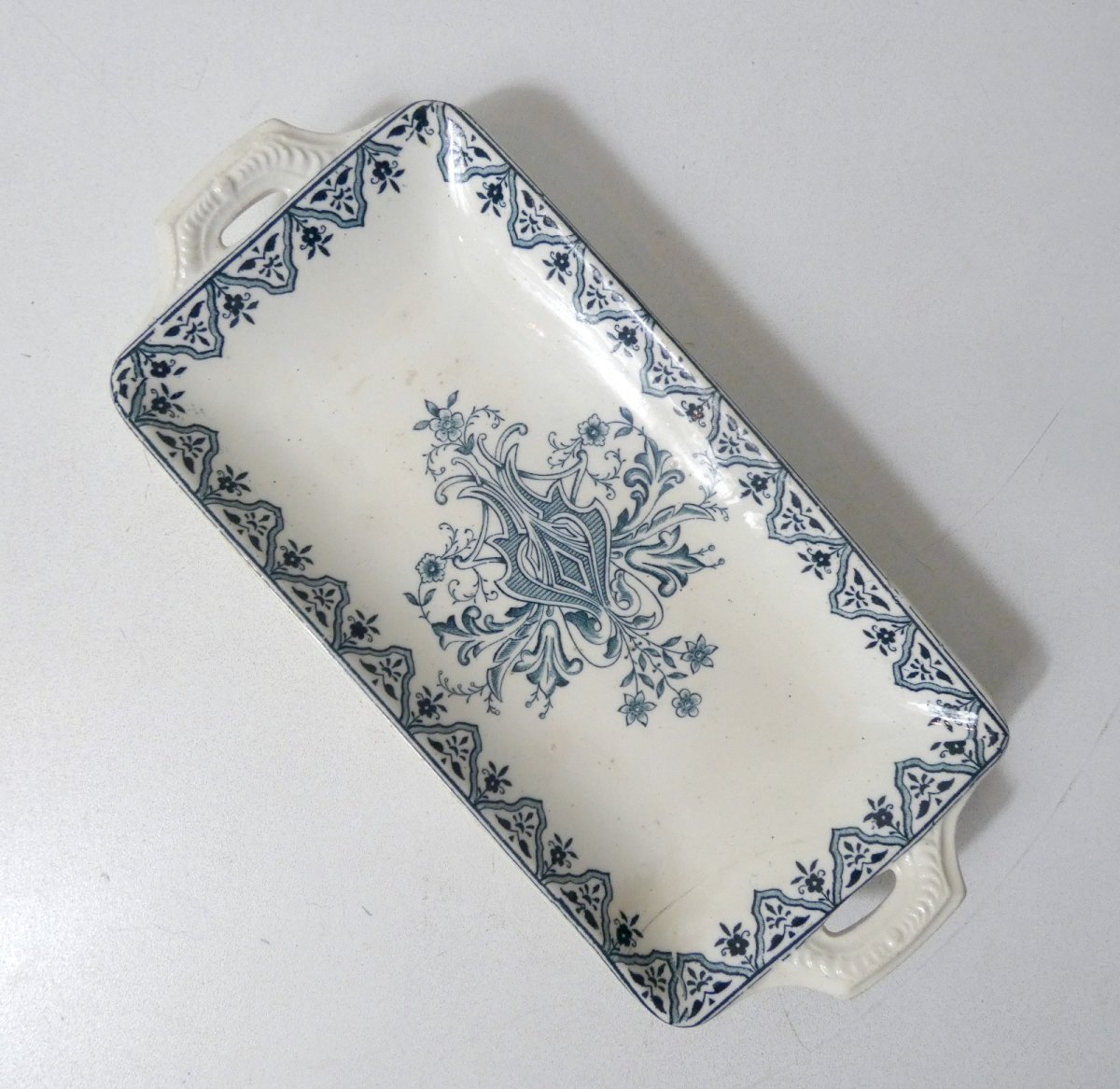 TERRE DE FER - SALINS - modèle ALHAMBRA, aux motifs bleu nocturne, Art Déco. Un ravier / petit plateau rectangulaire. 24 cm x 11 cm. Hauteur: 3 cm. Un cheveu. Jolie patine. Rare et charmant format Terre de Fer.