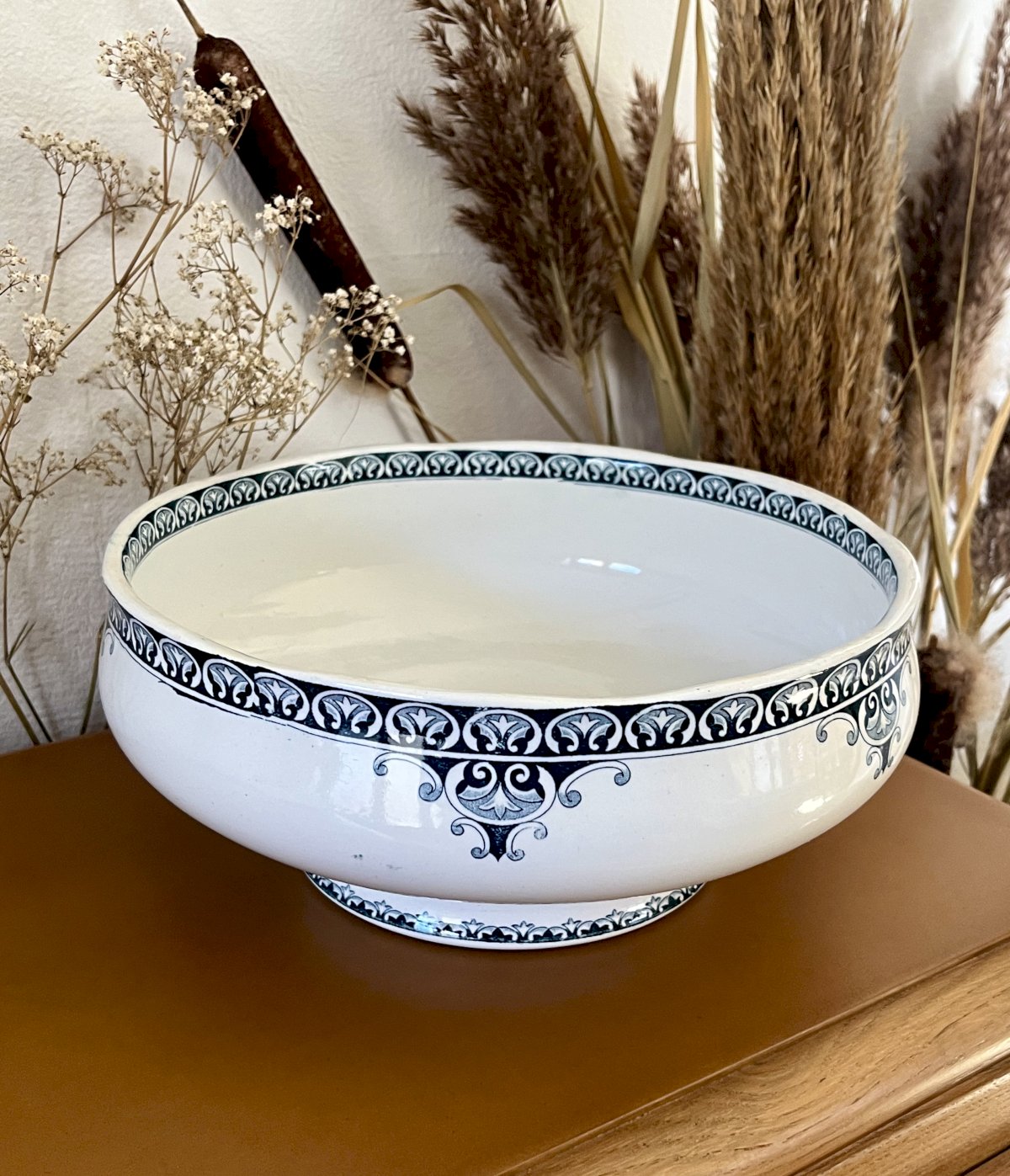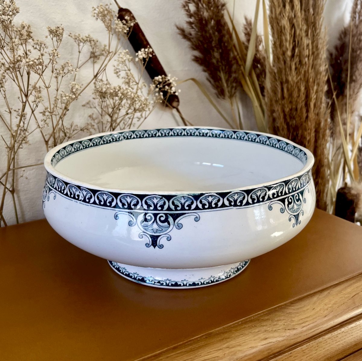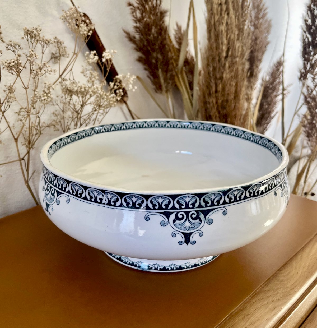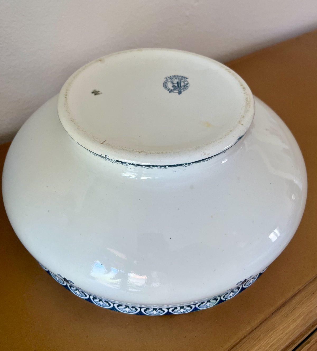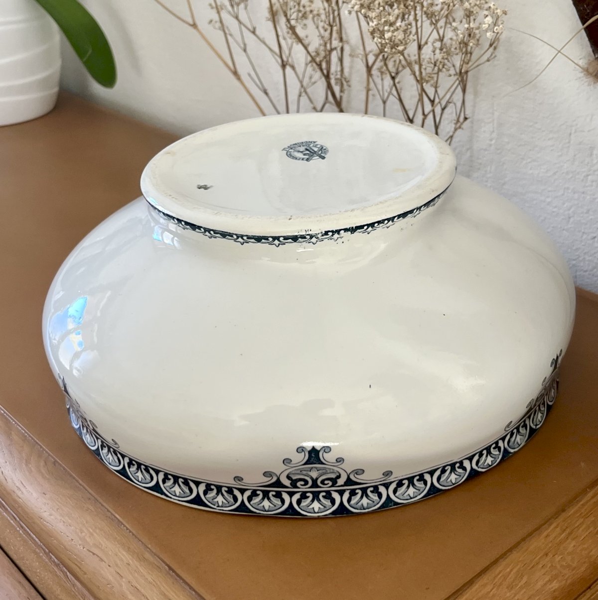 Epatez vos convives avec cet authentique saladier "ANDRINOPLE" en faïence dite porcelaine opaque ou appellation "Terre de Fer", à motif orientale bleu sur fond crème.
