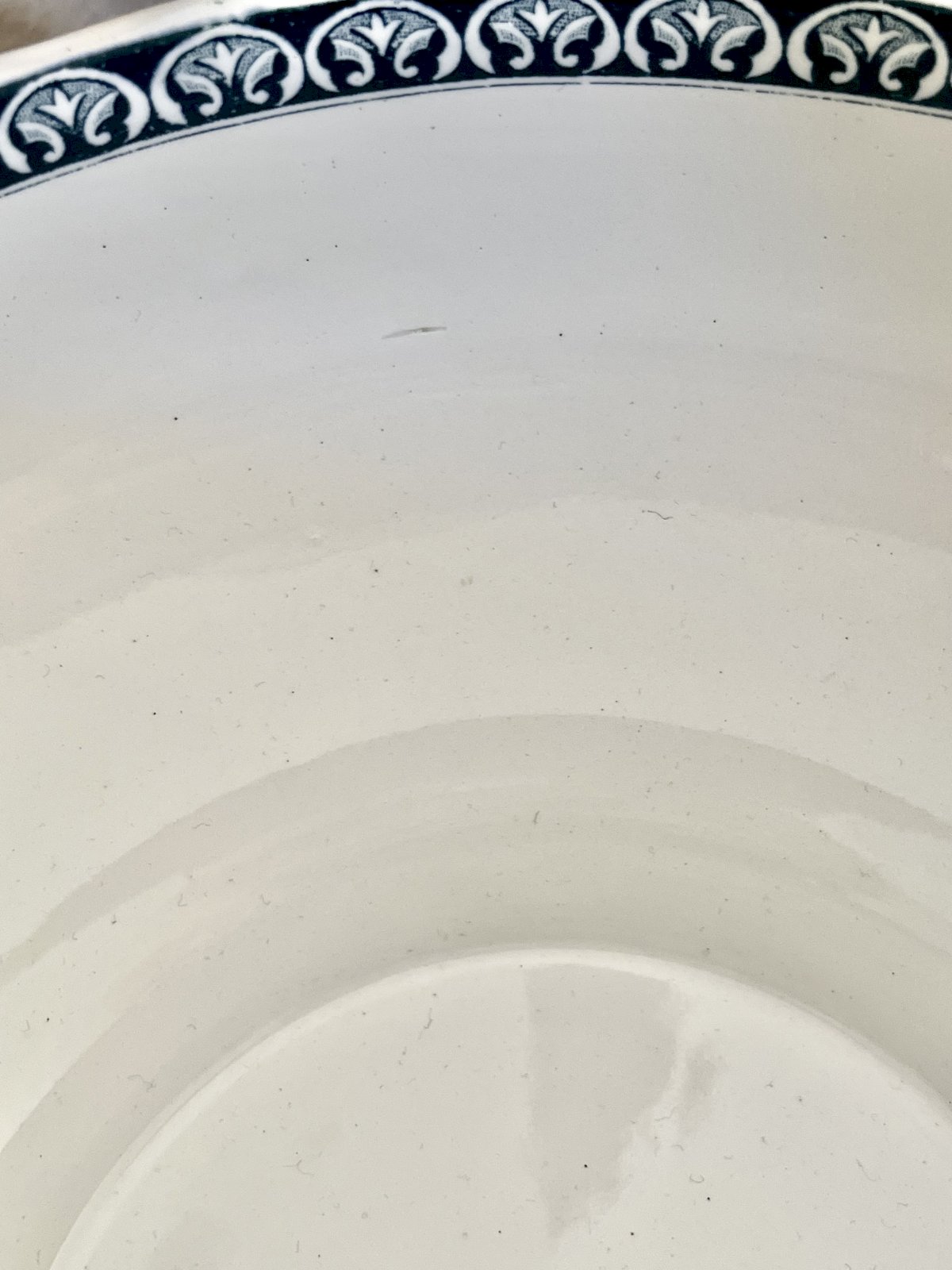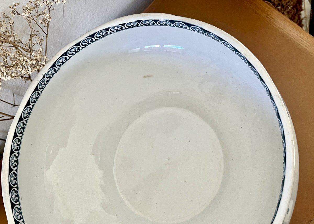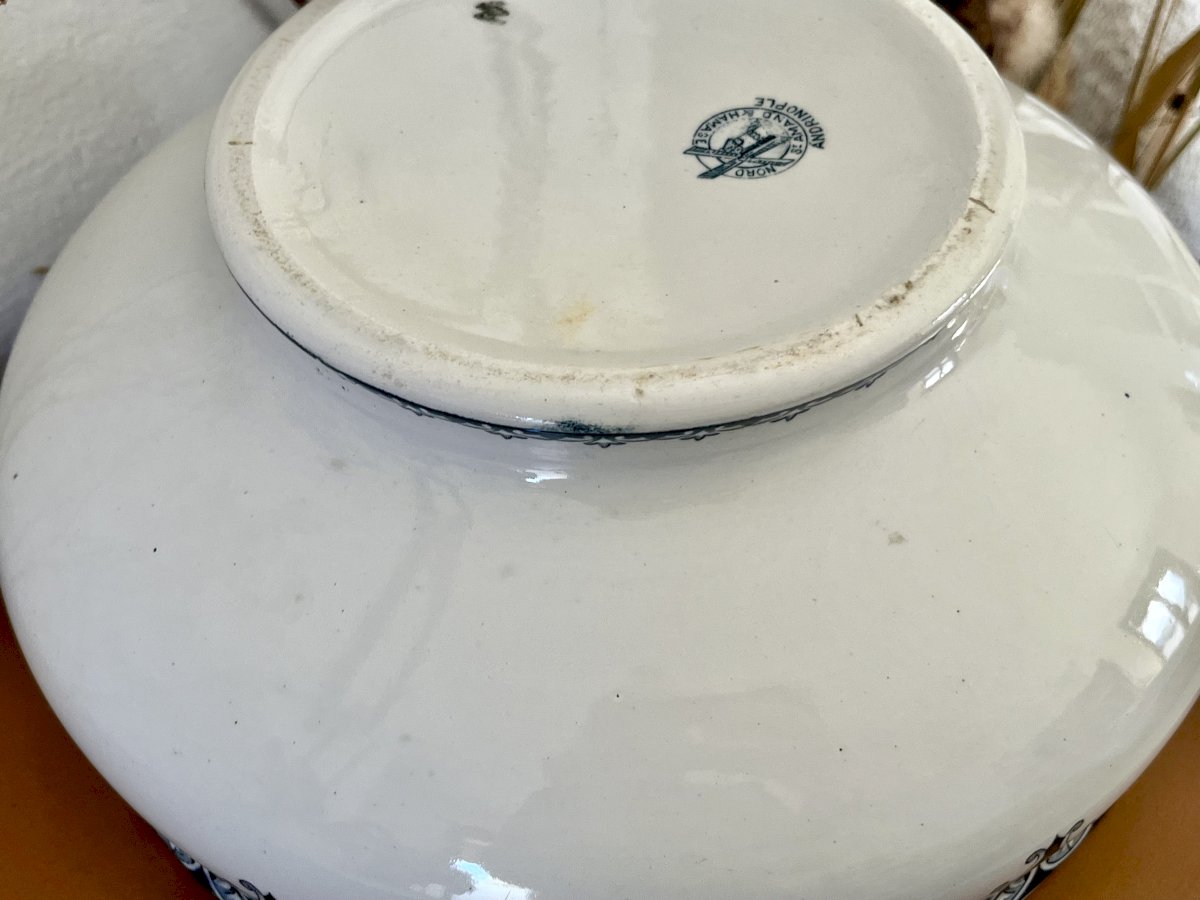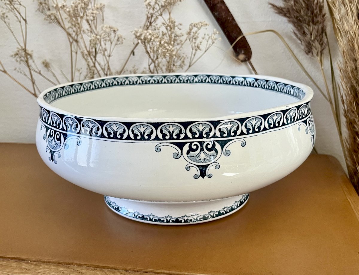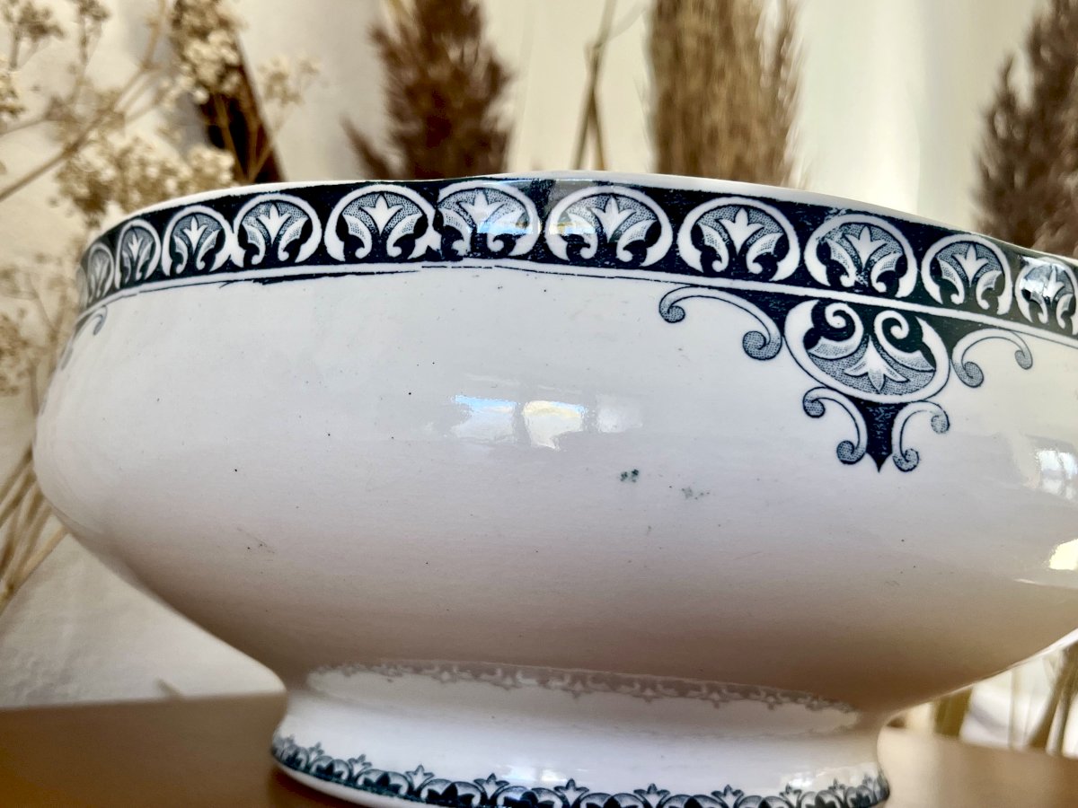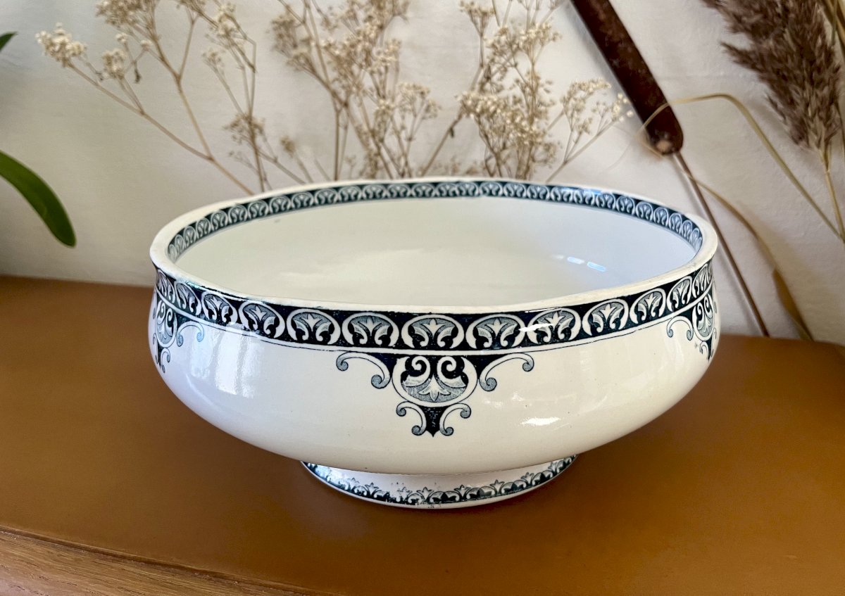 Epatez vos convives avec cet authentique saladier "ANDRINOPLE" en faïence dite porcelaine opaque ou appellation "Terre de Fer", à motif orientale bleu sur fond crème.