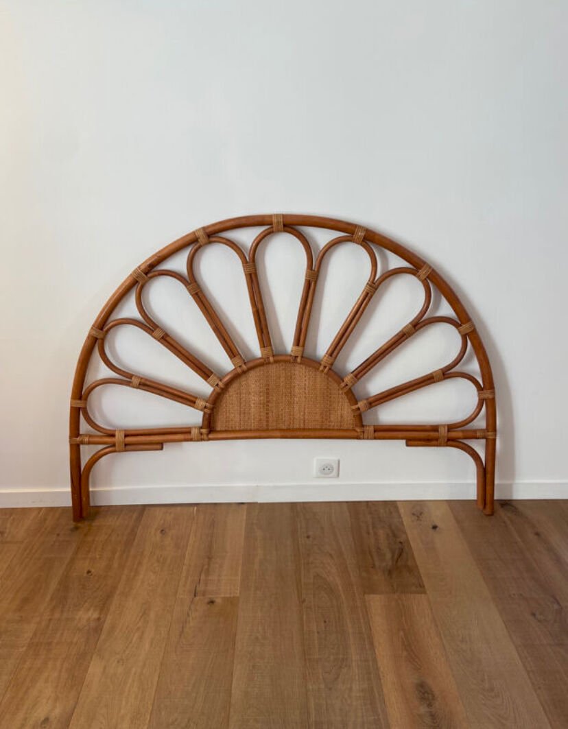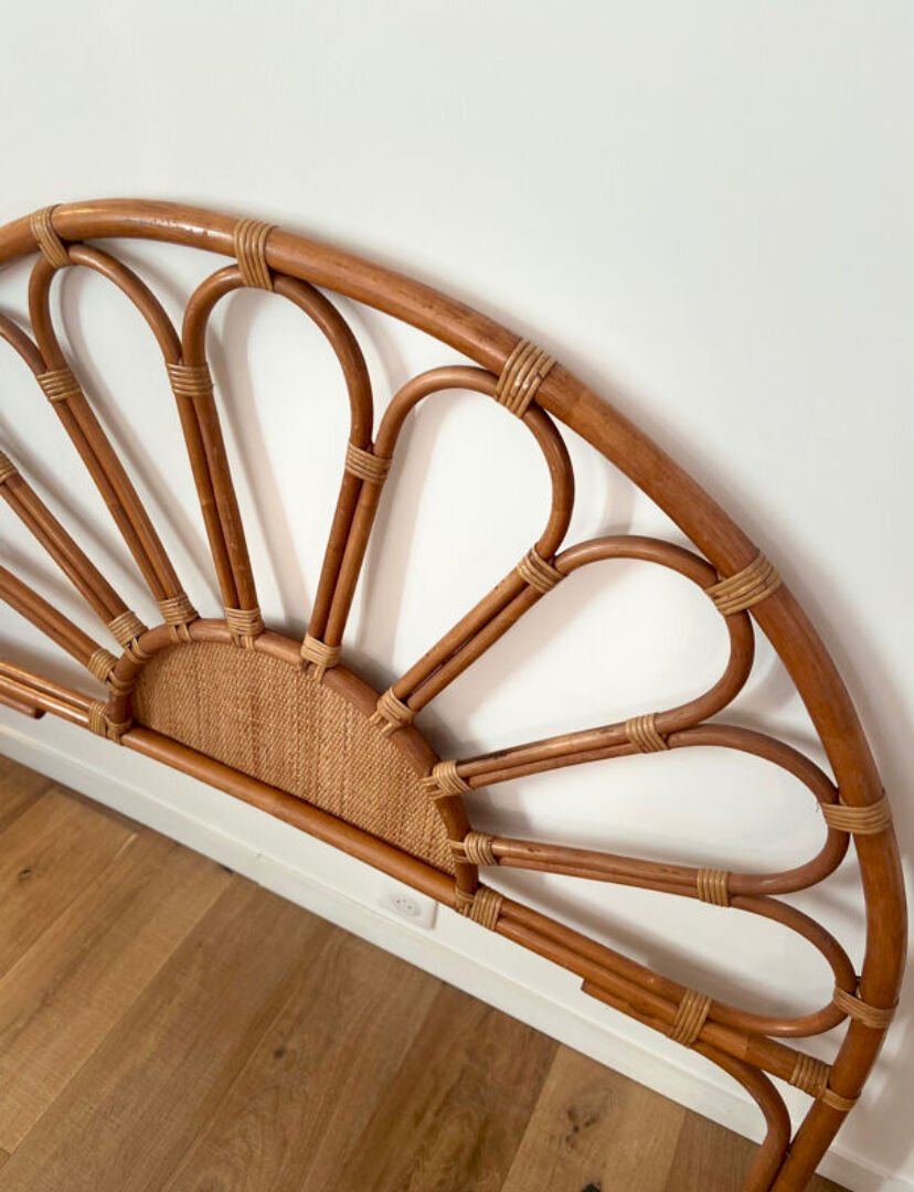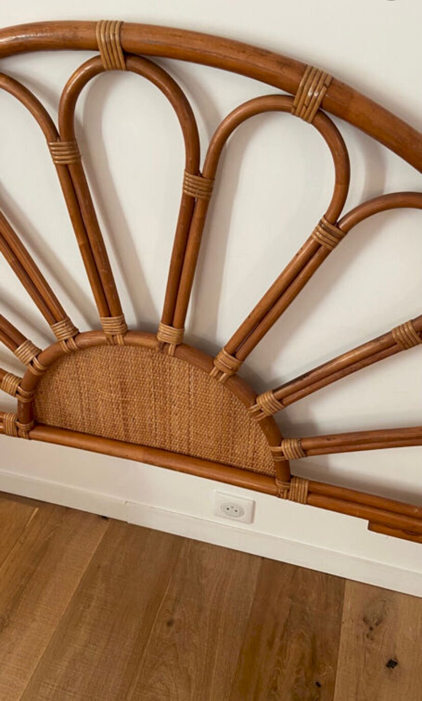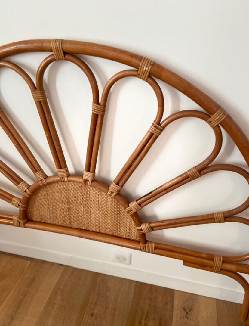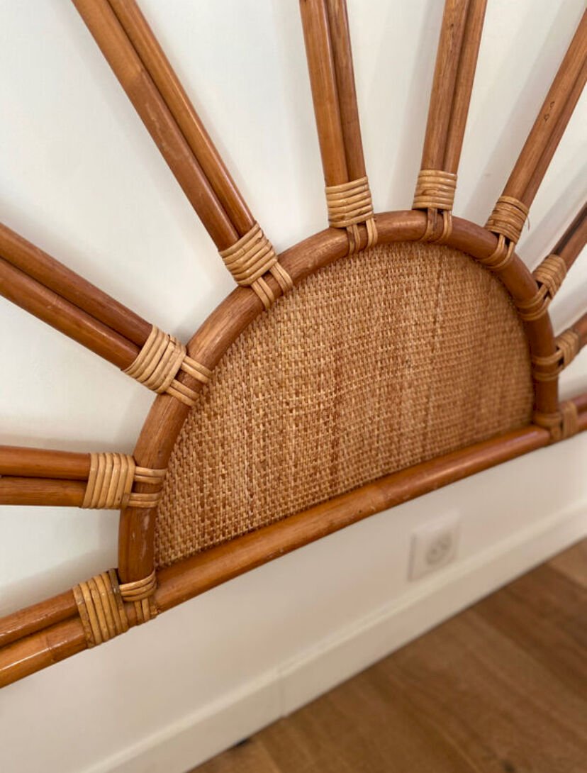Tête de lit en rotin et cannage vintage 1970 pour lit 2 places