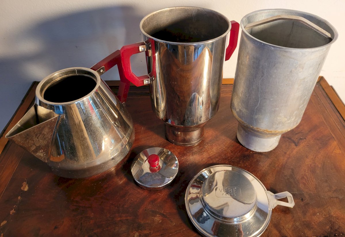Théière Art Déco avec infuseur Vébé inox & bakélite probablement 1920's 1930's Argenté/Rouge