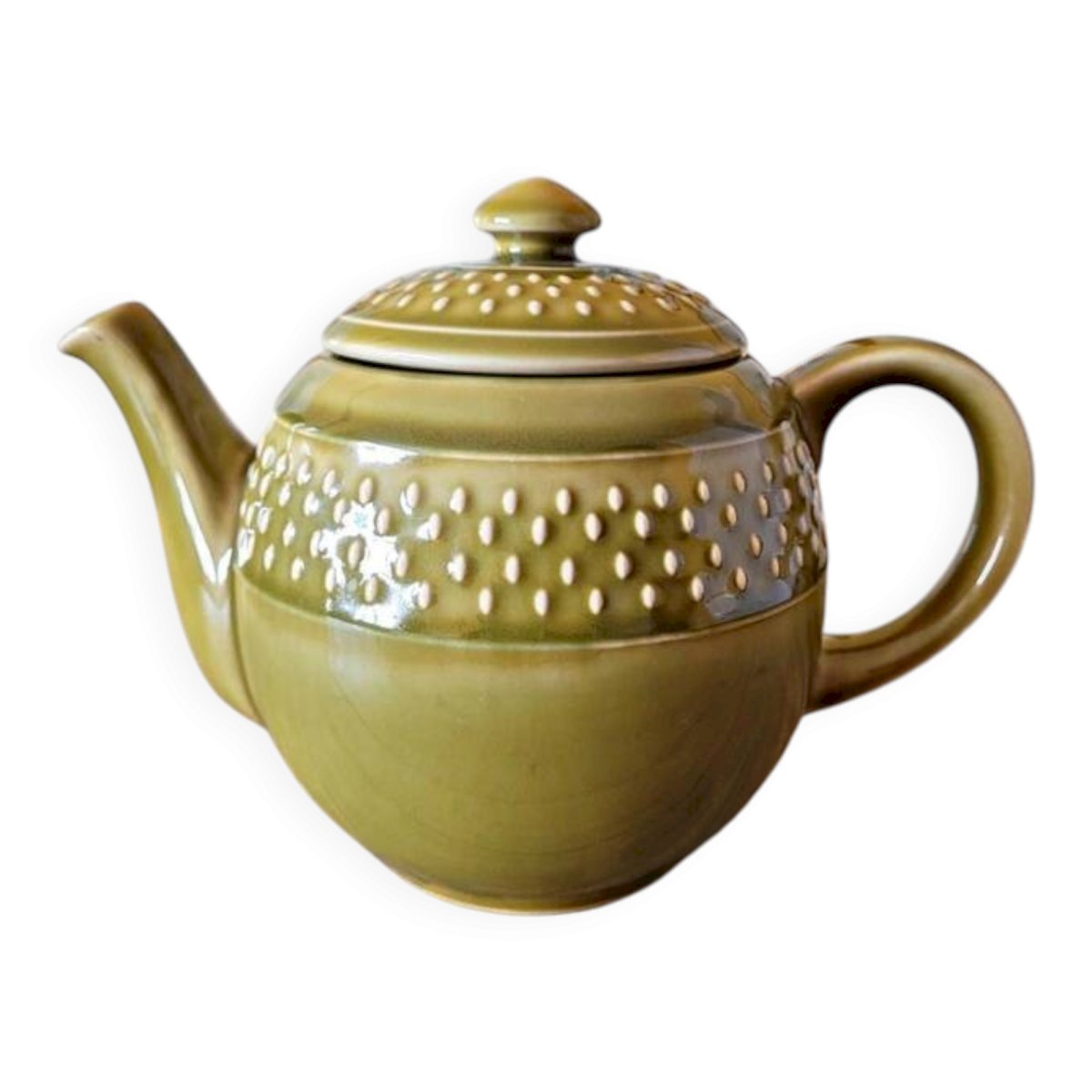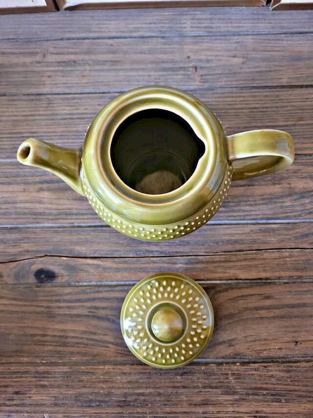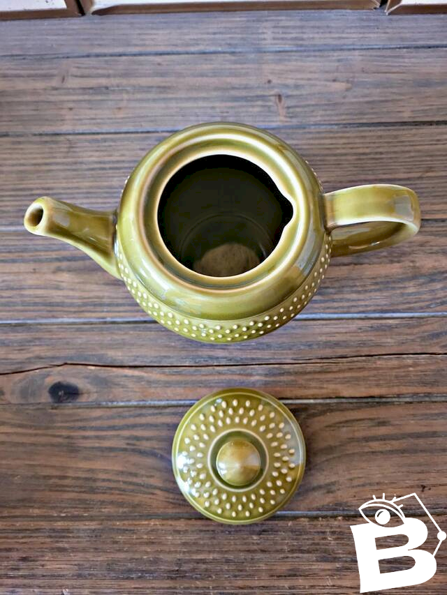 Théière Geneviève Lethu collection Grain de Riz de couleur verte.Une belle théière ou cafetière tout en rondeur qui peut contenir environ 0, 70-0, 80 cl.Elle apportera une touche de couleur à vos brunch et repas !Utilisée mais très bel état (traces légères, pas de casse).D’autres objets de la même collection sont disponibles (voir mes autres annonces).? diamètre au plus large 12 cm (diamètre ouverture 7 cm) environ X hauteur 15 cm environ.Poids de la théière: environ 740 gr.