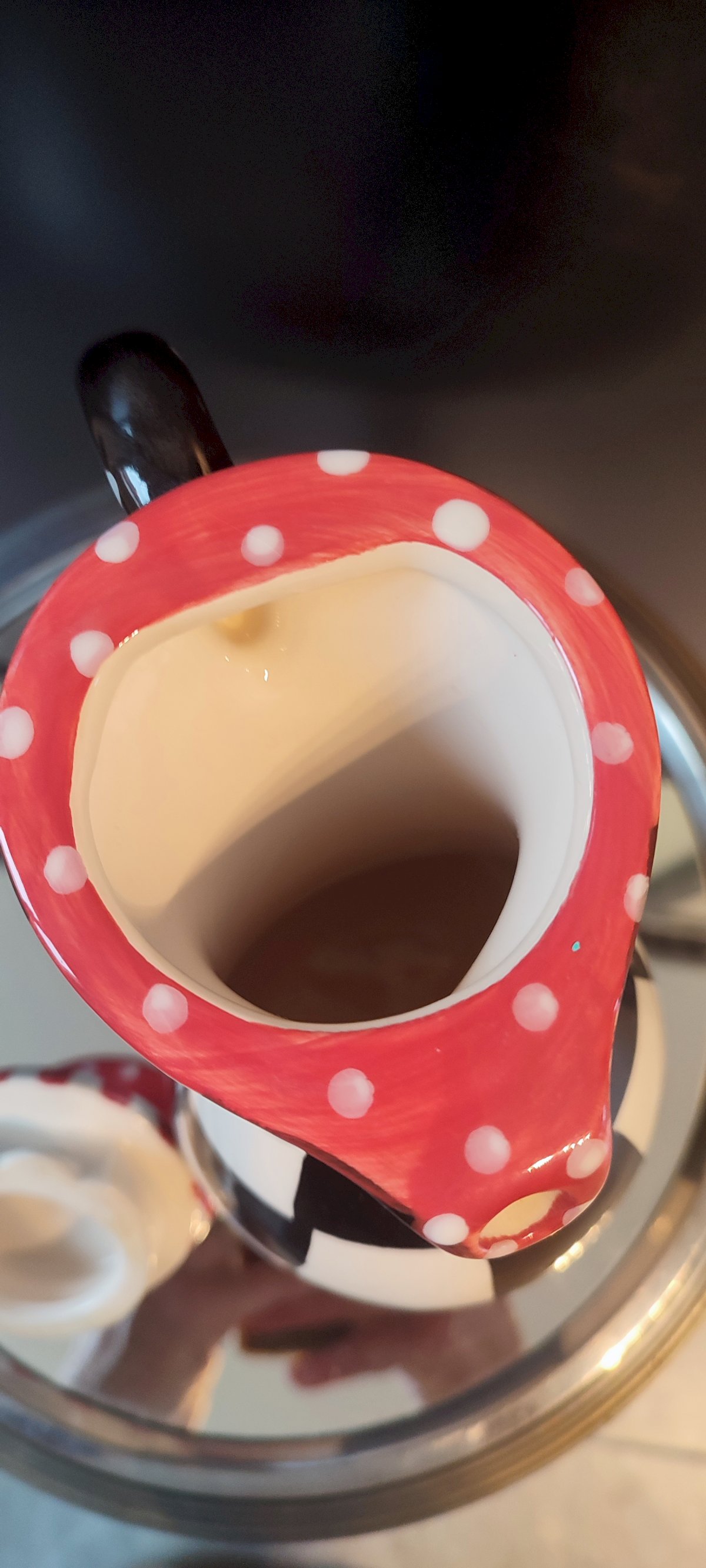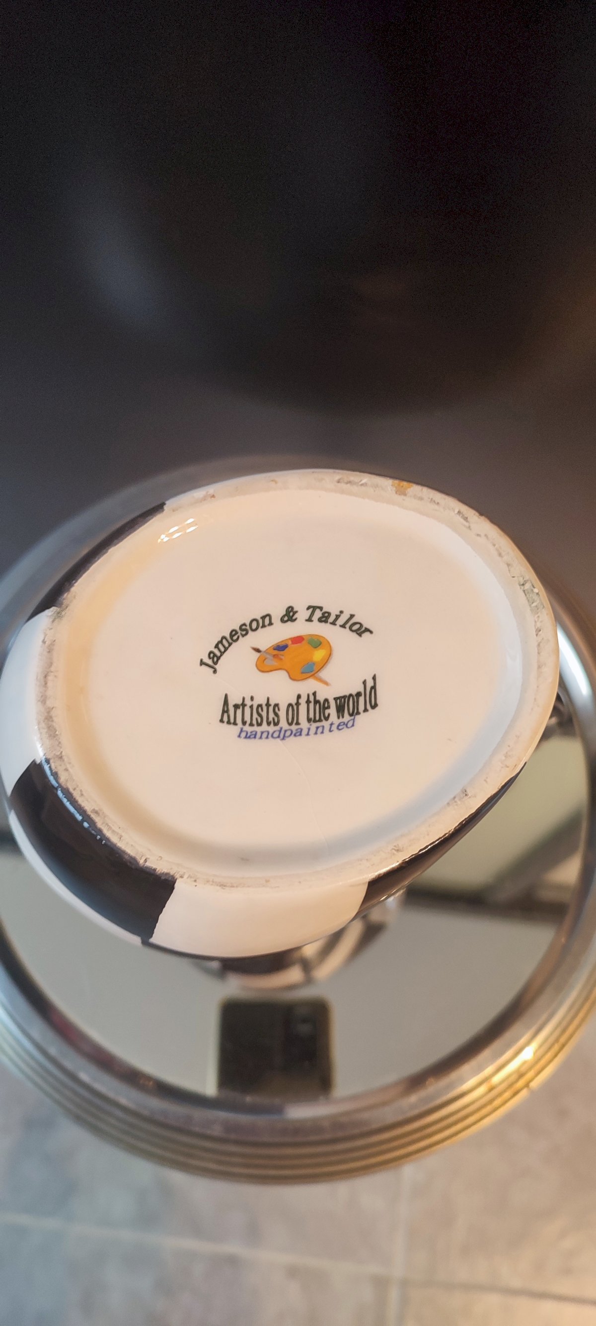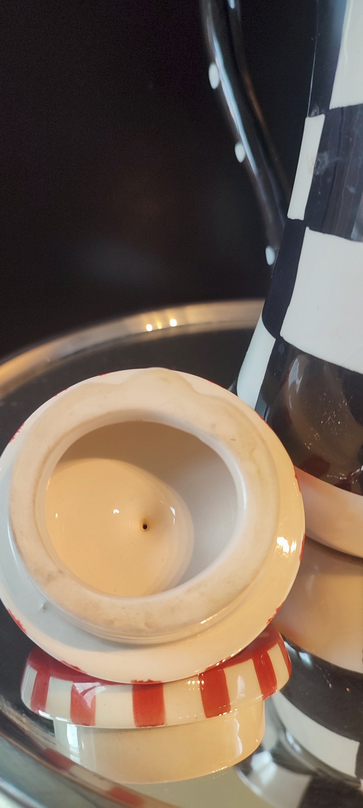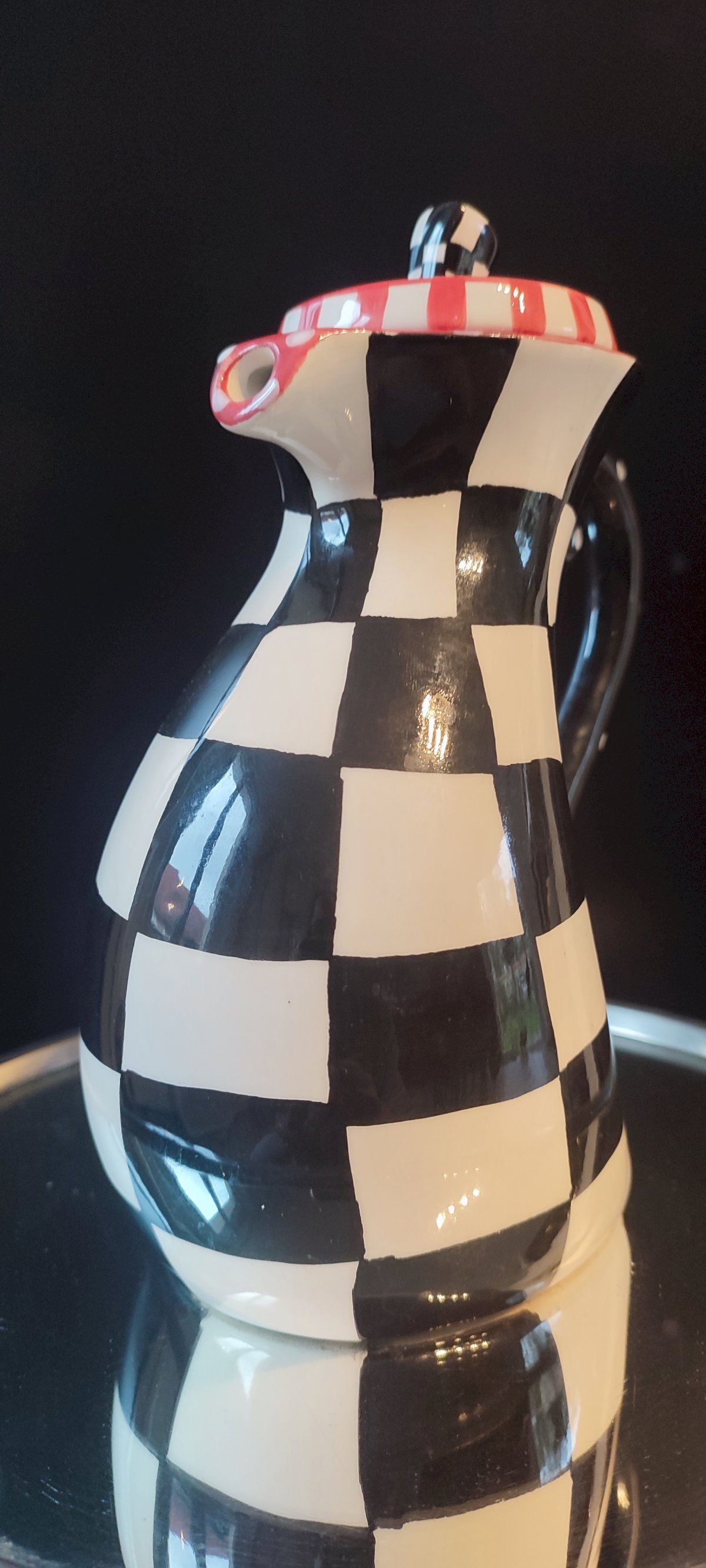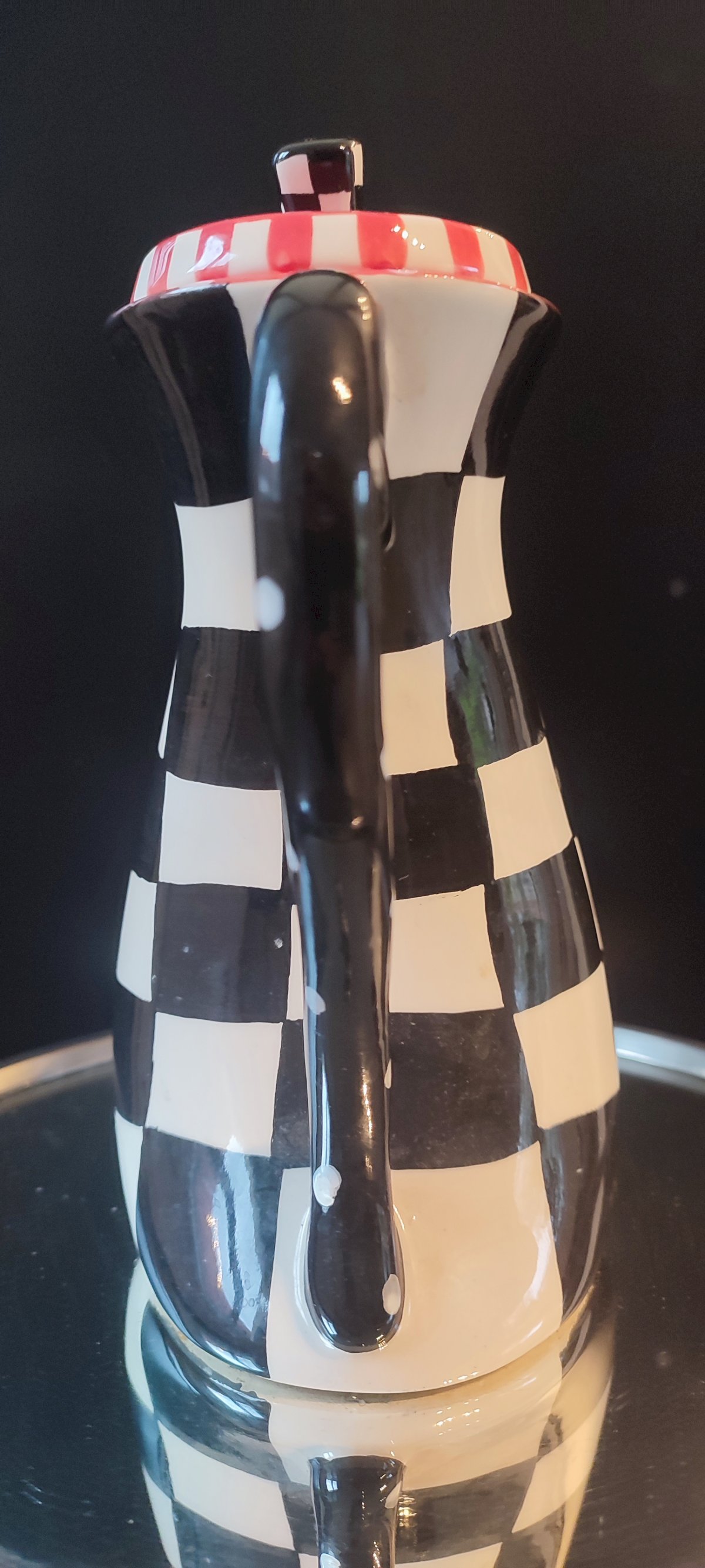 Décor damier noir & blanc peint à la main , glaçure brillante , couvercle présent et assorti, orné de rayures rouges élégantes. La poignée ponctuée de pois et la forme galbée et torsadée apportent une dimension presque sculpturale, typique des créations les plus recherchées de l’atelier anglais.