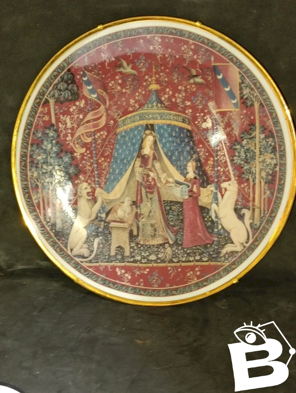Tres belle assiette en porcelaine de limoges signée Barre Andre en bon etat Angelica collection, the offering beau decor medieval diametre 26.5cm