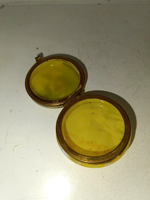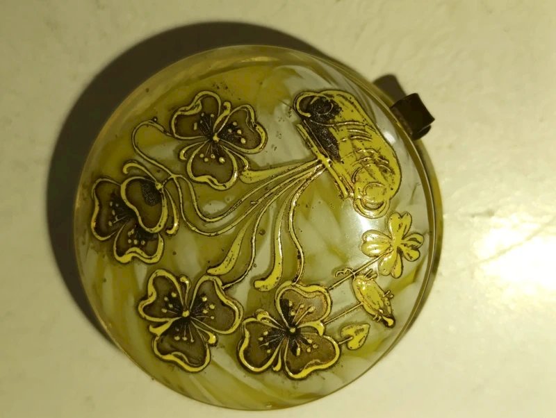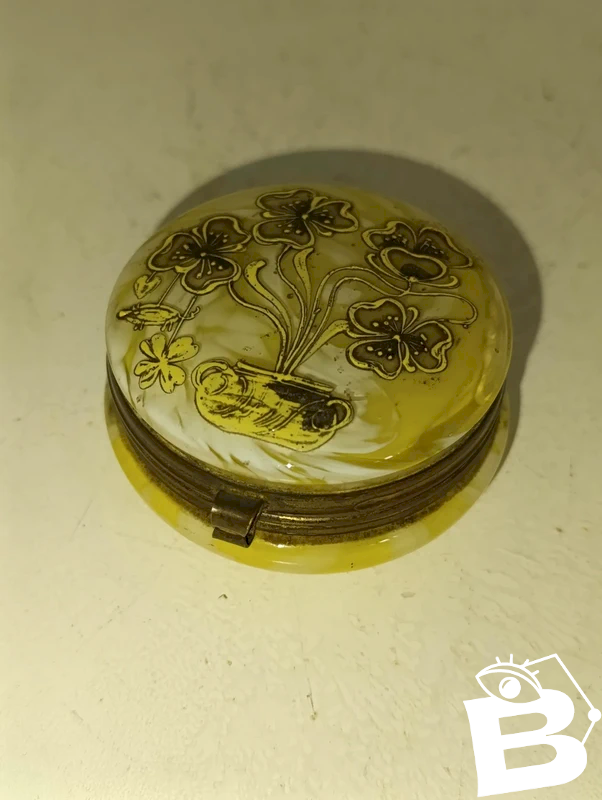 tres belle bonbonniere ancienne en verre jaune incruste de blanc et decor floral en bon etat epoque a definir un peu d'usures normales du decor diametre 6cm hauteur 3.5cm
