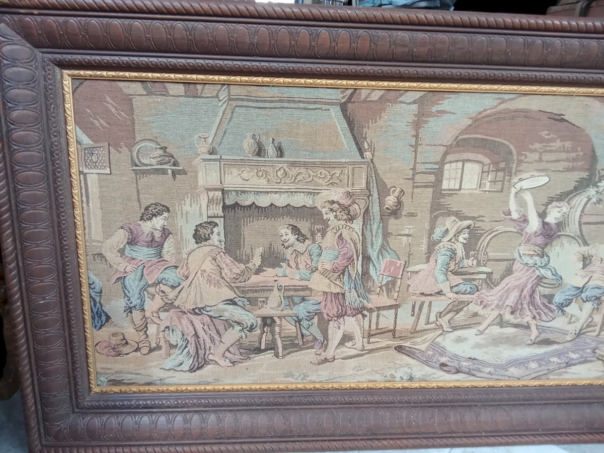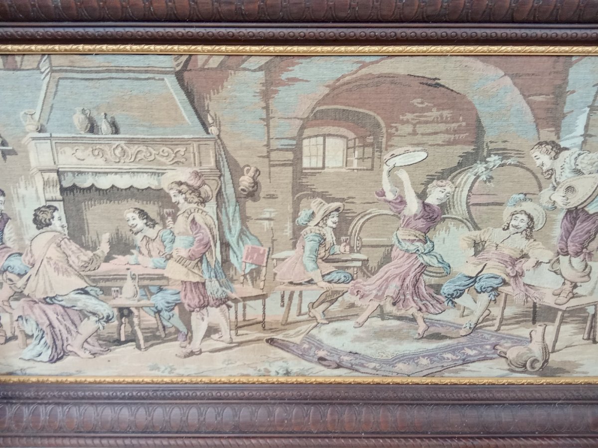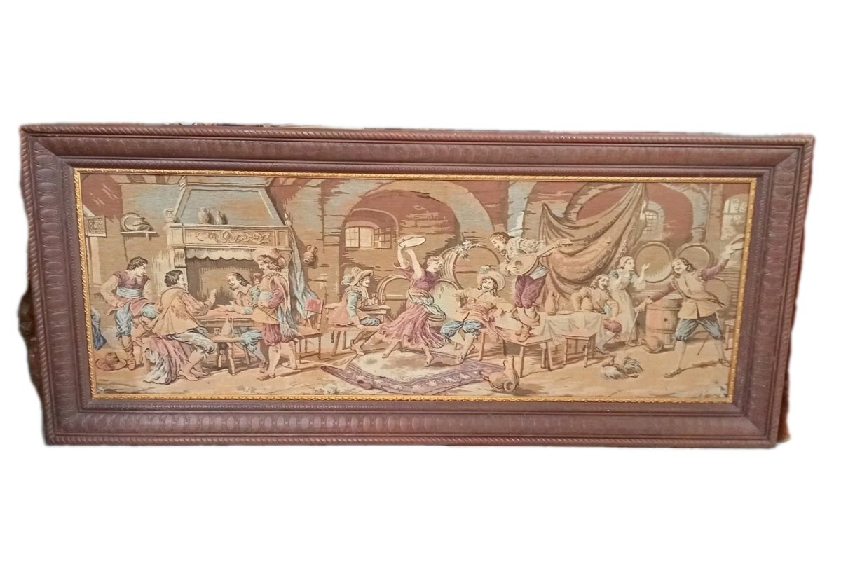 Grande tapisserie ancienne Scène médiévale Moyen âge Décoration château Bel encadrement en bois Bon état. Dimensions totales 201 cm x 85.7 cm Dimensions tapisserie 176.cm x 60.2 cm Livraison possible par transporteur.me contacter pour le tarif selon votre région