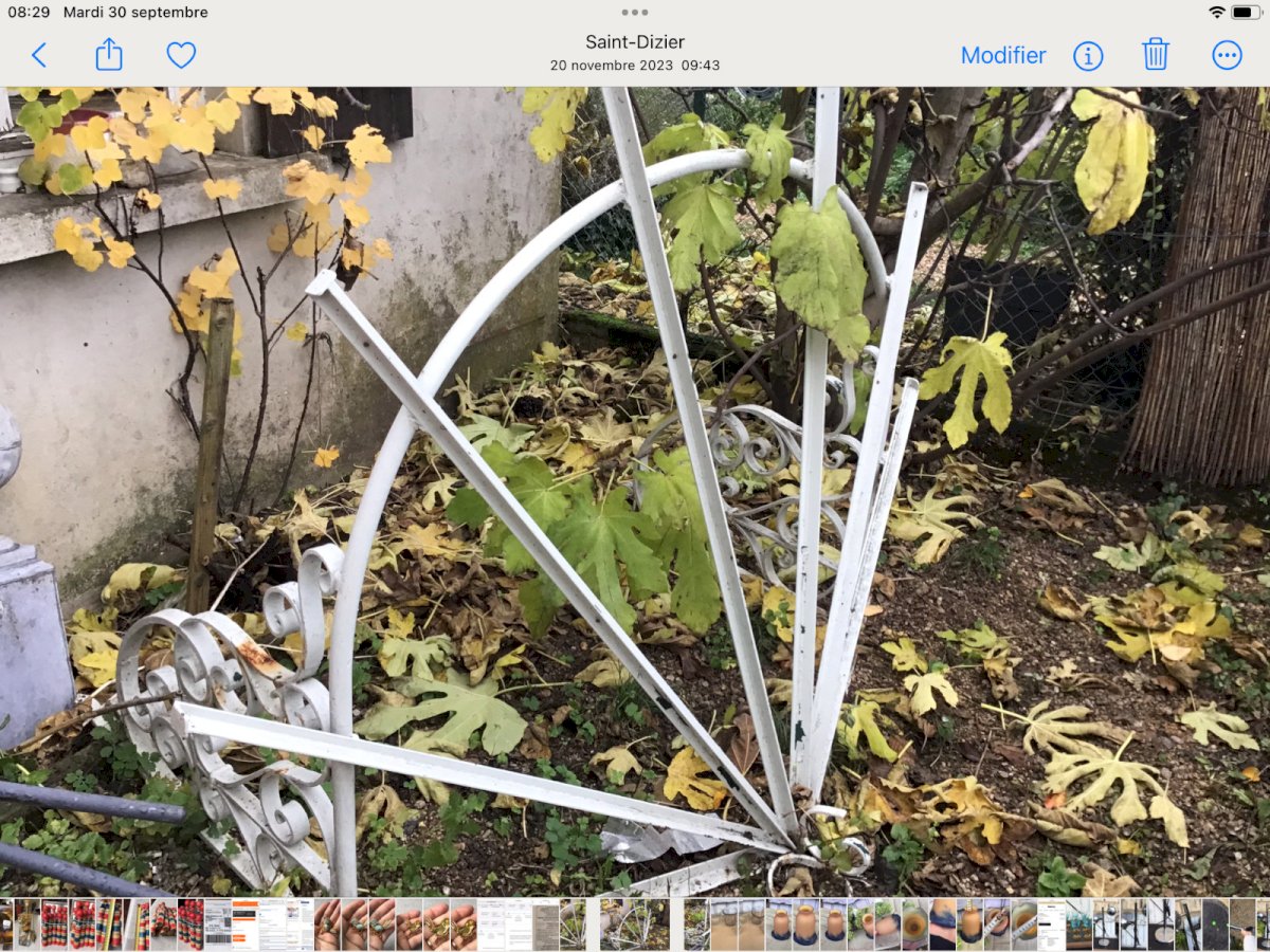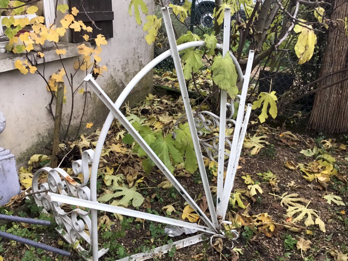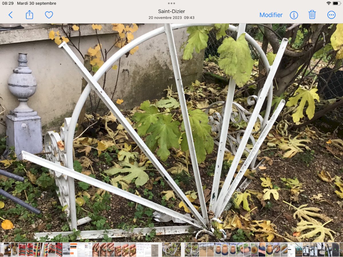 Pas de carreaux.  Il faut faire un gabarit et les faire fabriquer  Longueur environ 135 cm.  Jolies volutes  Et arrondie sur le devant Type:Jardin, Décoration extérieure Période:Design du XXème Sous-type:marquise Pays de fabrication:France Matière:Fer Forgé