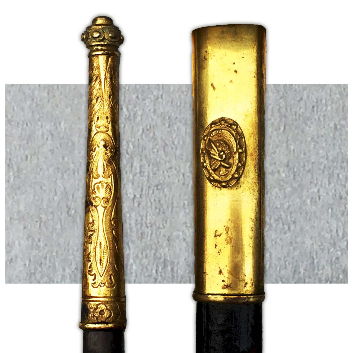 Superbe épée de général de brigade français du second Empire. Garde décorée d'ornements floraux, feuilles de lauriers et drapeaux avec l'aigle du second empire sur le clavier et les deux étoiles de général de brigade, garde à une branche mobile, fonctionnelle, avec beaucoup de dorure d'origine (95%). Superbe lame brillante dans son état d'origine avec les traces de la première taille de la manufacture sur le talon de la lame (ce qui est plus qu'exceptionnel...). Poignée en corne filigrannée, dorure bien présente. Fourreau en cuir avec garnitures en bronze doré, décorées également, tout simplement superbes ! Dragonne bien présente également, pas de jeu au niveau de la poignée ! Très agréable à tenir en mains et à observer en vitrine ! Splendide pièce, totalement originale ! Une épée qui probablement a très peu servie et a été très bien entretenue au vu de la présence du fourreau, du filigranne et surtout de la dorure en abondance (90-95%) !