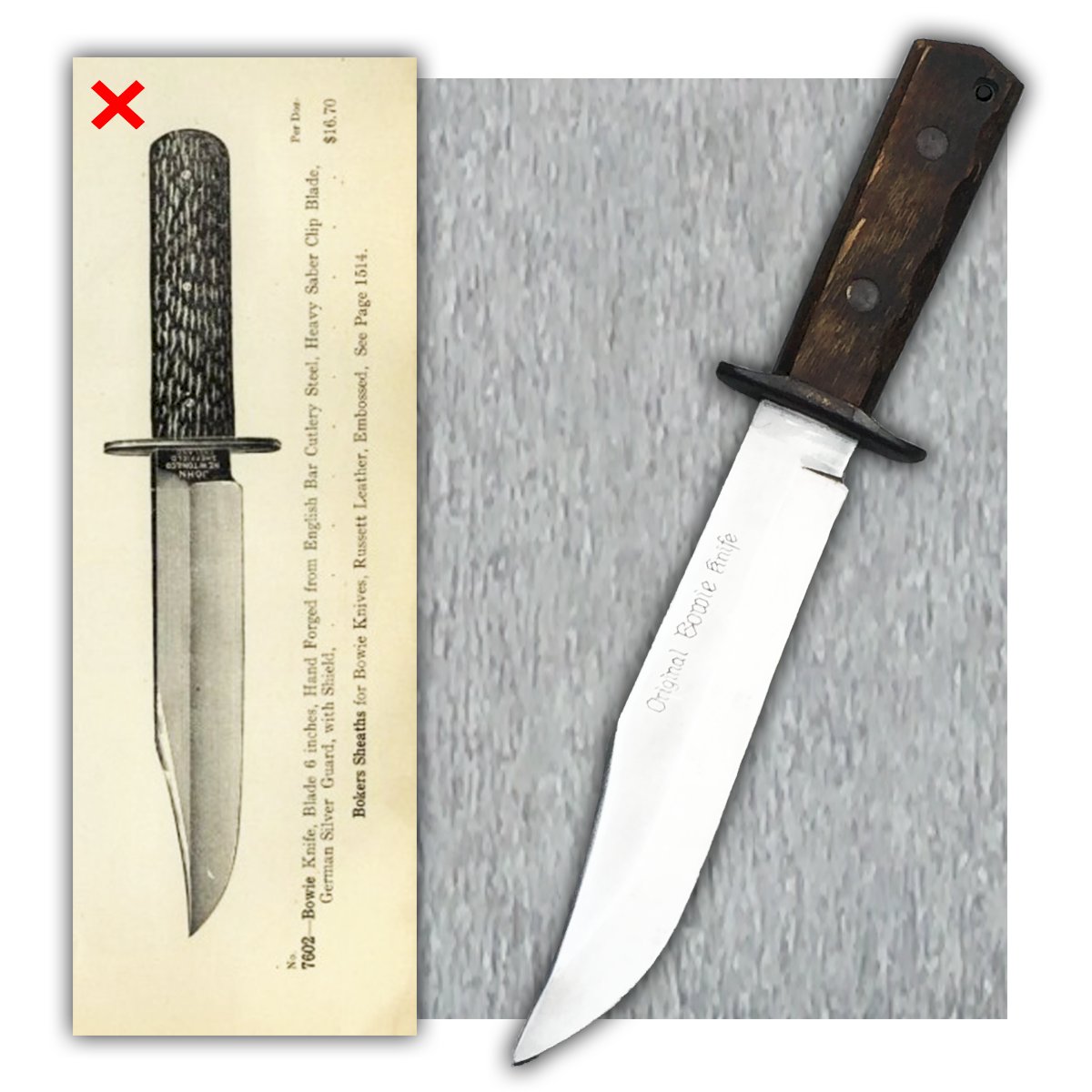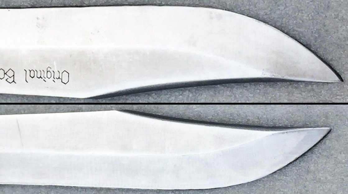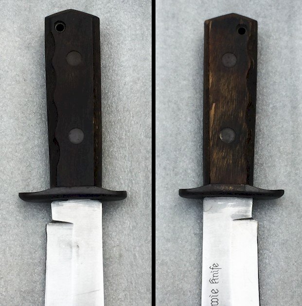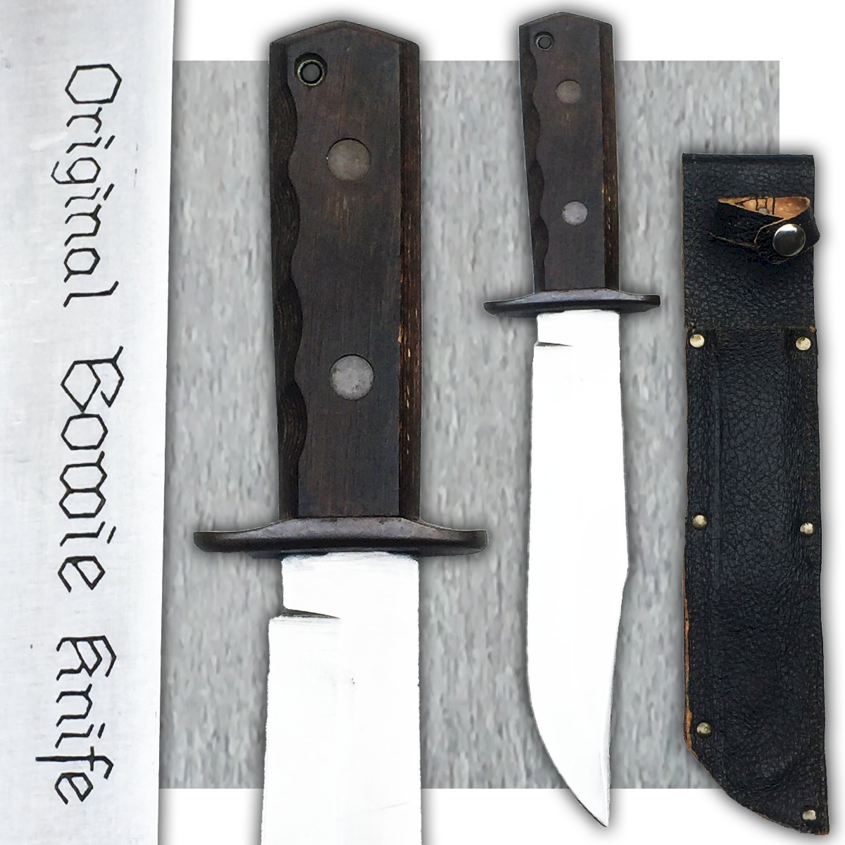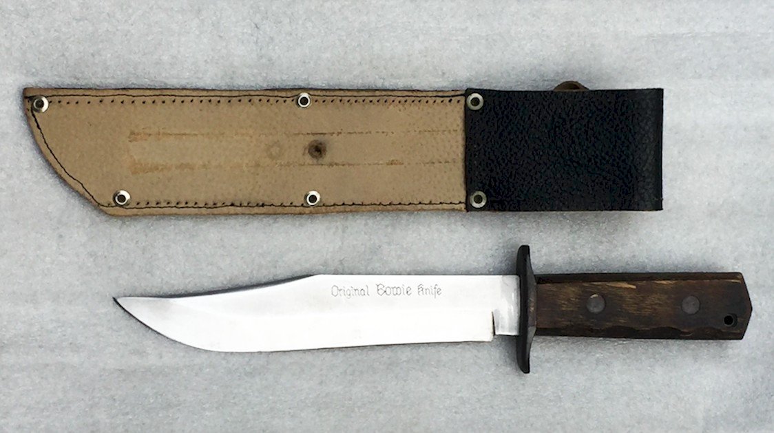 Très rare couteau / machette produit(e) entre 1970-90. Fabricant de lame Original Bowie Knife. Pas de jeu, très solide ! Superbe lame massive, avec quelques traces dûes au temps. Gravure sur la lame : '' ORIGINAL BOWIE KNIFE... ''. Superbe et grand poignard totalement original, très agréable à tenir en mains et encore plus à observer dans votre vitrine ! Avec son fourreau ! Petit prix !