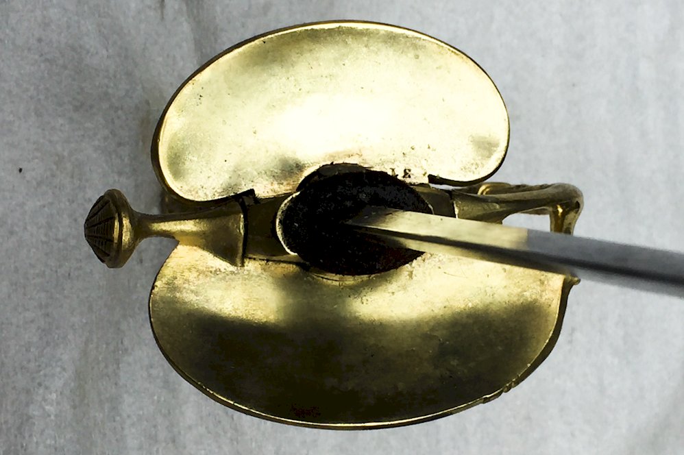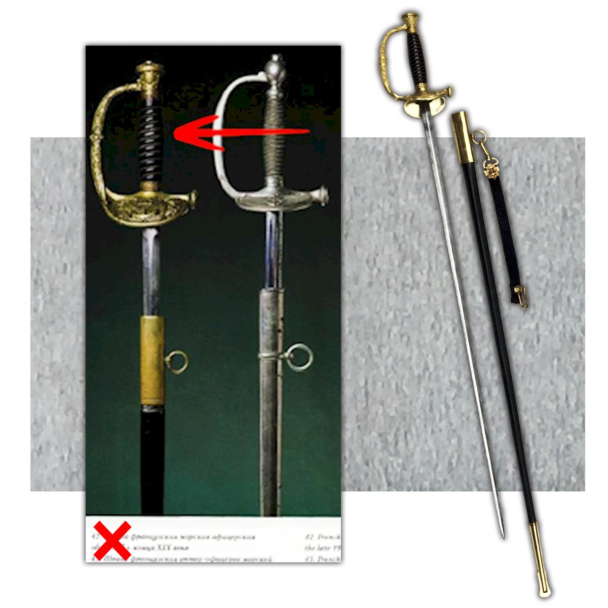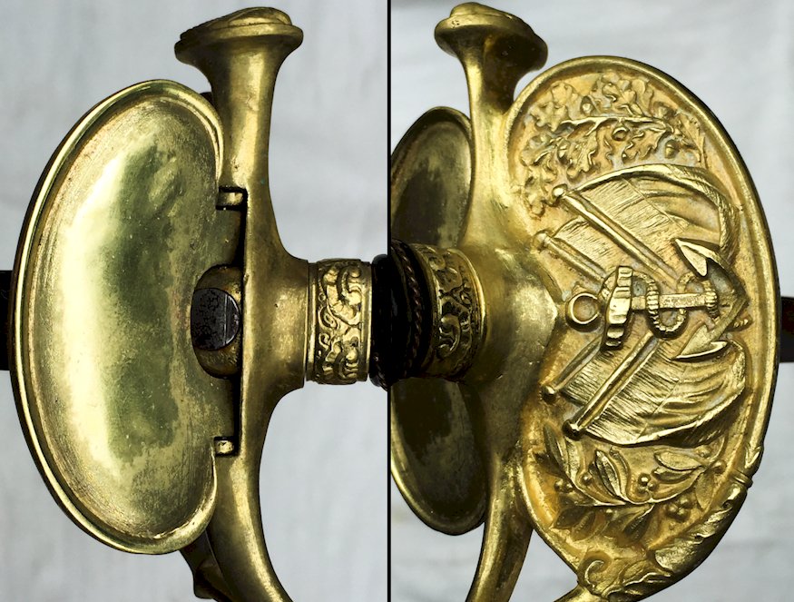 Rarissime et superbe épée de la marine française. Poignée et graniture en bronze doré. La poignée comporte des reliefs marins, clavier complet et fonctionnel, encre de la marine sur la garde, magnifique ! Le fourreau est en bois recouvert cuir noir avec des garnitures en bronze doré. La lame est très belle, triangulaire, dans son jus, superbe ! Avec sa rare attache avec garniture de marine en bronze doré (encre...). Marquage : '' 31 '' sur la garde. Une superbe pièce, très agréable à tenir en mains et encore plus à observer dans sa vitrine de collection, 100% original et rare.