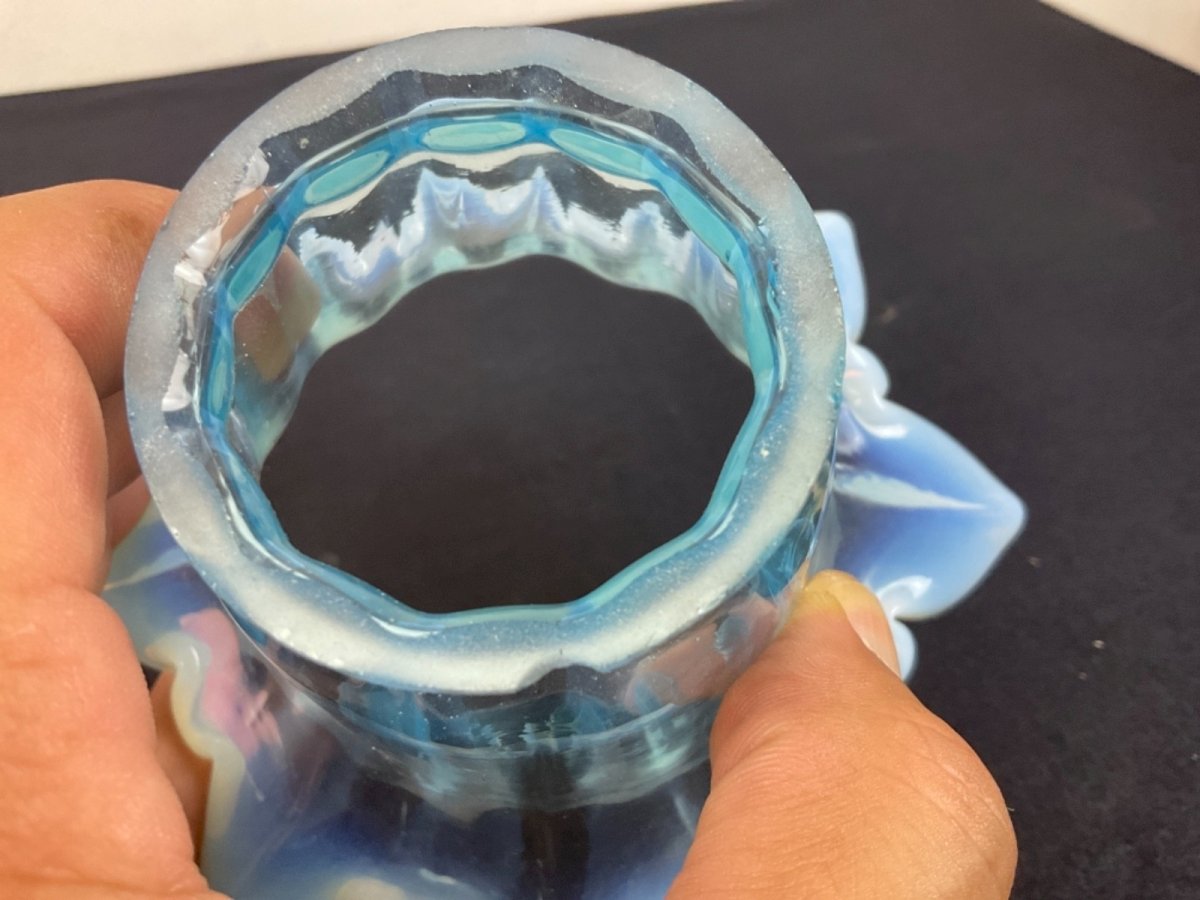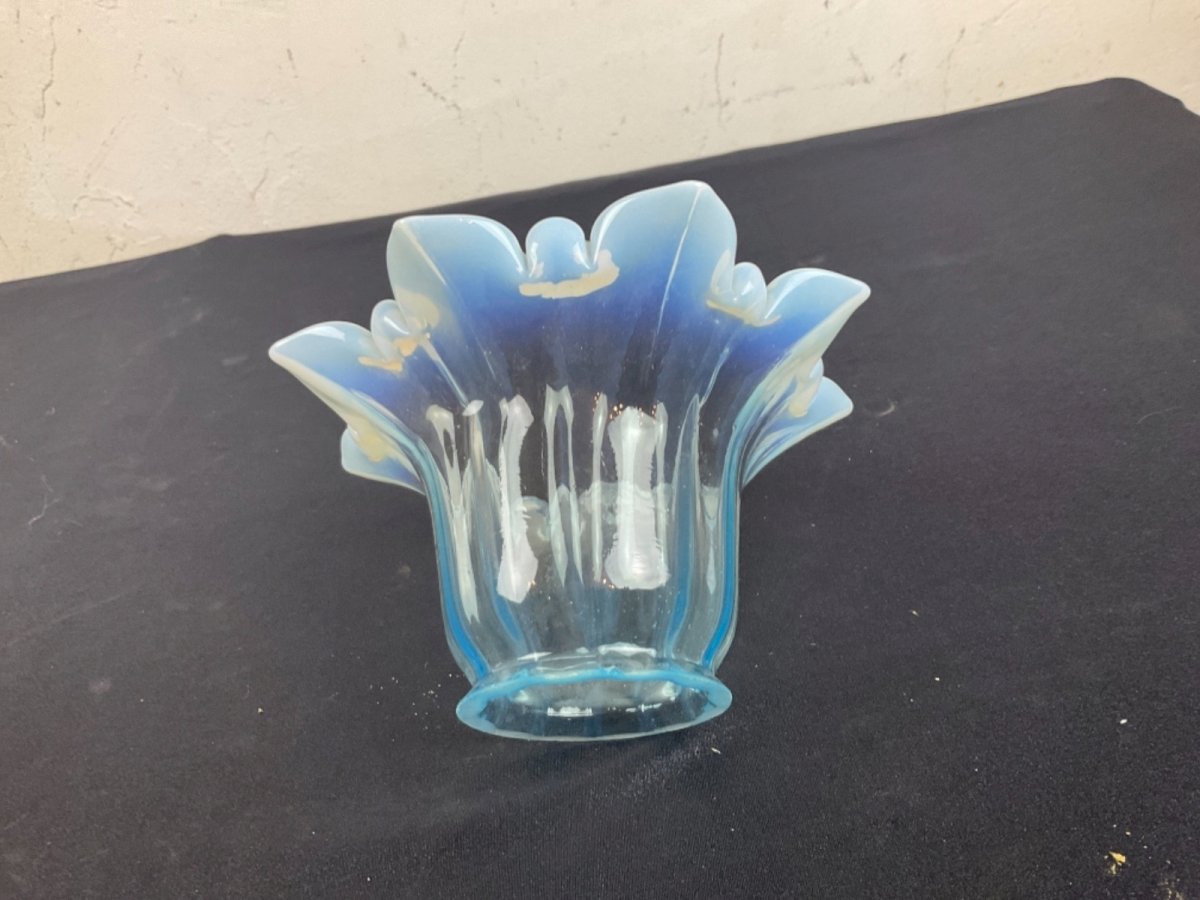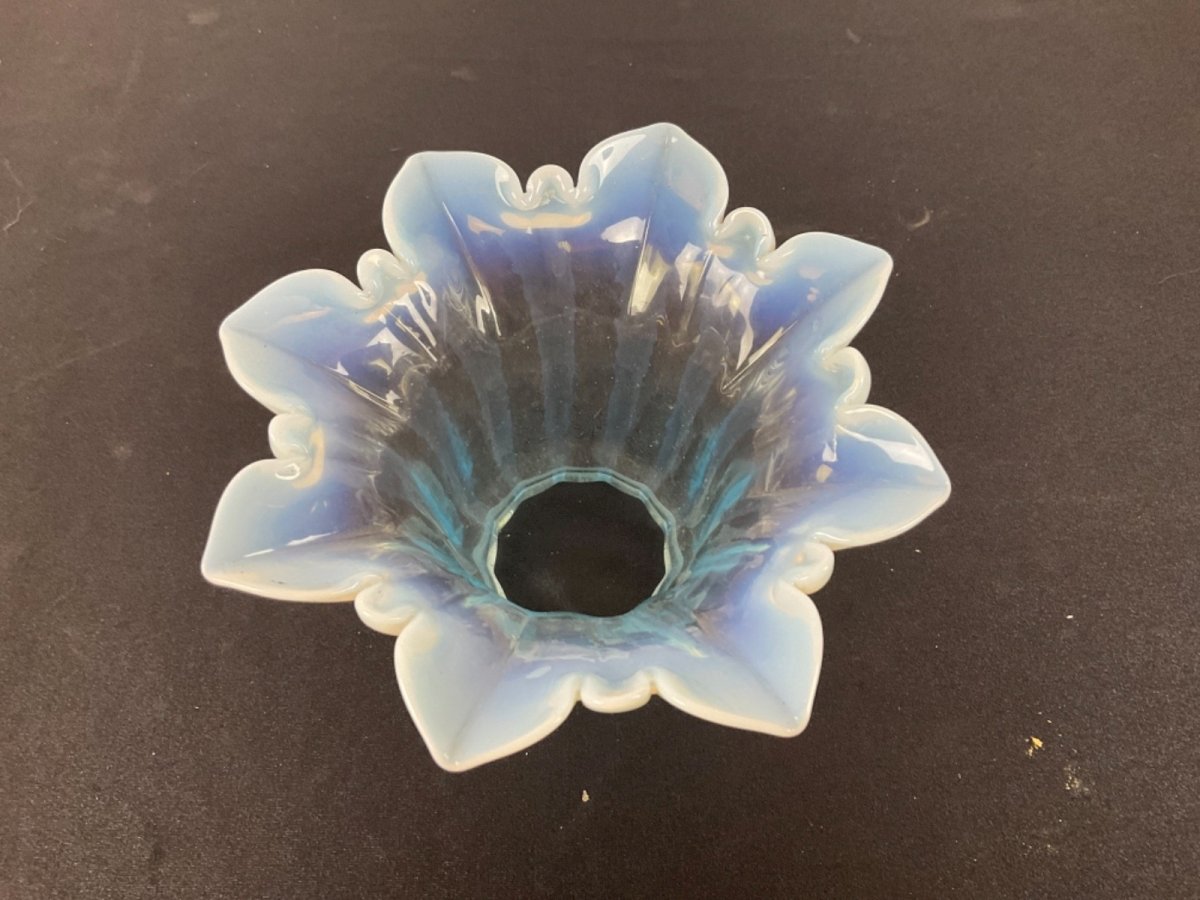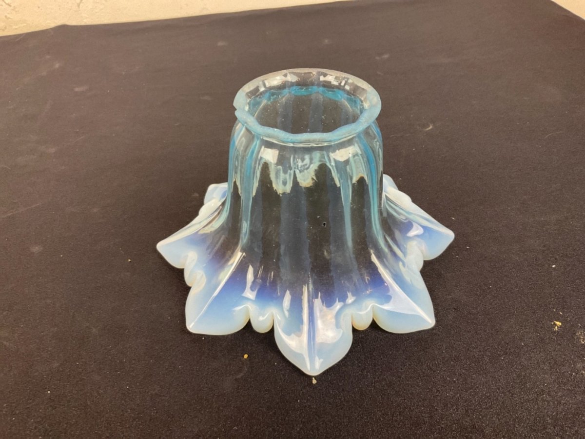 Tulipe de LAMPE à PETROLE  bleu , baccarat, Clichy Hauteur : 8 cm Diamètre extérieur au culot : 5,5 cm  Diamètre extérieur haut : 15 cm Type:Lampe à huile, Pétrole, Gaz Période:XIXème et avant Sous-type:Intérieure Couleur dominante:Bleu Matière:Verre