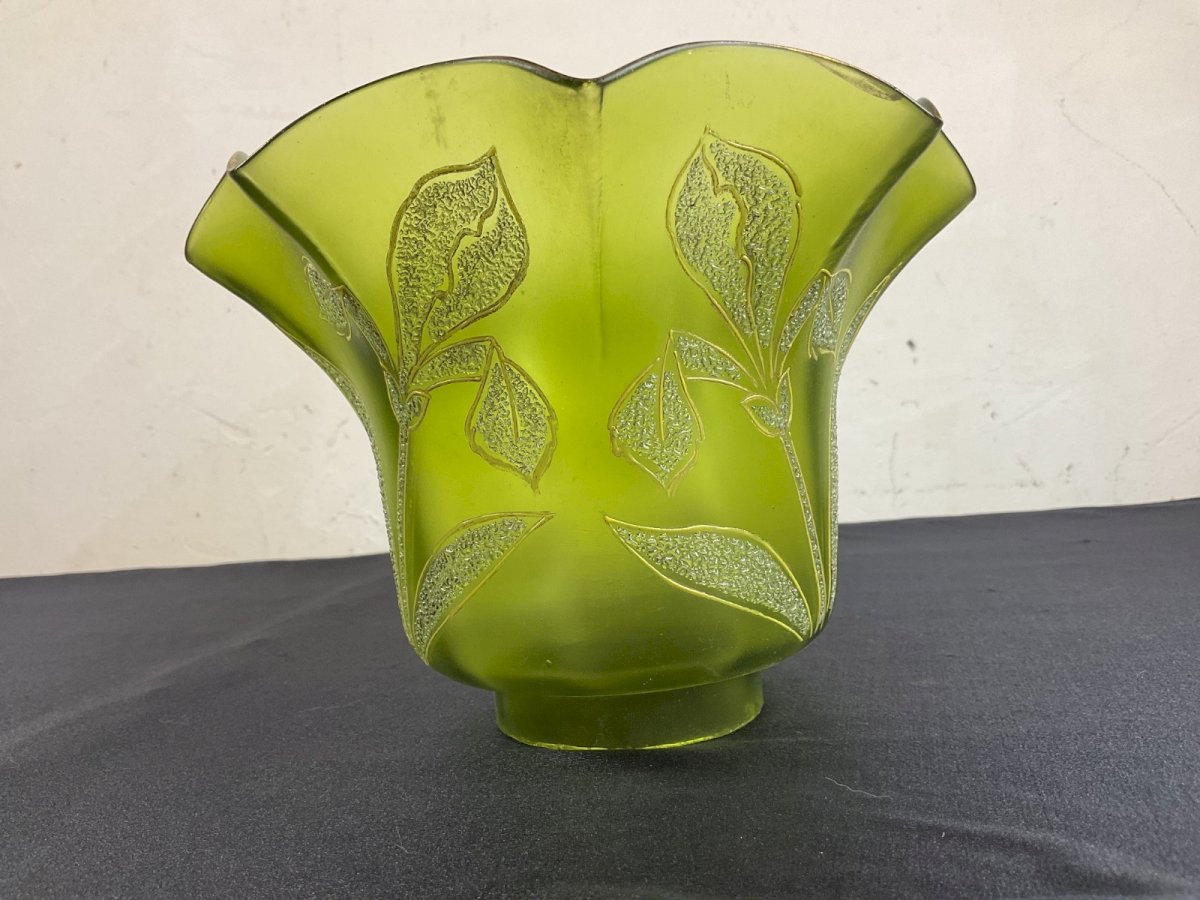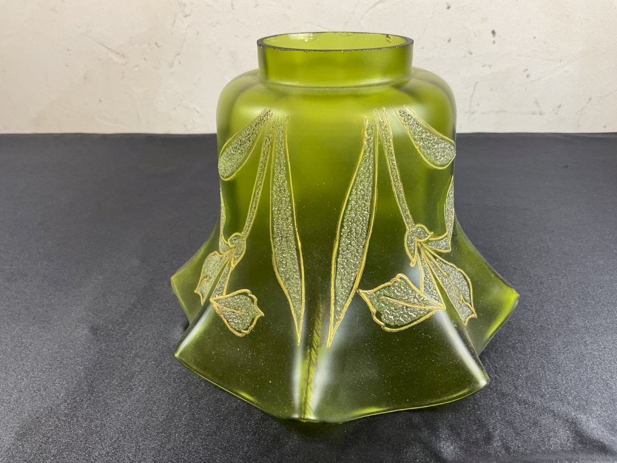 tulipe de lampe à pétrole décor dégagée a l acide Baccarat ,Saint Louis,Clichy…. Hauteur : 13,8 cm Diamètre : 19 cm Diamètre intérieur : 6,1 cm Type:Lampe à huile, Pétrole, Gaz Période:XIXème et avant Sous-type:Lampe de table Couleur dominante:Vert Matière:Cristal