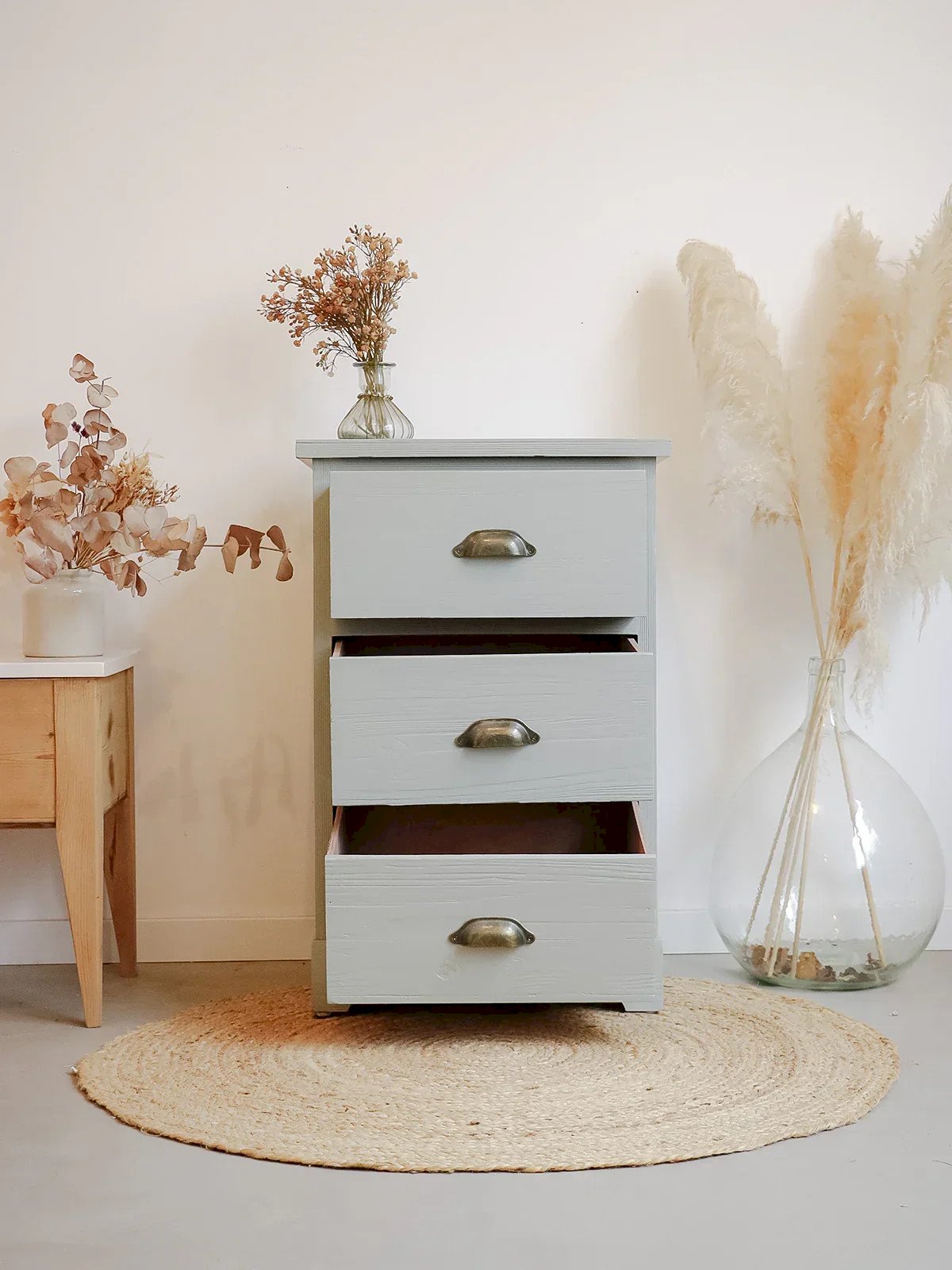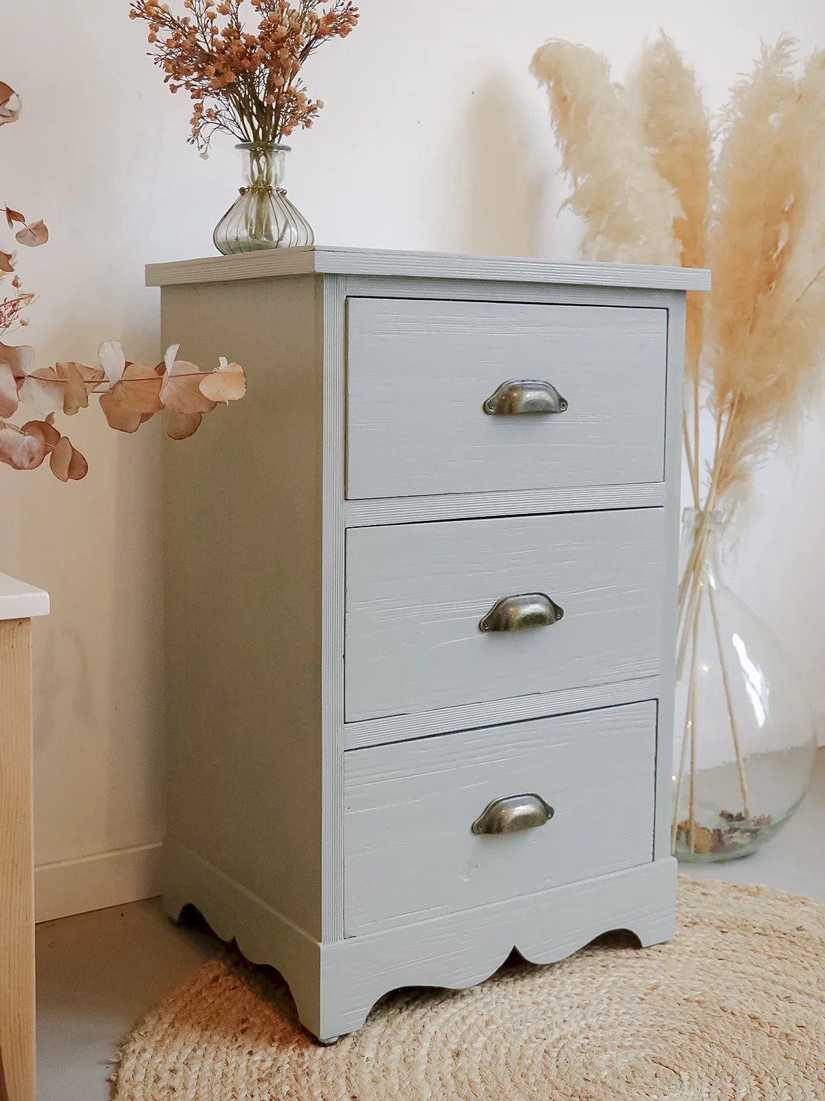 Apportez une touche de caractère avec ce chiffonnier trois tiroirs, rehaussé d'une peinture vert de gris signée Farrow & Ball et de poignées coquilles délicates. Sa silhouette étroite et ses tiroirs bien proportionnés offrent un rangement fonctionnel pour le linge, les petits objets ou l'entrée, sans encombrer l'espace. Le contraste entre la chaleur du bois et la teinte sourde crée une ambiance élégante et apaisante, parfaite pour une chambre ou un intérieur raffiné. Longueur : 45 cm Largeur : 35,5 cm Hauteur : 70,5 cm Hauteur tiroir : 17 cm État:Occasion: Objet ayant été utilisé. Objet présentant quelques marques d'usure superficielle, ...Occasion: Objet ayant été utilisé. Objet présentant quelques marques d'usure superficielle, entièrement opérationnel et fonctionnant correctement. Il peut s'agir d'un modèle de démonstration ou d'un objet retourné en magasin après une courte période d'utilisation. les éventuelles imperfections. Marque:Debongout Type:Produit chiné Matériau:Bois Personnalisé:Semainiers Style:Campagne