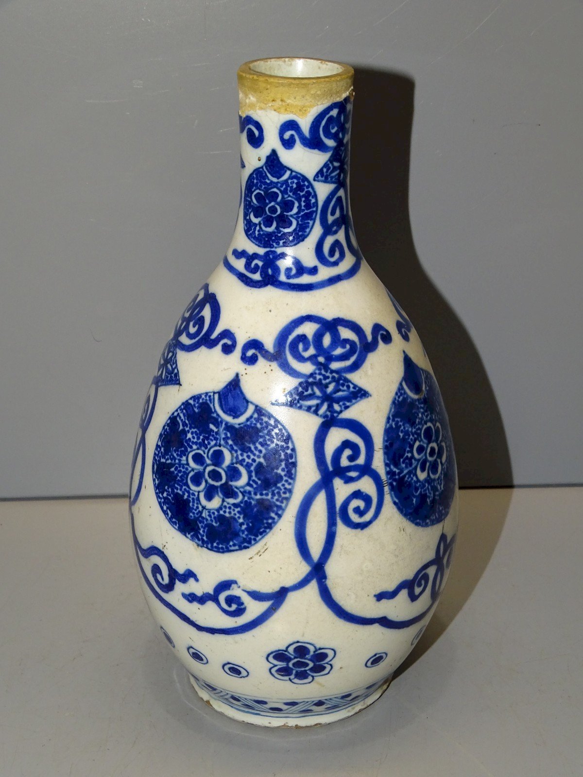 Vase ancien blanc/bleu Delft? signé GK - ancien vase forme bouteille en faïence de Delft je pense d’époque 17ᵉ / 18ᵉ siècle, provenant de la célèbre fabrique des Trois Tonneaux de Cendre (“De Drie Astonnetjes”) à Delft, aux Pays-Bas. ( sous réserve ) - avec usures au col et au bas - petites traces noires sur l'ensemble (voir photos ) jus de trouvailles, sorti de grenier, en état d'usage - Réf. 1V230712/615 - Hauteur 19,8 cm - Diamètre col 3,1 cm - Diamètre max 10 cm - Diamètre bas 6,8 cm - Poids 0,383 kg Pour me contacter mon adresse mail : EXPEDITION POSSIBLE EN MONDIAL RELAY ou COLISSIMO sur demande TRES BON EMBALLAGE GARANTI MERCI de BIEN REGARDER TOUTES les PHOTOS car ELLES FONT PARTIE INTEGRANTE de la DESCRIPTION et PERMETTENT de VOIR l'OBJET AU MIEUX avec SES PETITS DEFAUTS EVENTUELS -