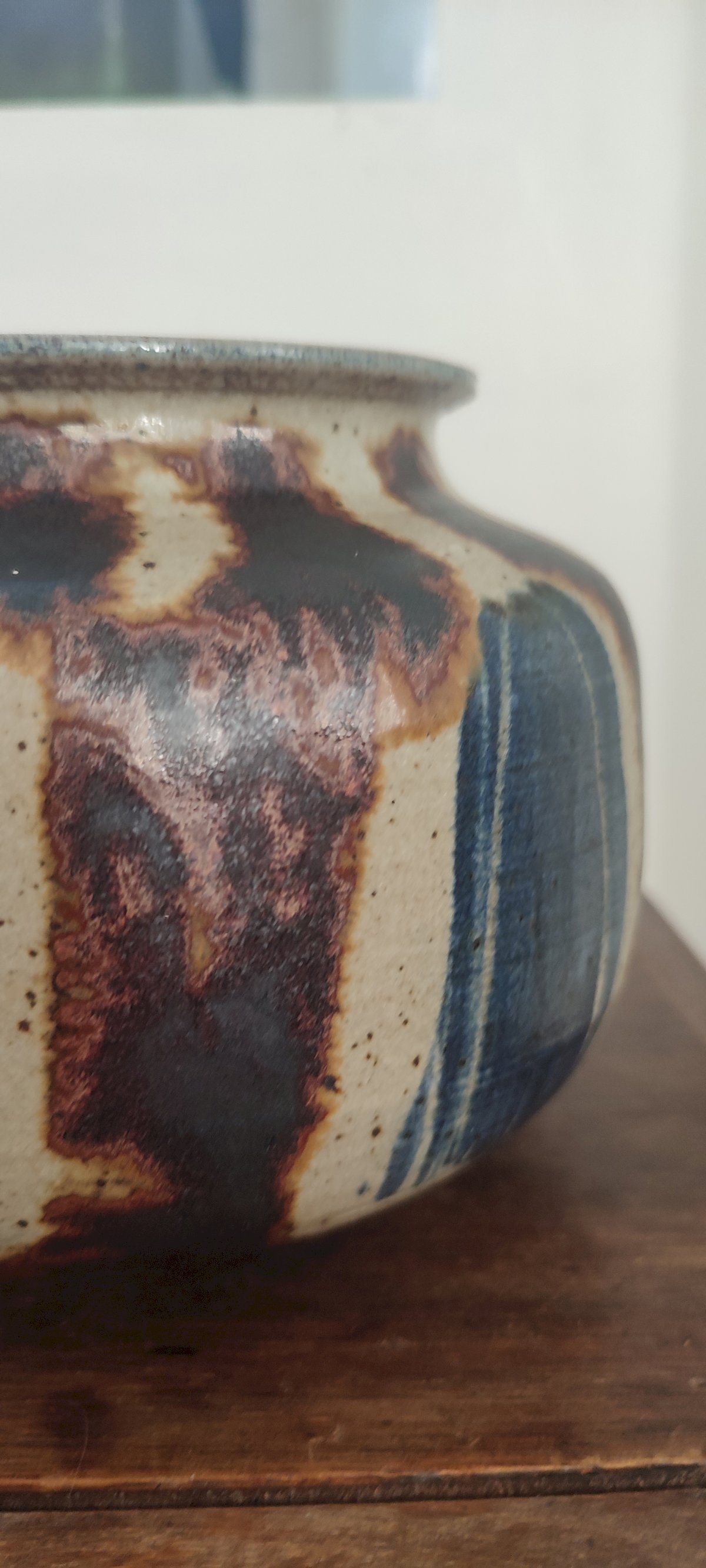 Belle pièce d’artisanat en grès pyrité tourné, au décor graphique d'oxydes brun et bleu cobalt (technique de réserve à la cire). Forme boule et col légèrement évasé.