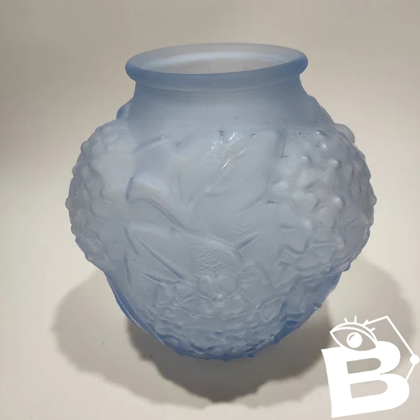 Vase boule en verre dépoli bleu, 1930, à décor de fleurs et feuillages en relief