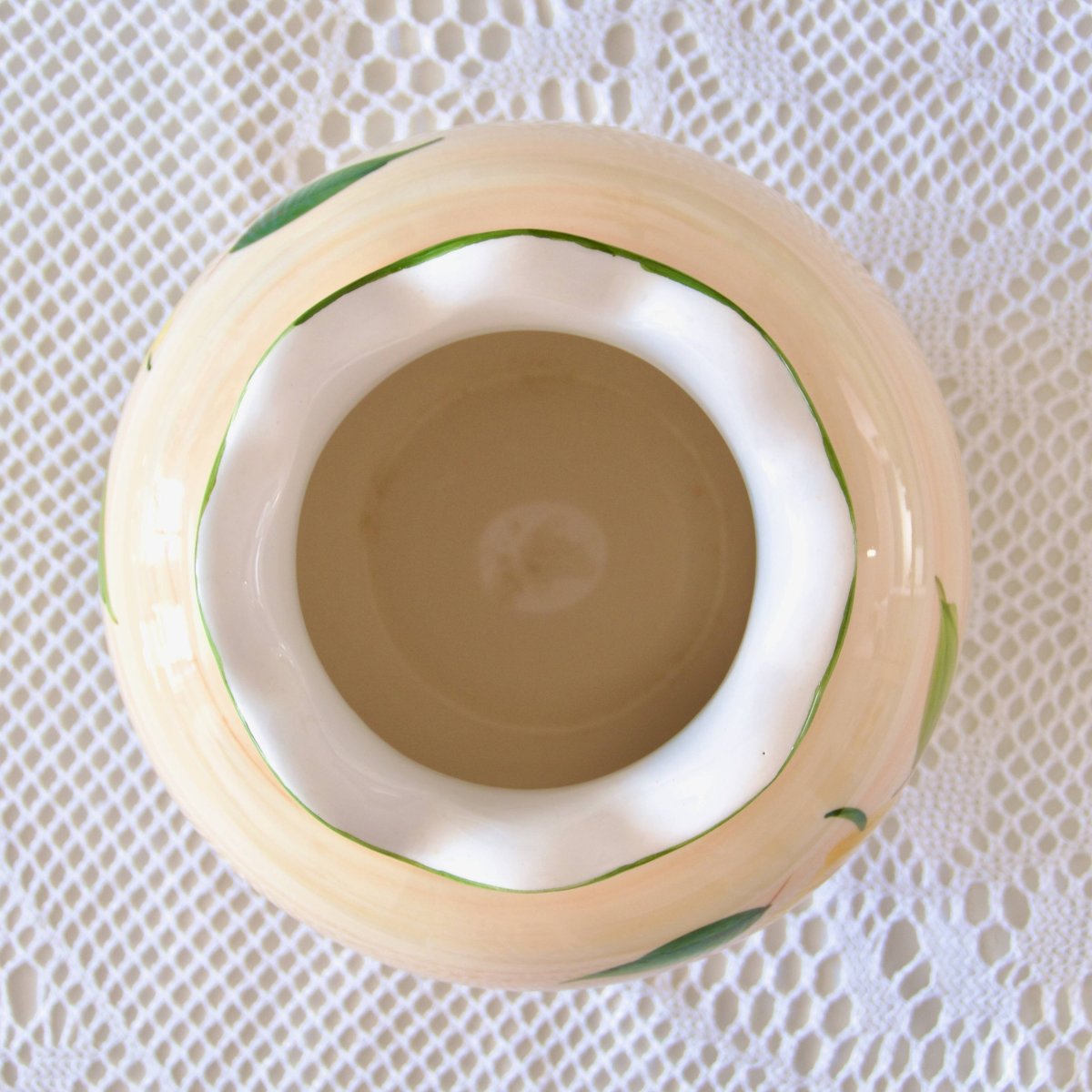 Grand vase boule vintage, corolle échancrée drapée.Joli décor entièrement peint à la main d’un fruit (citron / poire ou coing) sur fond à la douce couleur abricot.Liseré vert.En très bon état.? 20 X 22 cm.✨ envoi très soigné.✨ nous avons d'autres annonces en ligne, n'hésitez pas à jeter un coup d'oeil ! 1, 1 kg.07/24.