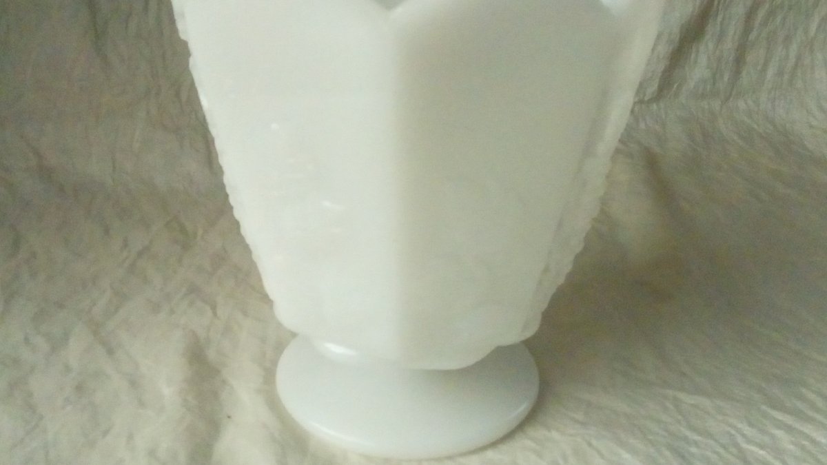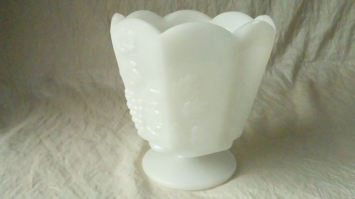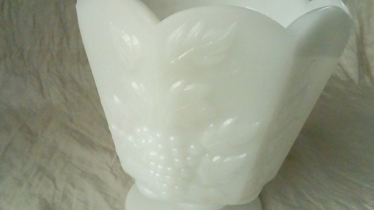 TRES BEAU VASE CACHE POT EN OPALINE CLEVELAND U.S.A DECOR GRAPPE DE RAISIN HAUTEUR 13 cm DIAMETRE 11.50 cm EN BON ETAT Pays d'origine:États-Unis